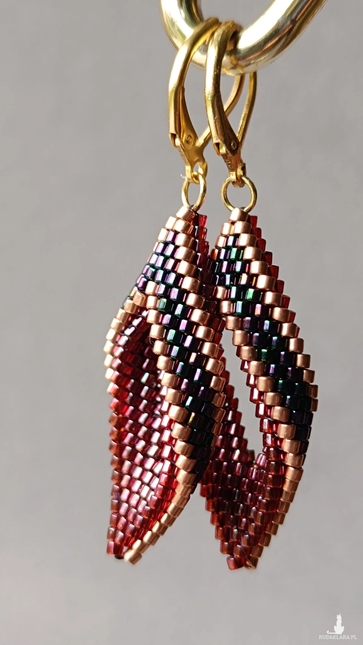 Wewnętrzna warstwa kolczyków została uszyta z koralików w głębokim odcieniu czerwonego wina. To jak ukryta tajemnica, dodająca tym kolczykom głębi i pasji.