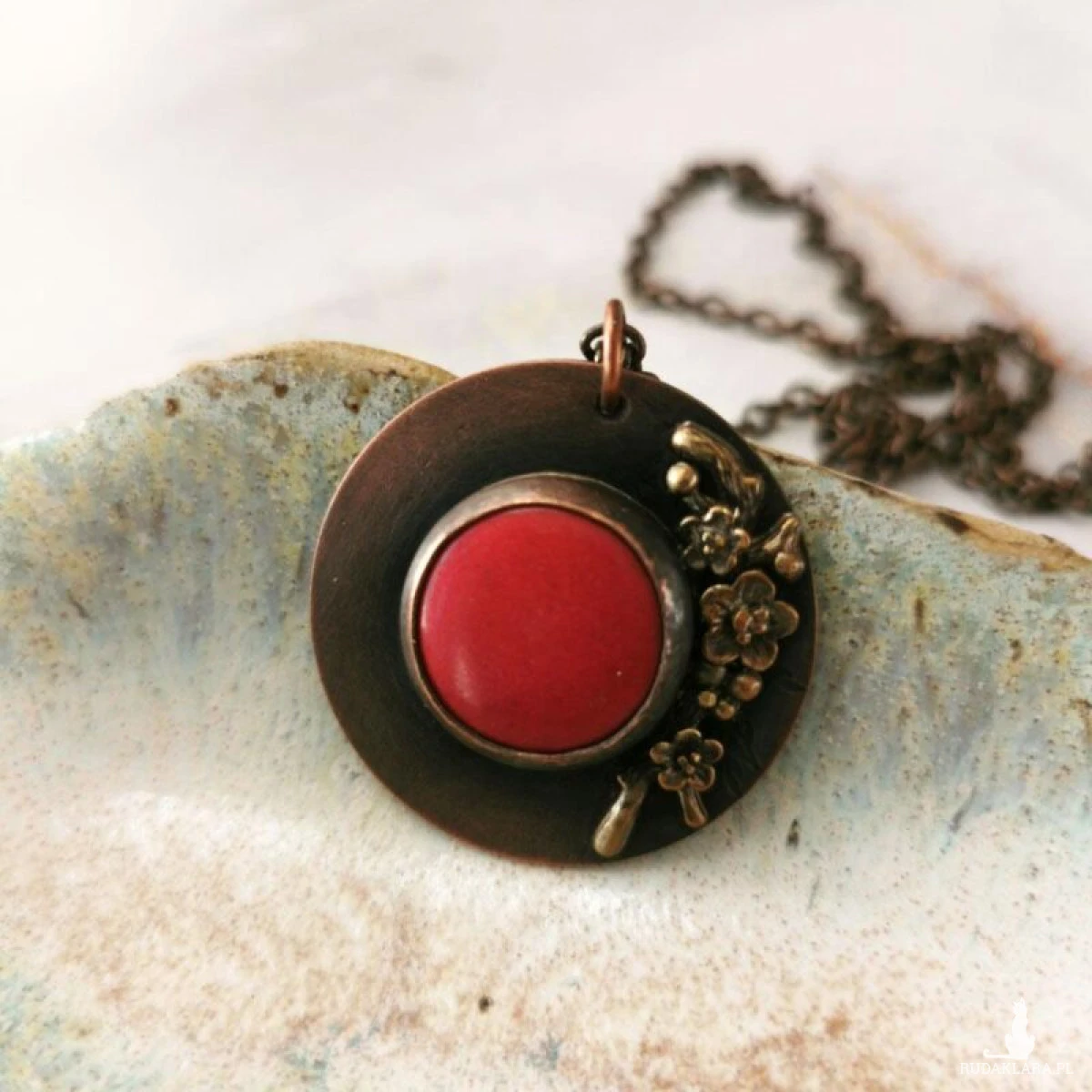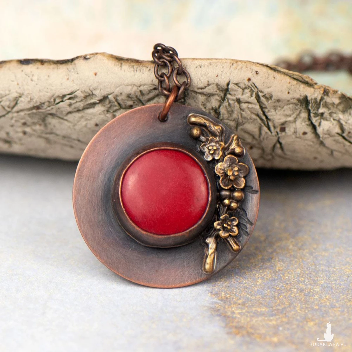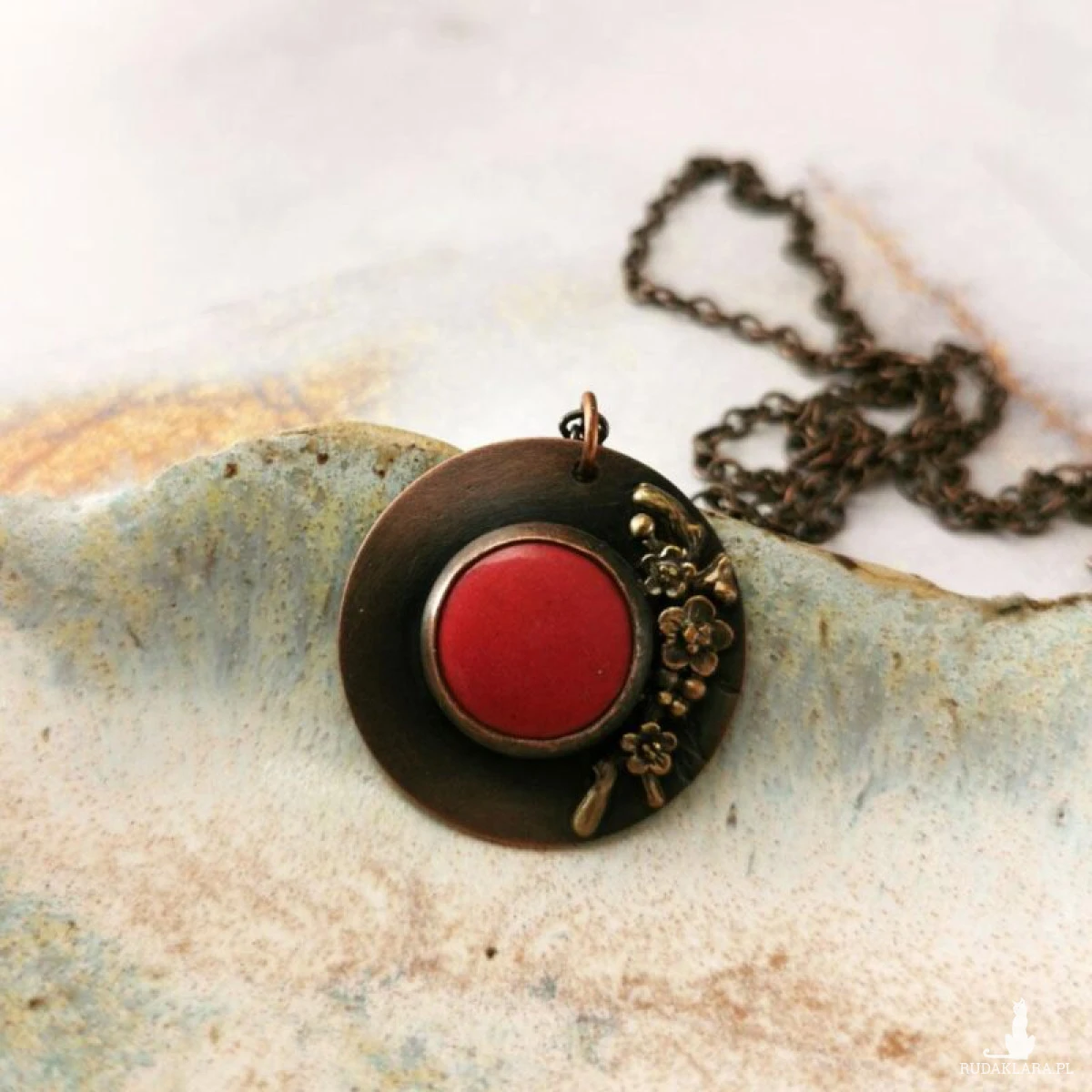 Wyjątkowy, ręcznie wykonany naszyjnik, którego centralną część stanowi czerwony koral otoczony motywem roślinnym. Elementy ozdobne w kształcie kwiatów zostały wykonane z mosiądzu. Rekonstruowany koral osadzony w środkowej części naszyjnika ma średnicę 20 milimetrów. Postawa i oprawa kamienia wykonane są z miedzi, która w procesie tworzenia była oksydowana i pokryta warstwą ochronną.