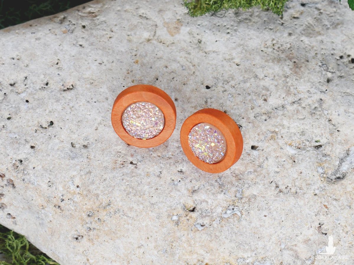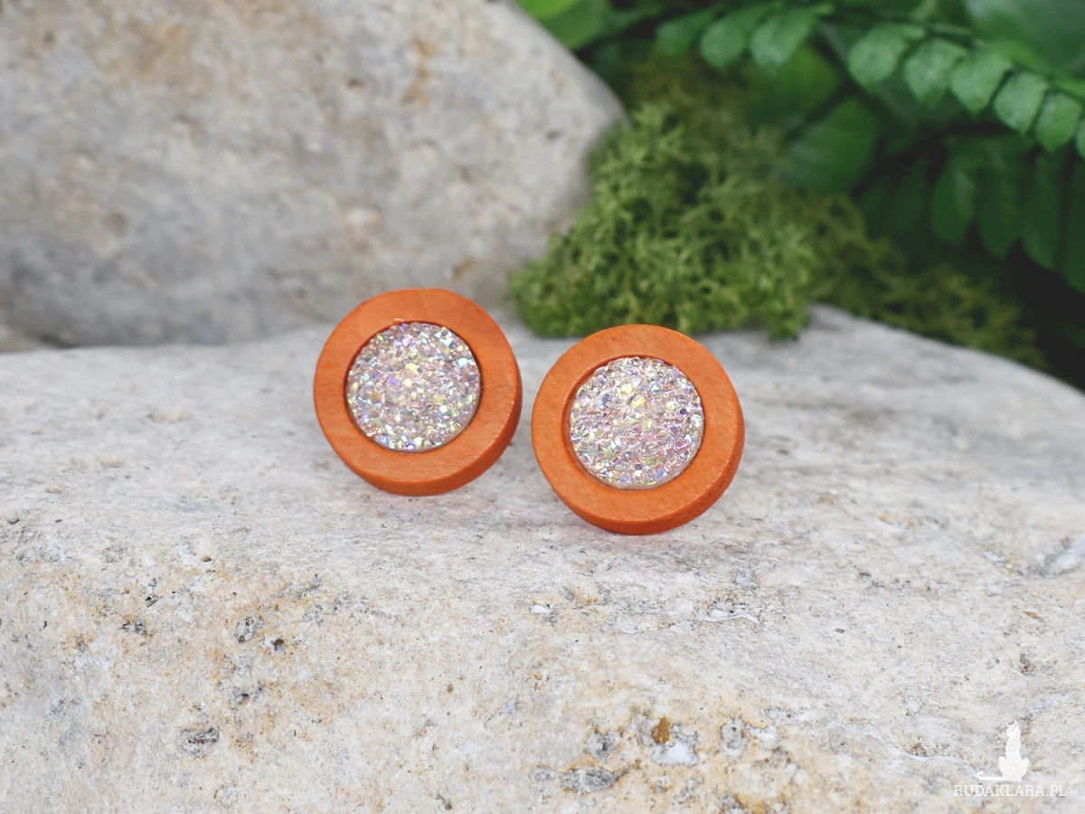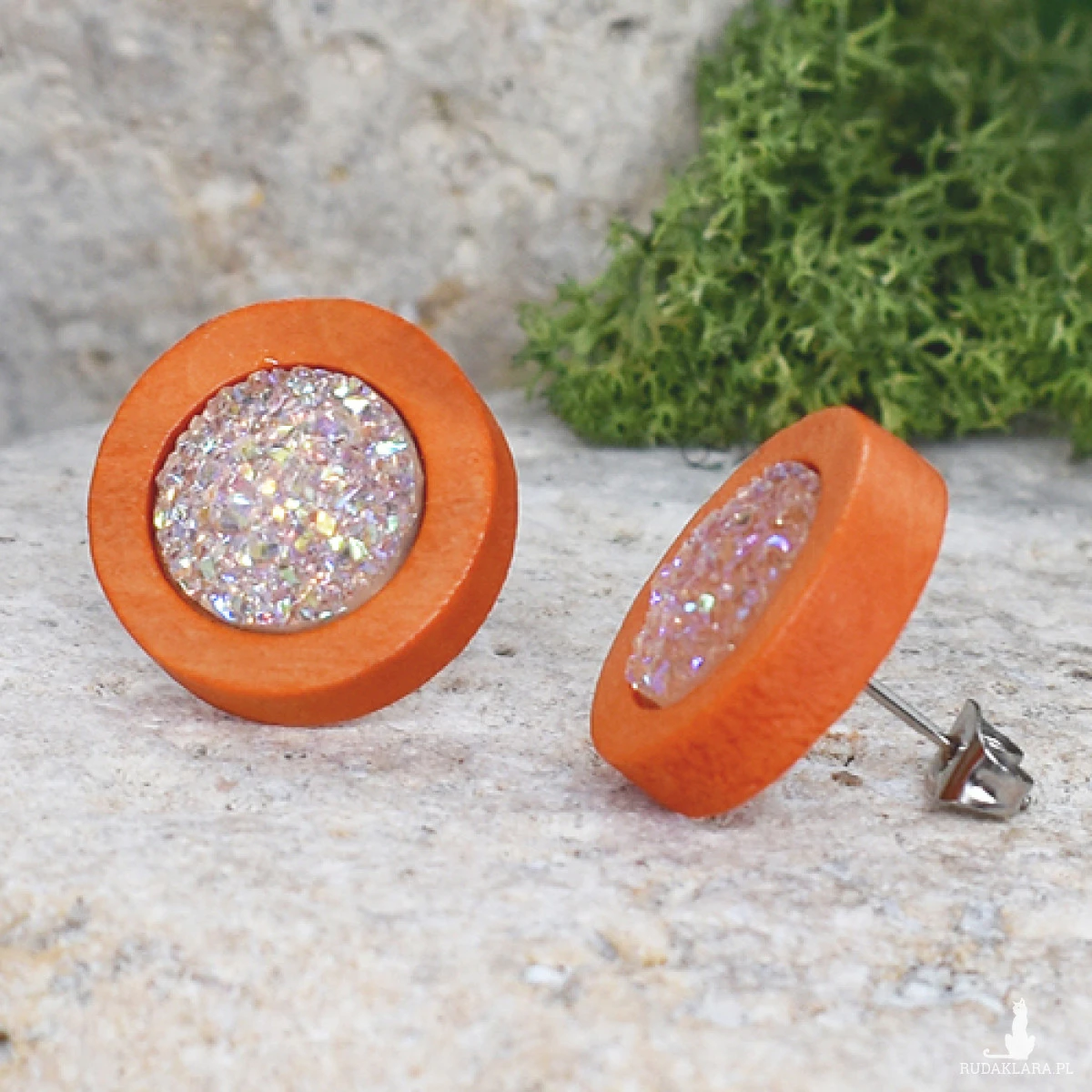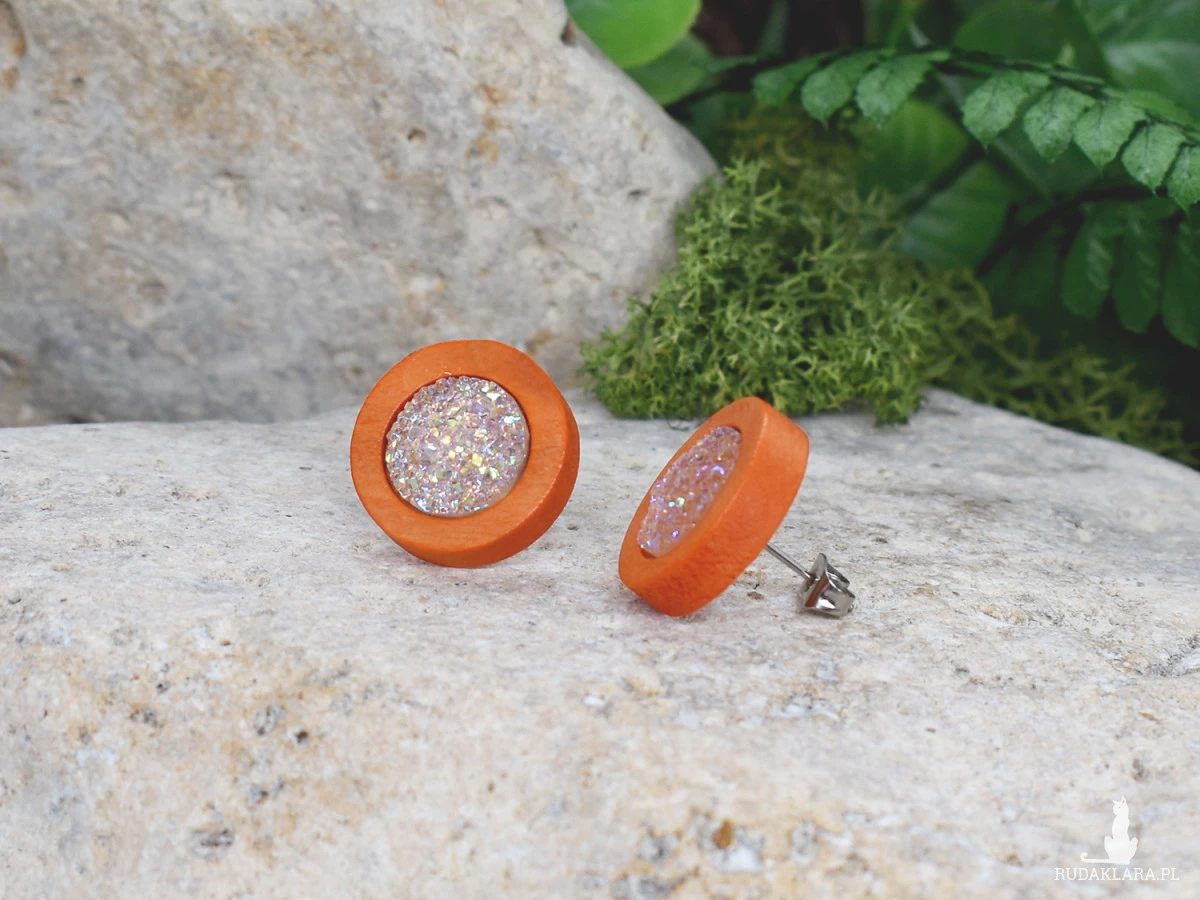 Ręcznie wykonane kolczyki z drewna barwionego na pomarańczowo ozdobione druzami. Idealne do letnich kolorowych stylizacji boho / hippie.