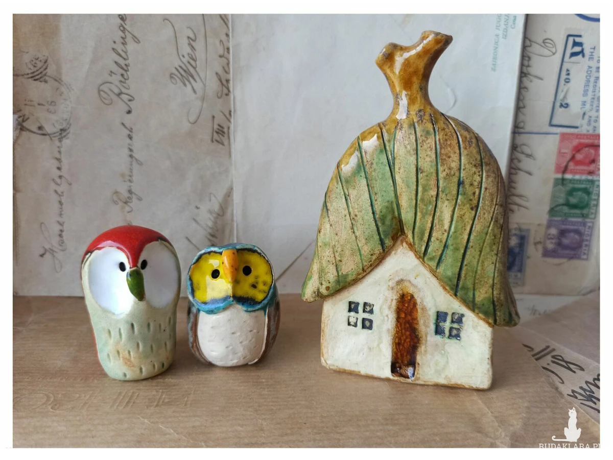 Domek ceramiczny z listkiem na dachu o wymiarach ok 7,5 cm x 11 cm oraz sówki o wymiarach 2,5 cm x 5 cm oraz 3 cm x 4 cm wykonane z gliny szamotowej wypalone na biskwit, a następnie szkliwione w temp ok 260 stopni C. Dostępne rónież osobno. Polecam serdecznie.