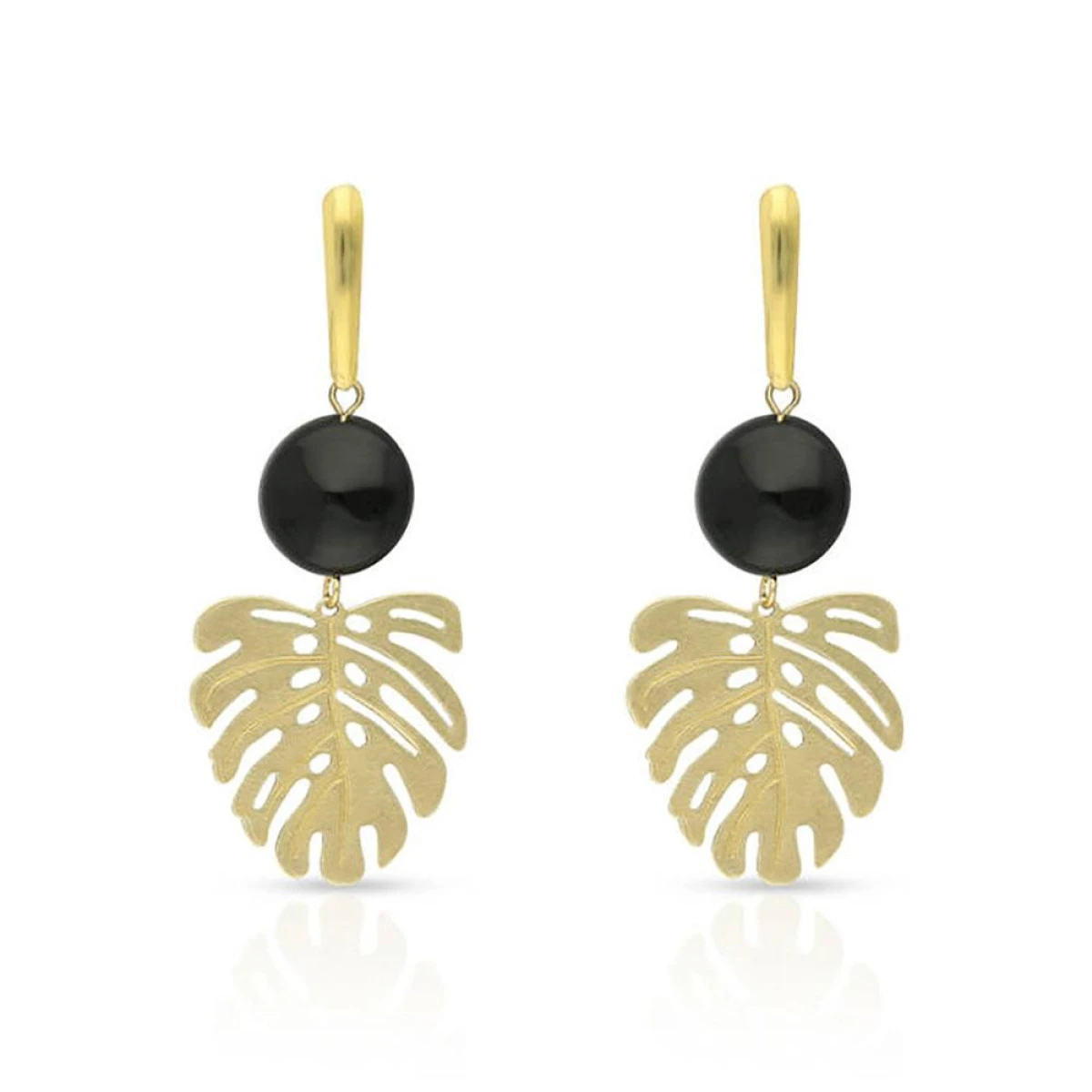 Kolczyki z onyksem i zawieszkami w kształcie liści monstery to nietuzinkowa propozycja dla fanek roślin, złota i czerni. Biżuteria została ręcznie wykonana z onyksu o średnicy 12 milimetrów, listków z mosiądzu w kolorze złota oraz pozłacanych elementów wykończeniowych. Połączenie nowoczesnych kształtów z ponadczasowymi kolorami daje wyjątkowy efekt wizualny. Kolczyki sprawdzą się jako dodatek zarówno do stylizacji dziennych, jak i wieczorowych. Połączenie modnego motywu tropikalnych liści z kolorem luksusu i kamieniami naturalnymi sprawia, że prezentują się znakomicie. Kolczyki zostały wykończone biglami z pozłacanej stali chirurgicznej.