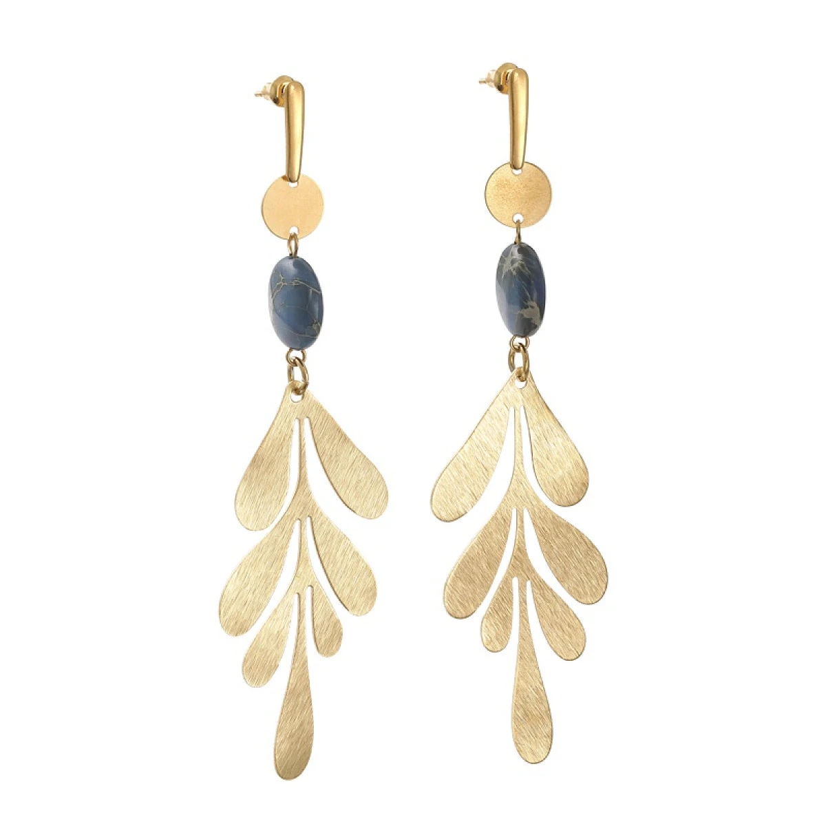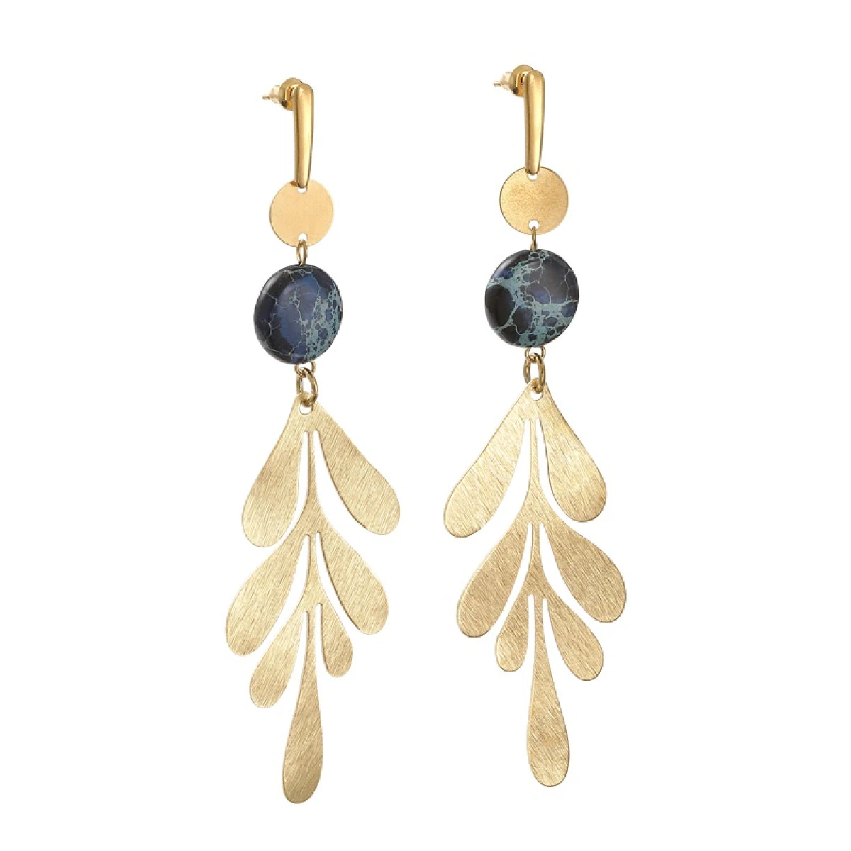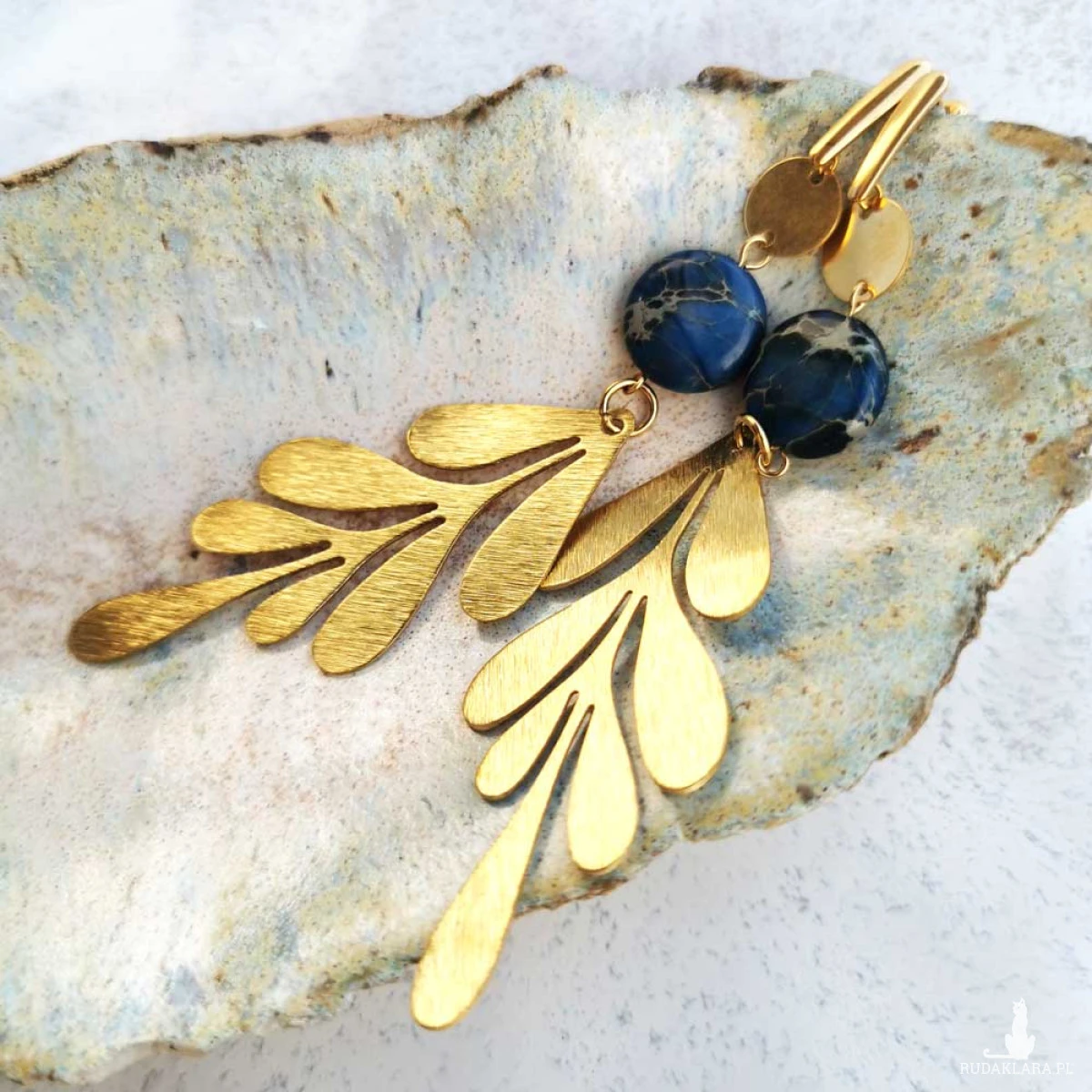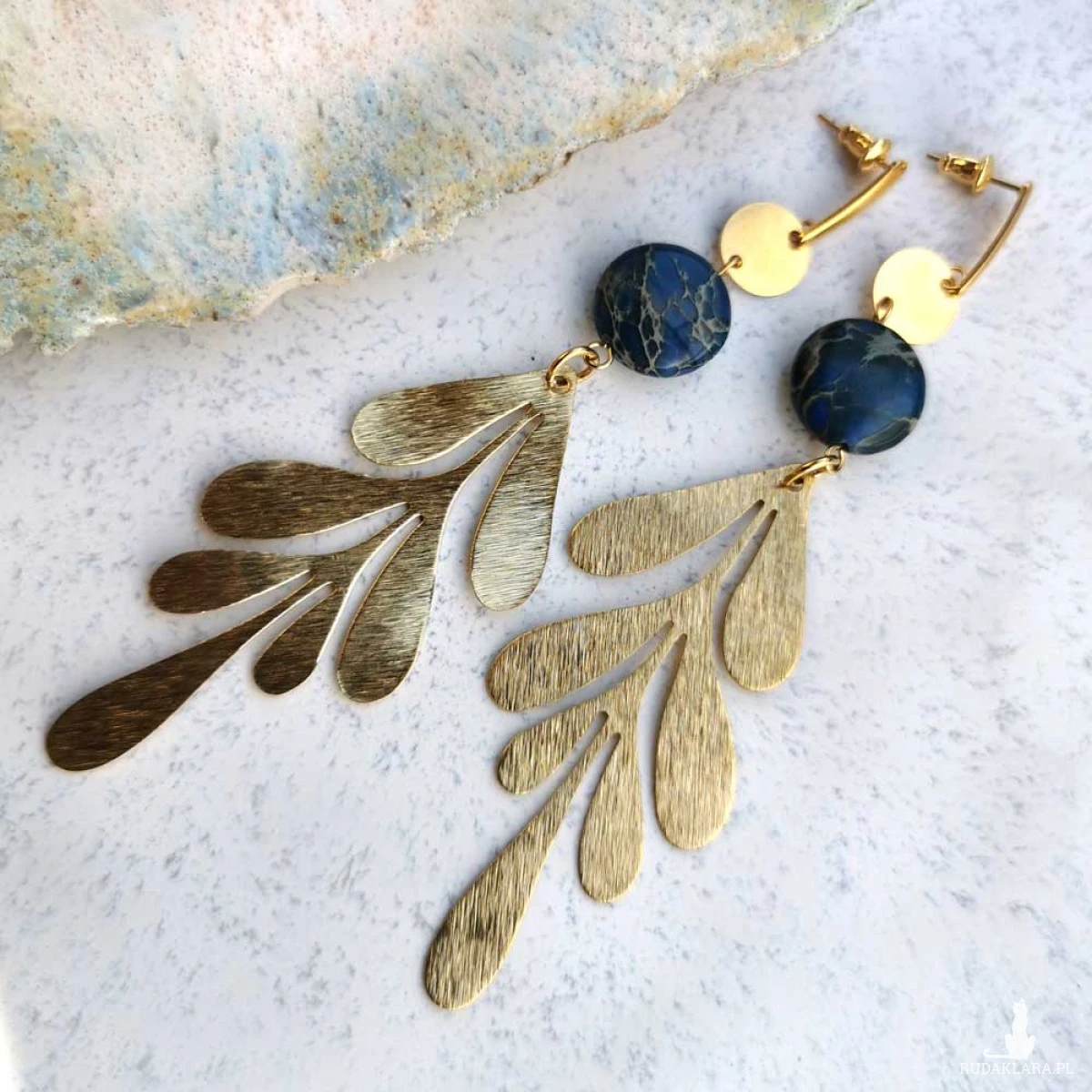 Minimalistyczne, wiszące kolczyki będą stanowiły idealny dodatek do stylizacji wieczorowych ze względu na swoją dyskretną elegancję i oryginalną formę. Wykończone zostały okrągłymi, błękitnymi jaspisami cesarskimi, których odcień podkreśla złota barwa metalu. Kolczyki kształtem nawiązują do liściastych gałązek. Wykonane zostały z najwyższą dbałością o szczegóły z mosiądzu zabezpieczonego warstwą ochronną. Na zdjęciu przedstawiony jest wzór, otrzymasz kolczyki z kamieniem z tego samego sznura, który może się nieznacznie różnić odcieniem i żyłkowaniem, gdyż nie ma w naturze dwóch takich samych kamieni.