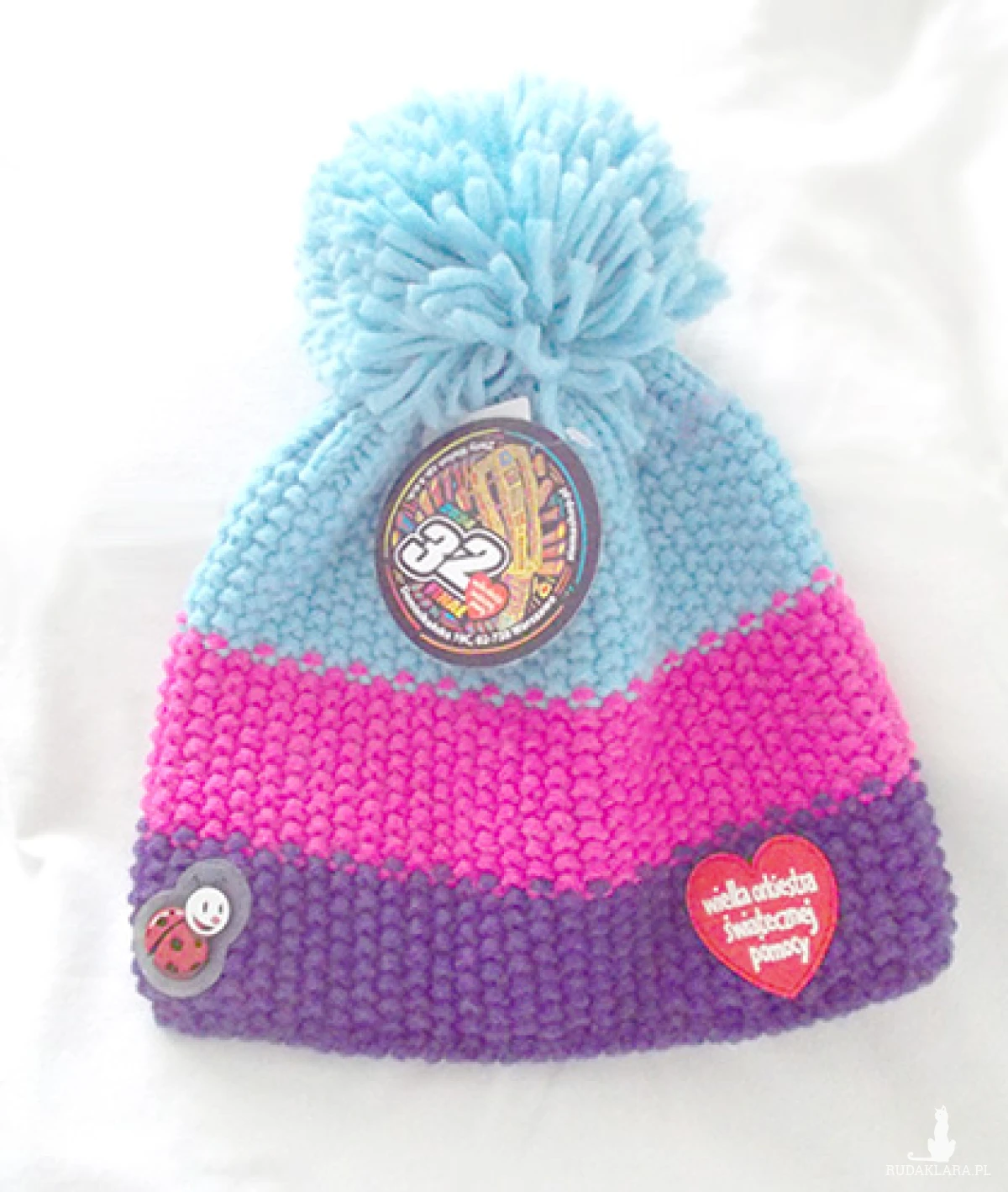 Nowa czapka dla dziecka. Czapeczka z pomponem w kolorowe pasy: fioletowy, różowy, błękitny. Czapka Wośp 32 rok 2024 w rozmiarze dziecięcym. Materiał: 50 % wełna z merynosów, 50 % akryl. Czapka ma czoło podszyte polarem- chroni uszy. Utrzymuje temperaturę ciała, a także i odprowadza wilgoć na zewnątrz.