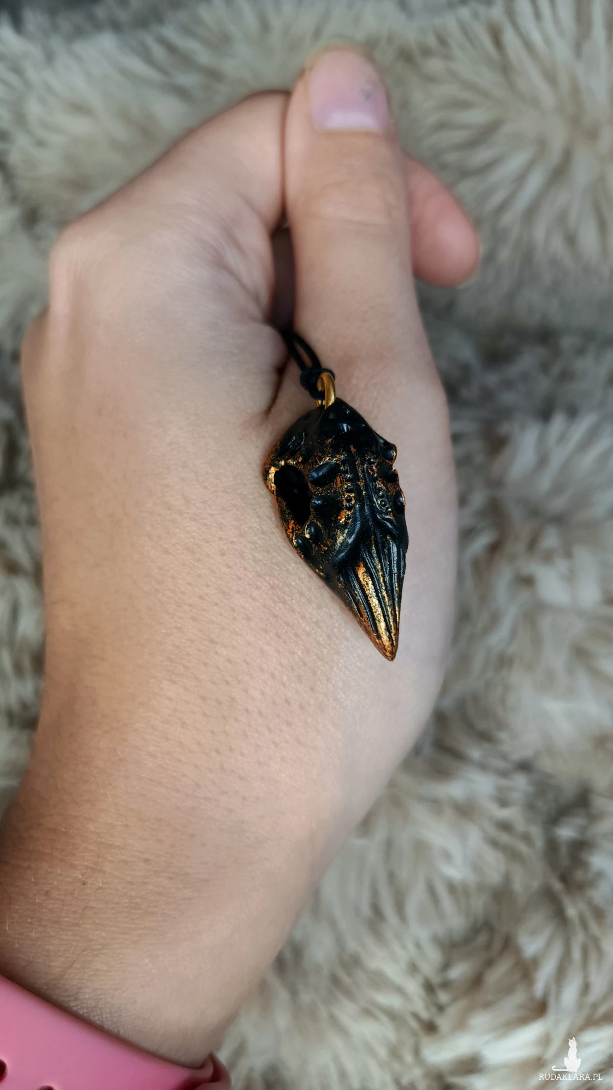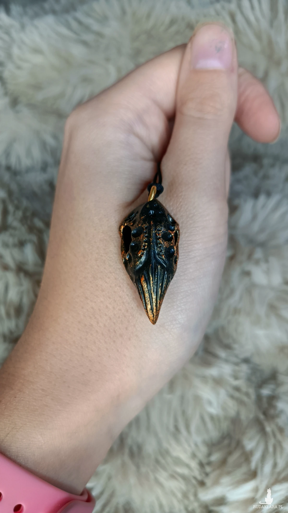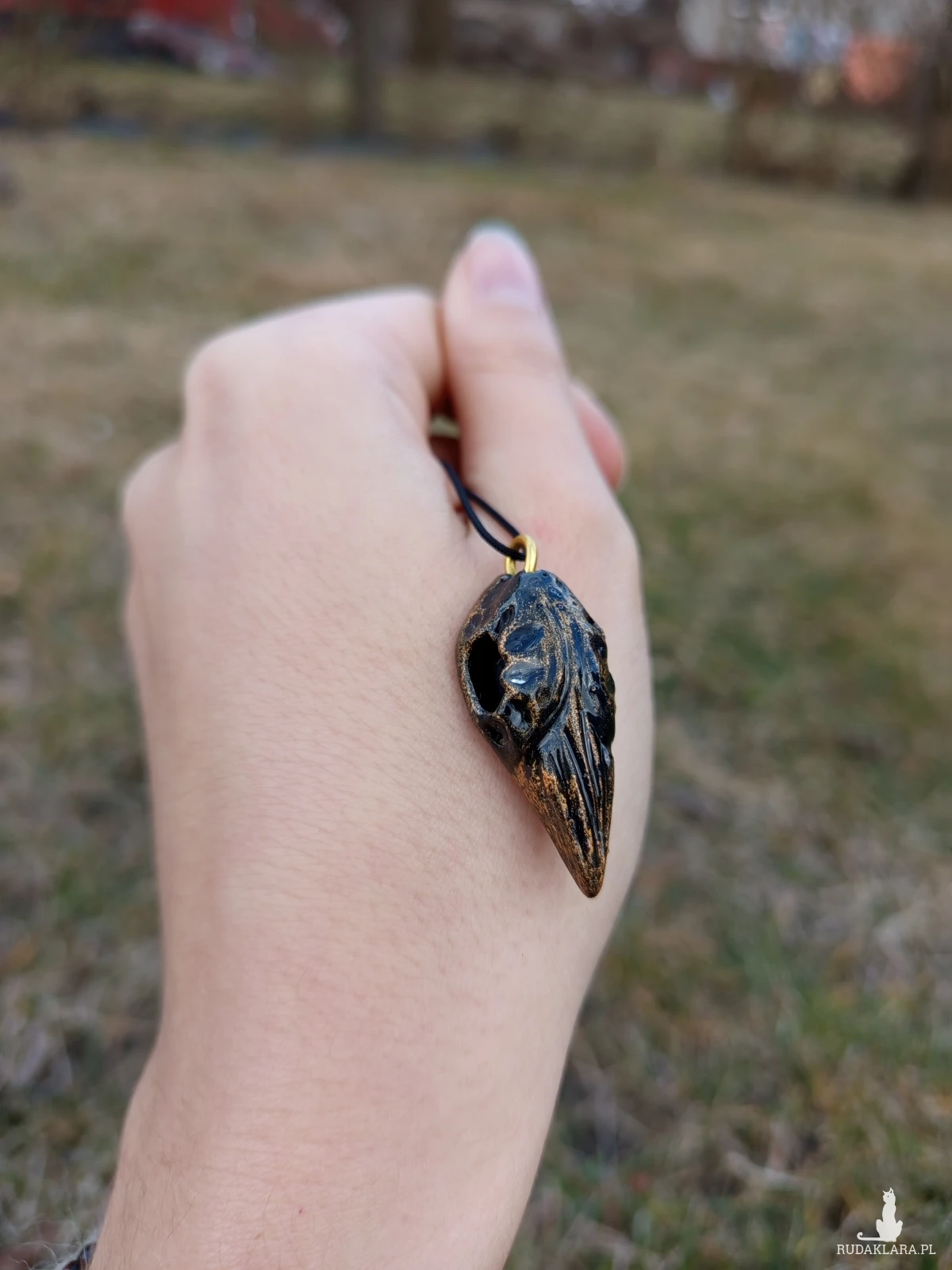 Ręcznie wykonany naszyjnik w kształcie czaszki ptaka.