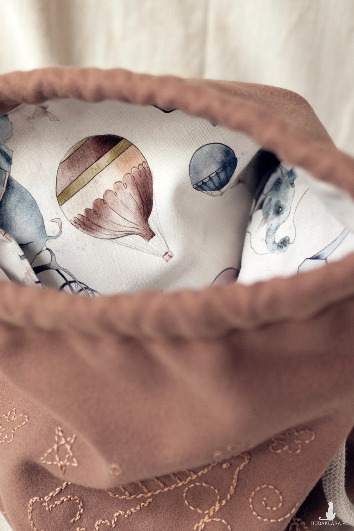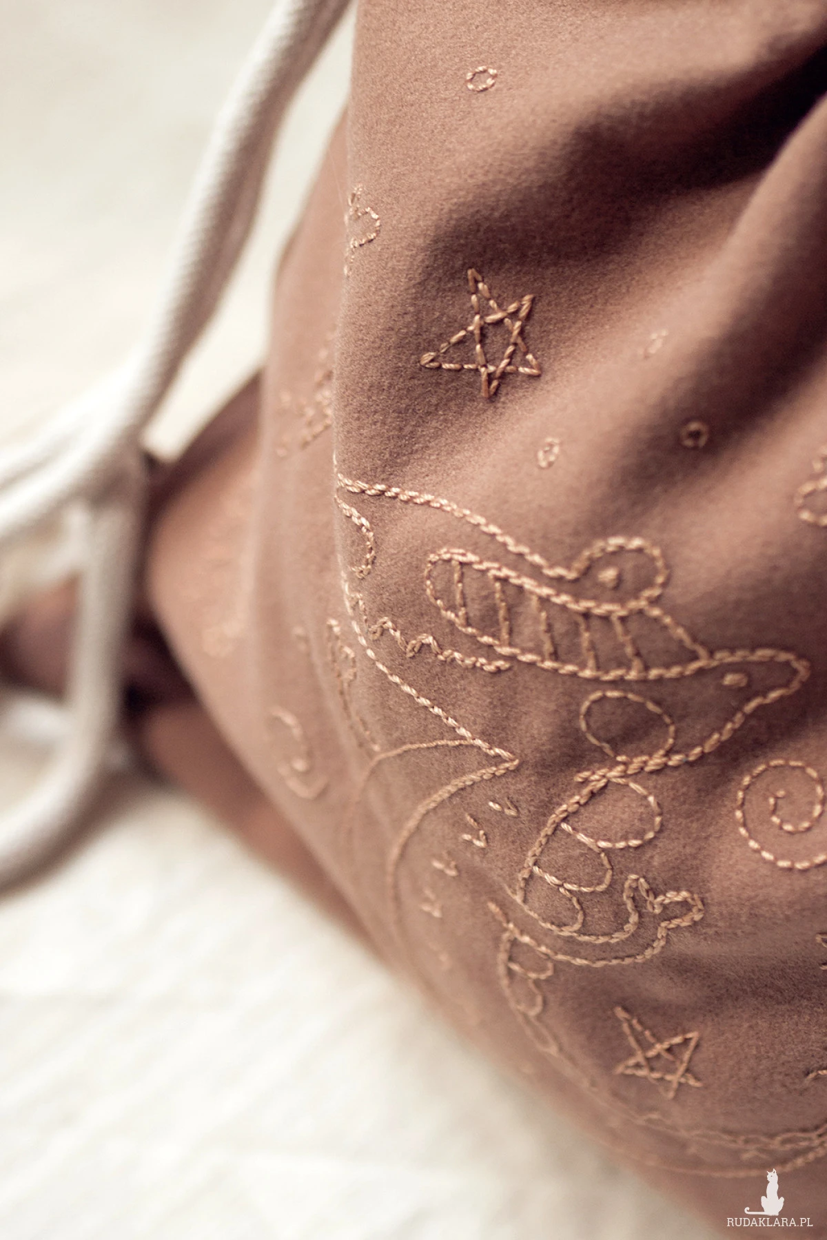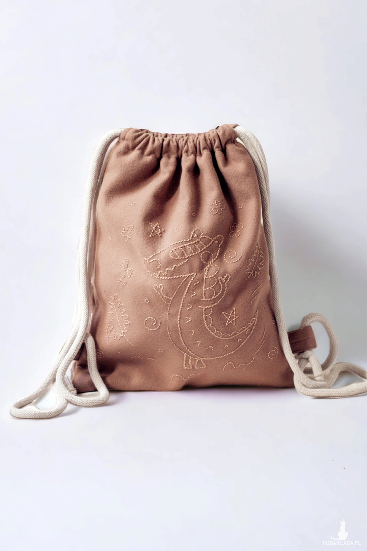 Dziecięcy plecaczek worek wykonany z flauszu w kolorze brązowym z ręcznie haftowanym wzorem.