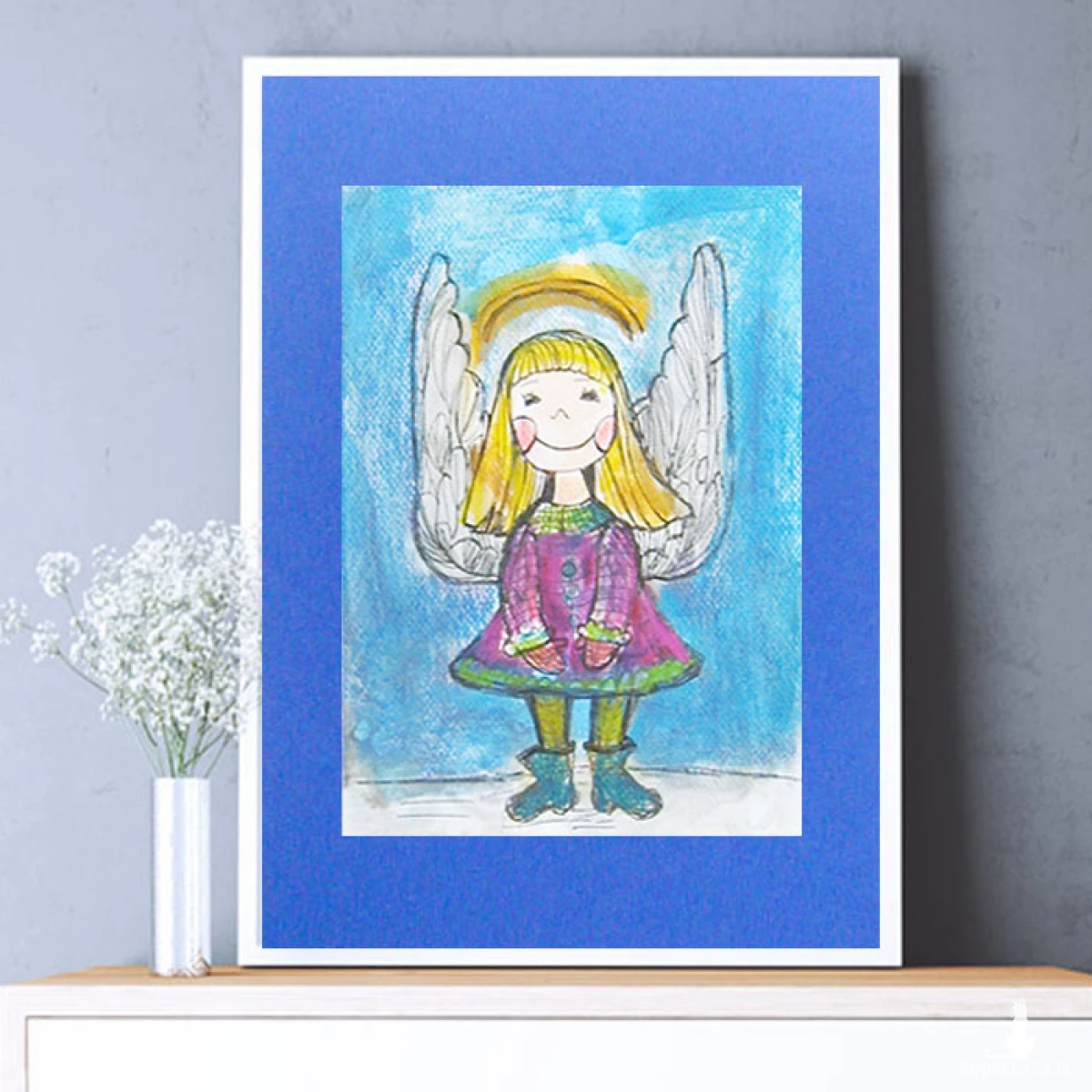 Ręcznie malowana akwarela z małym aniołkiem. Szkic na granatowym kartoniku A4 (21x30 cm). Rysunek do pokoju dziewczynki lub nastolatki, jadalni, sypialni, przedpokoju, salonu, kuchni itp. Pomysł na prezent.