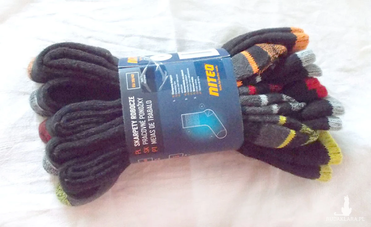 Bardzo fajne, robocze skarpetki, rozmiar 39-42, skład: poliester, bawełna, elastan. Wzmocnione na piętach, elastyczny ściągacz, warstwa frotte.. Marka 'Niteo". Komplet 5 par w opakowaniu.
