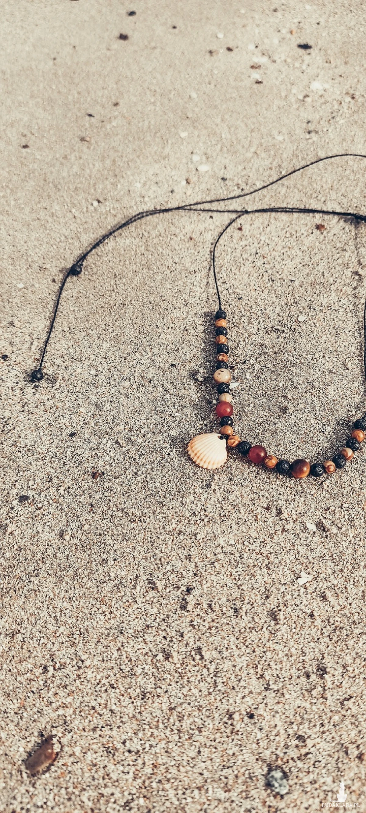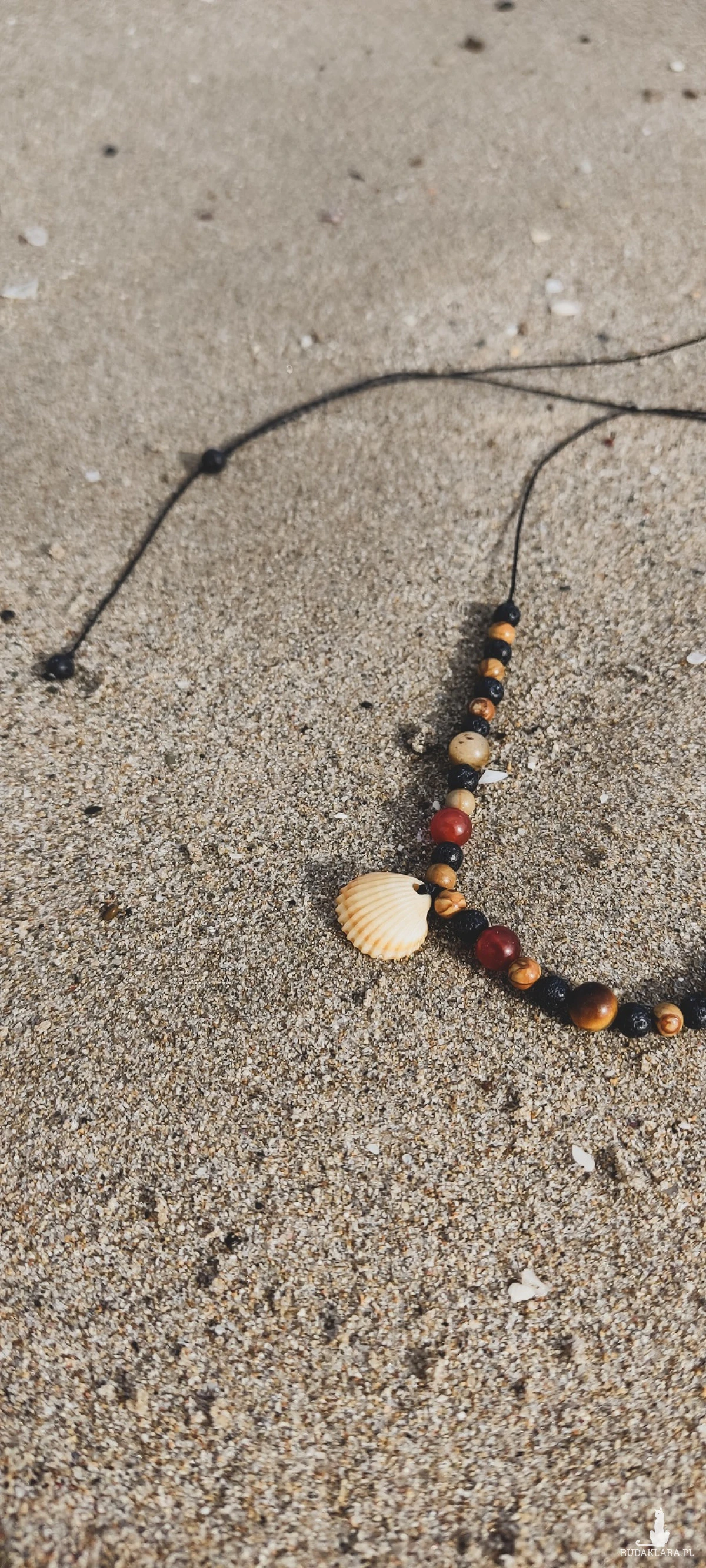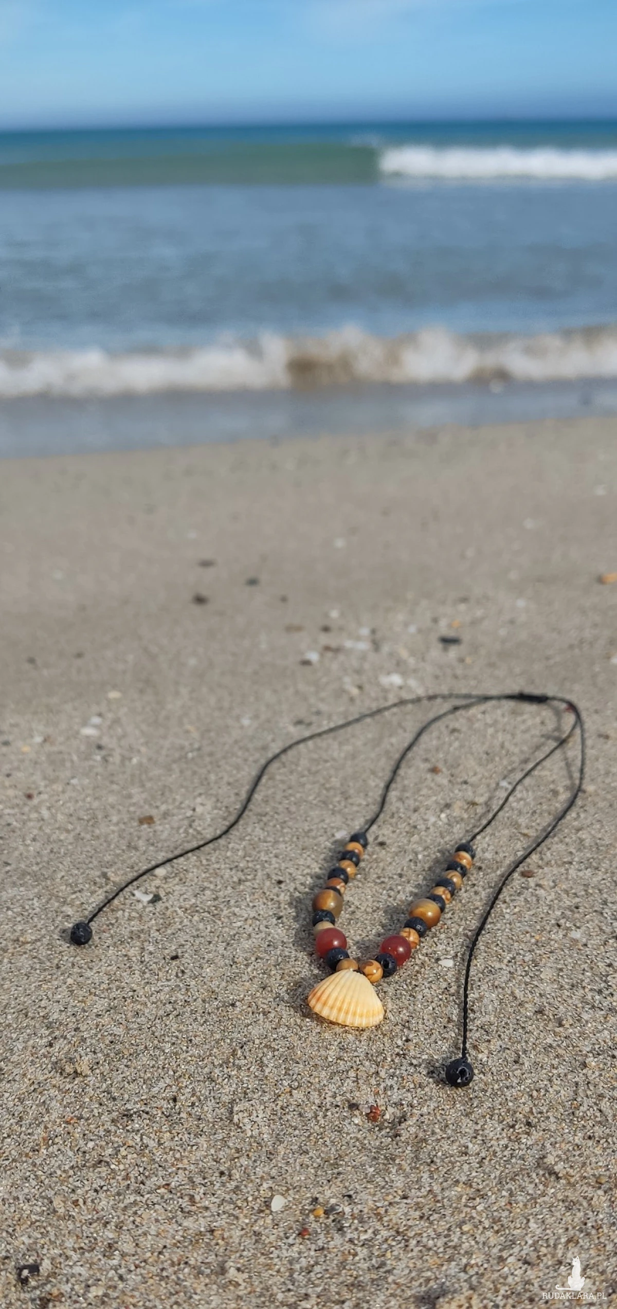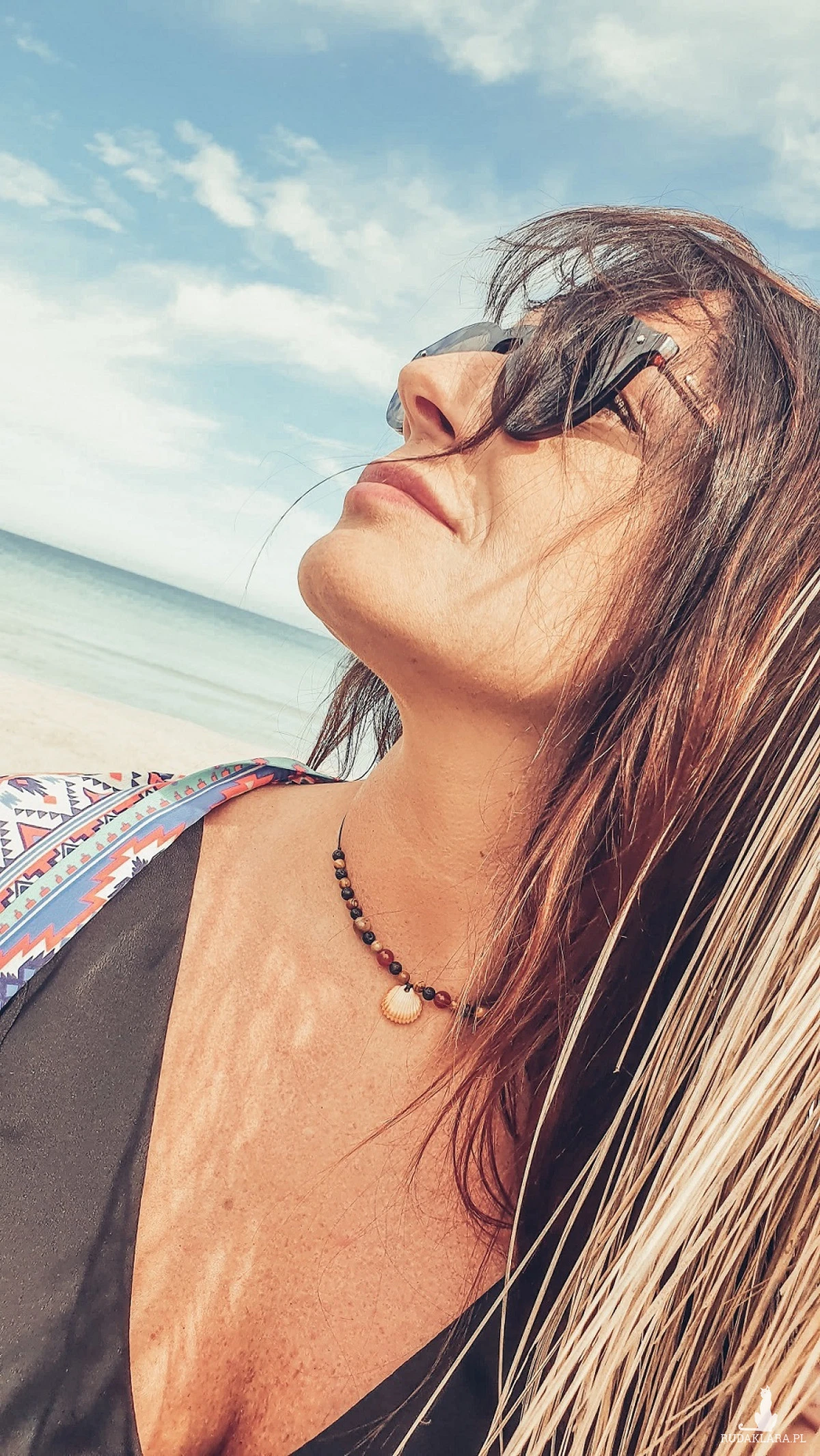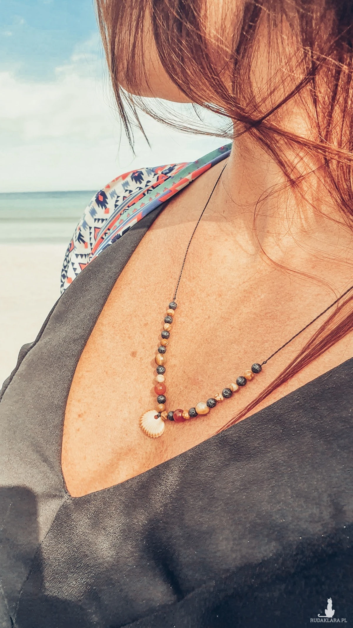 Całości dopełniają koraliki stworzone z naturalnej, bardzo drobnej, czarnej lawy, karneolu, skamieniałego drewna oraz tygrysiego, czy bawolego oka. Można kąpać się w tej ozdobie.