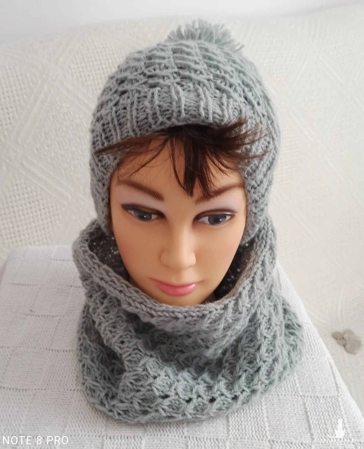 Komplet czapka z pomponem i komin wykonany handmade z 100% akrylu w kolorze jasnej szarości. Kolor siwy modny w tym sezonie. Oddycha i doskonale pochłania wilgoć, dzięki czemu odzież z