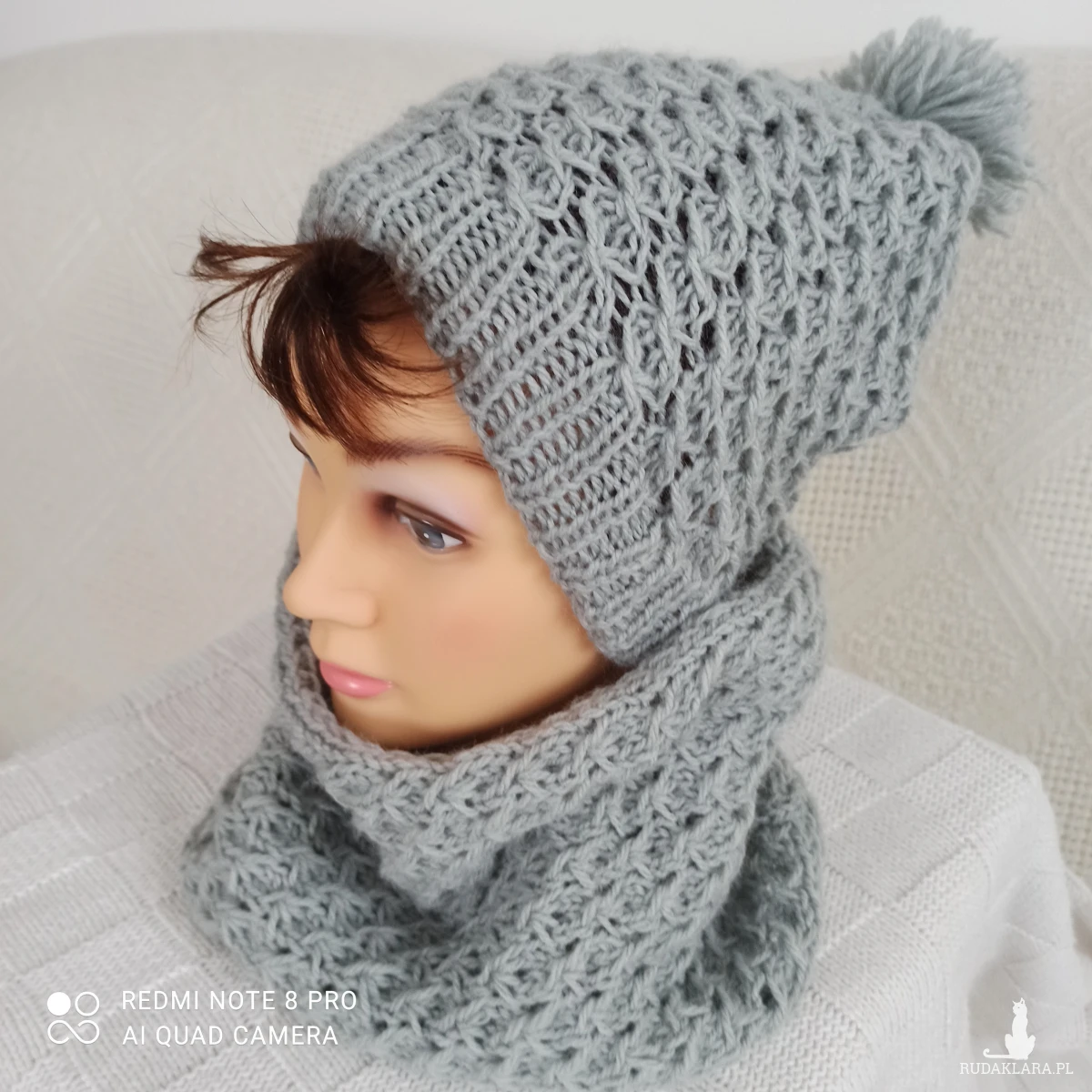 Komin zakładany przez głowę, można nosić po spodem jak i na wierzchu np. płaszcza, ładnie układa się przy szyi. Komplet średniej grubości.