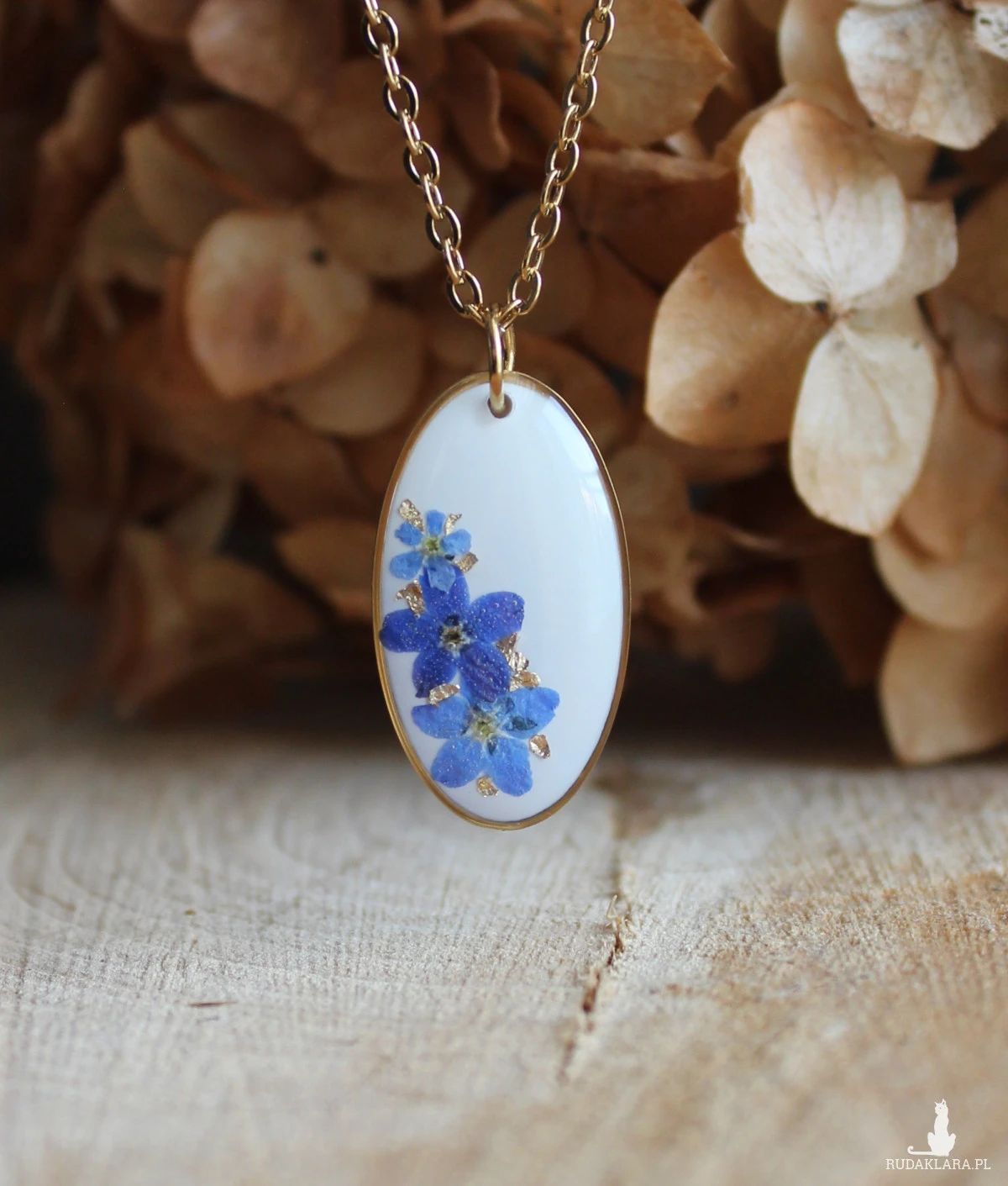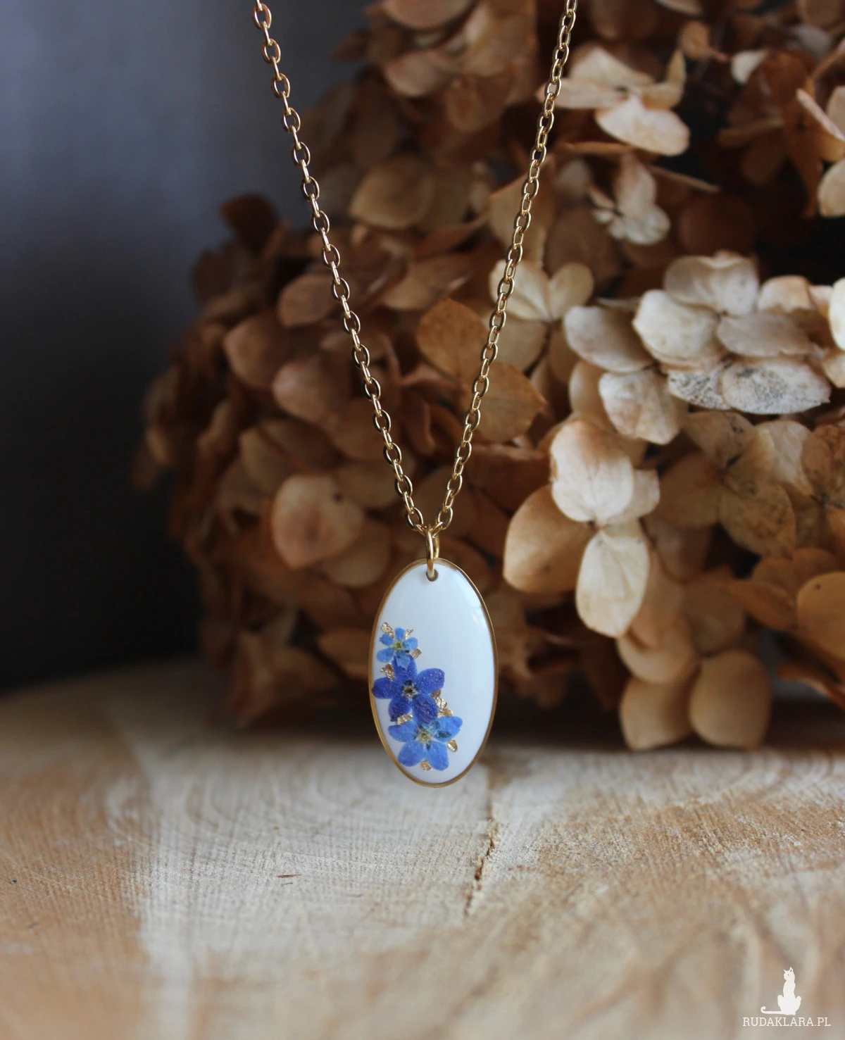 Oferuję Państwu unikalną biżuterię. Zawieszka jest wykonana z suszonych kwiatów i żywicy epoksydowej. Biżuteria jest wspaniałym i oryginalnym prezentem na lata.