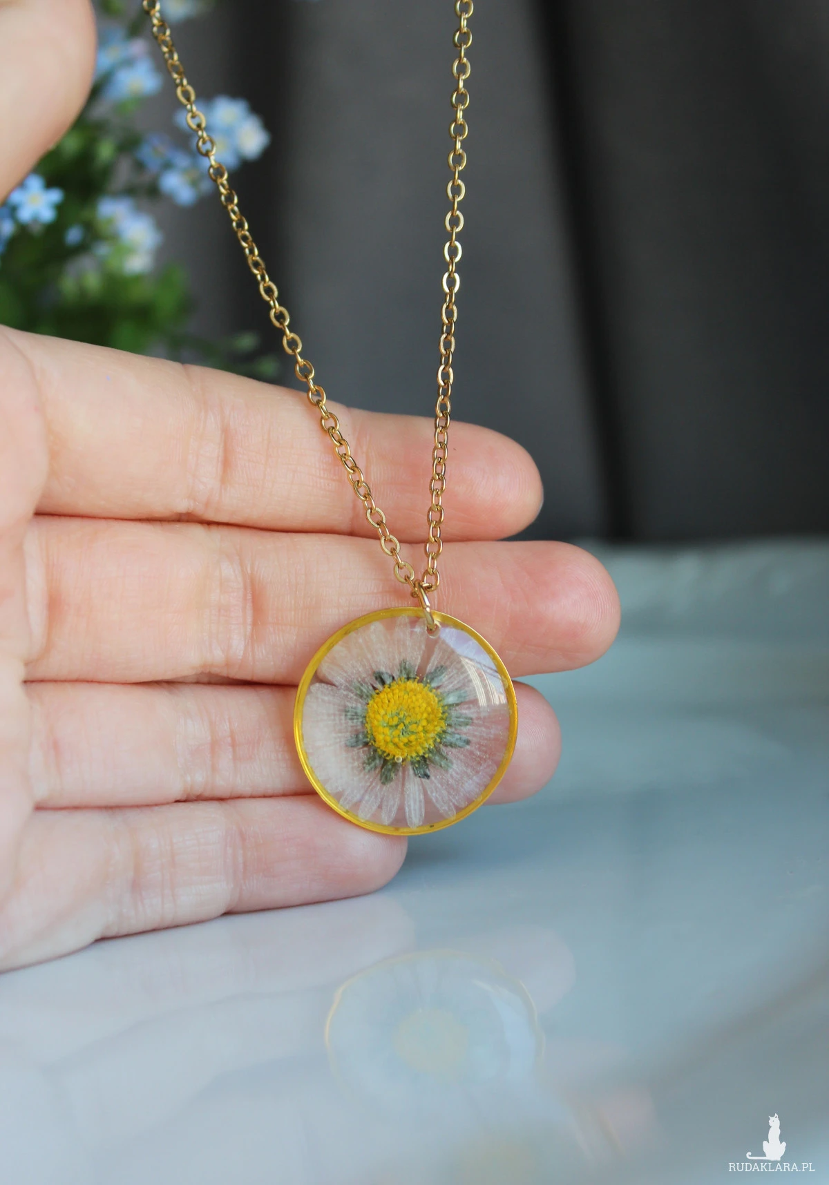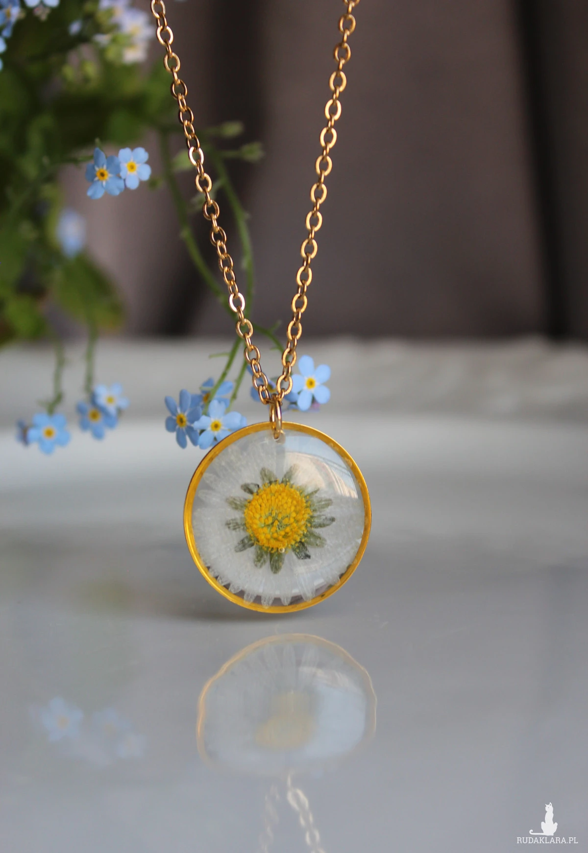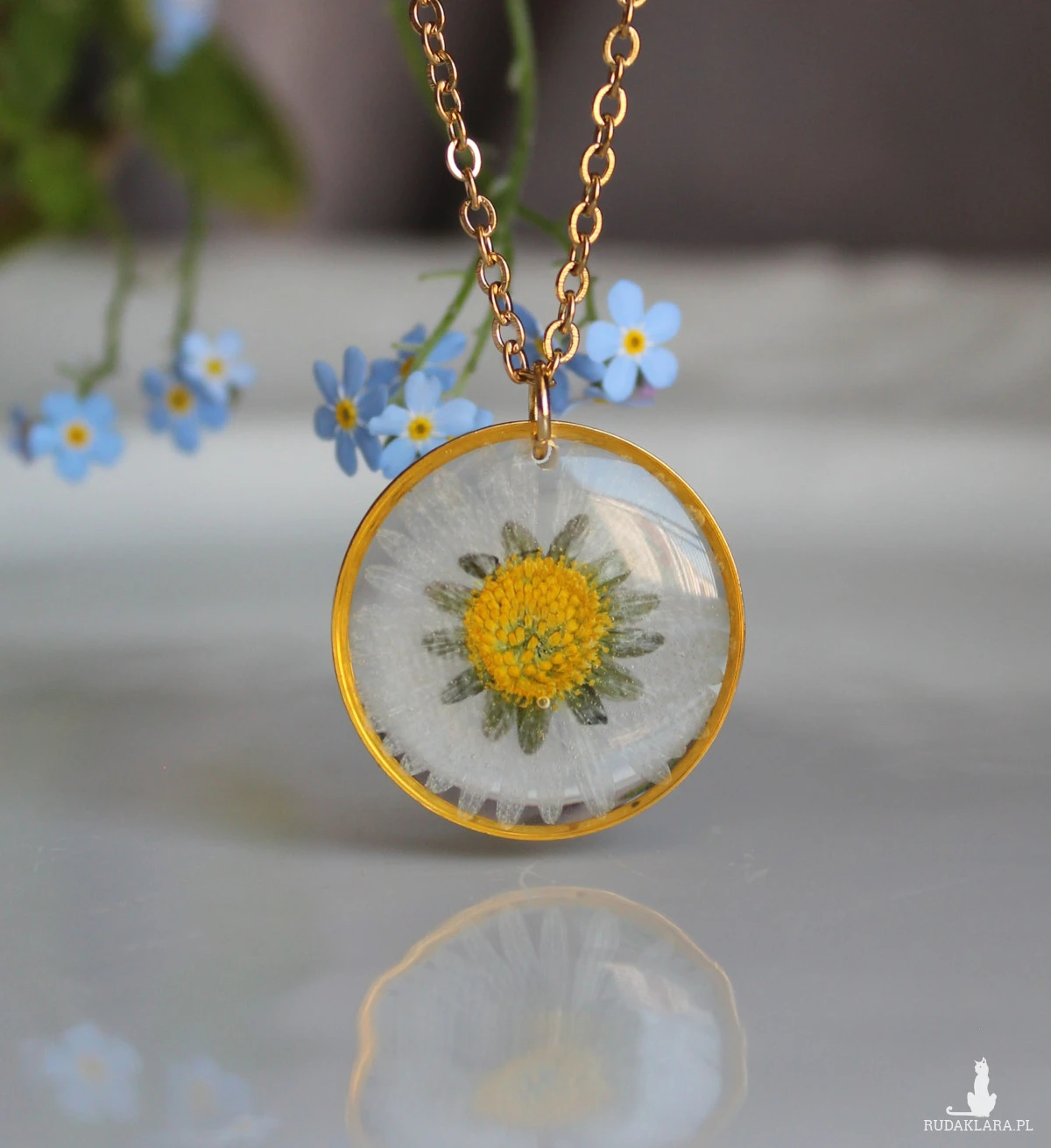 Oferuję Państwu unikalną biżuterię. Zawieszka jest wykonana z suszonych kwiatów i żywicy epoksydowej. Biżuteria jest wspaniałym i oryginalnym prezentem na lata.