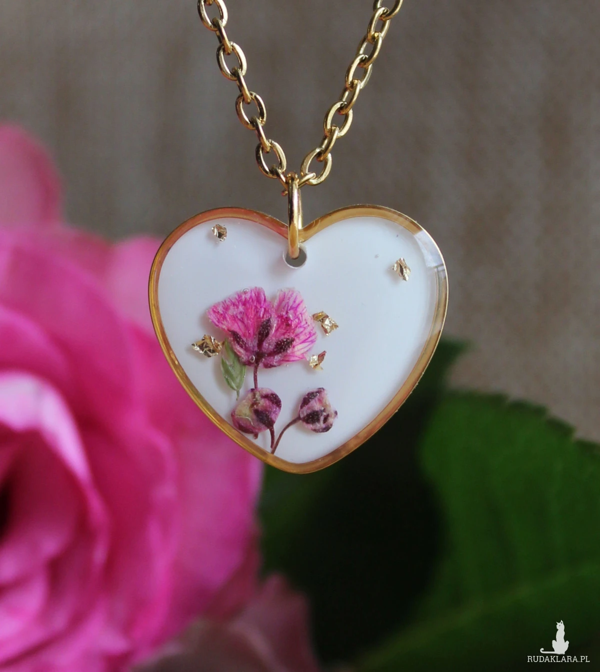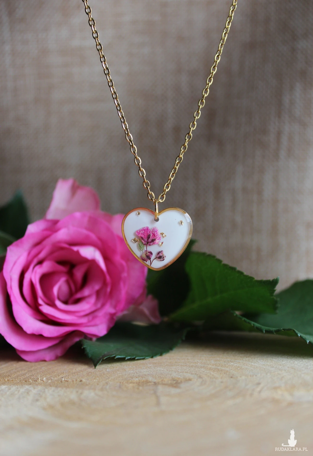Złota zawieszka złoty wisiorek kwiat naszyjnik żywica z żywicy suszone kwiaty z kwiatami naturalne kobieca dziewczęca zielona serce serduszko bukiet kwiatowy różowe smagliczka