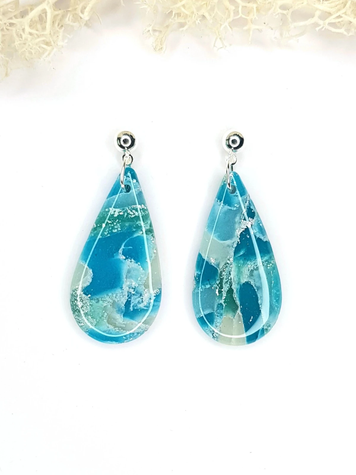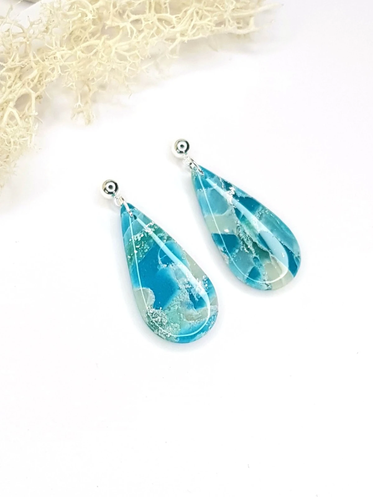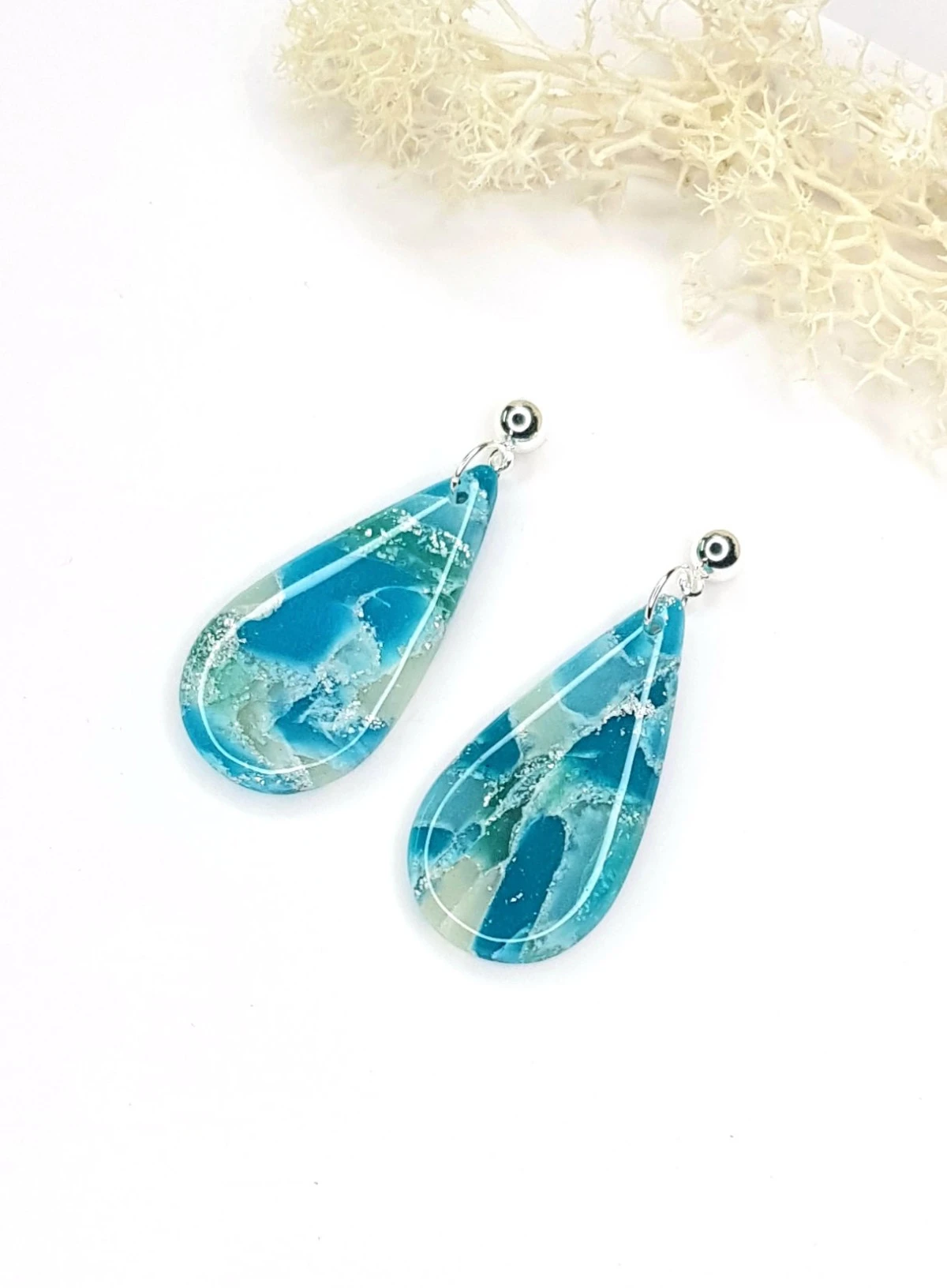 Wypiekane w piecu przewieszki wykonane zostały z profesjonalnej gliny polimerowej w różnych odcieniach turkusu i mięty.