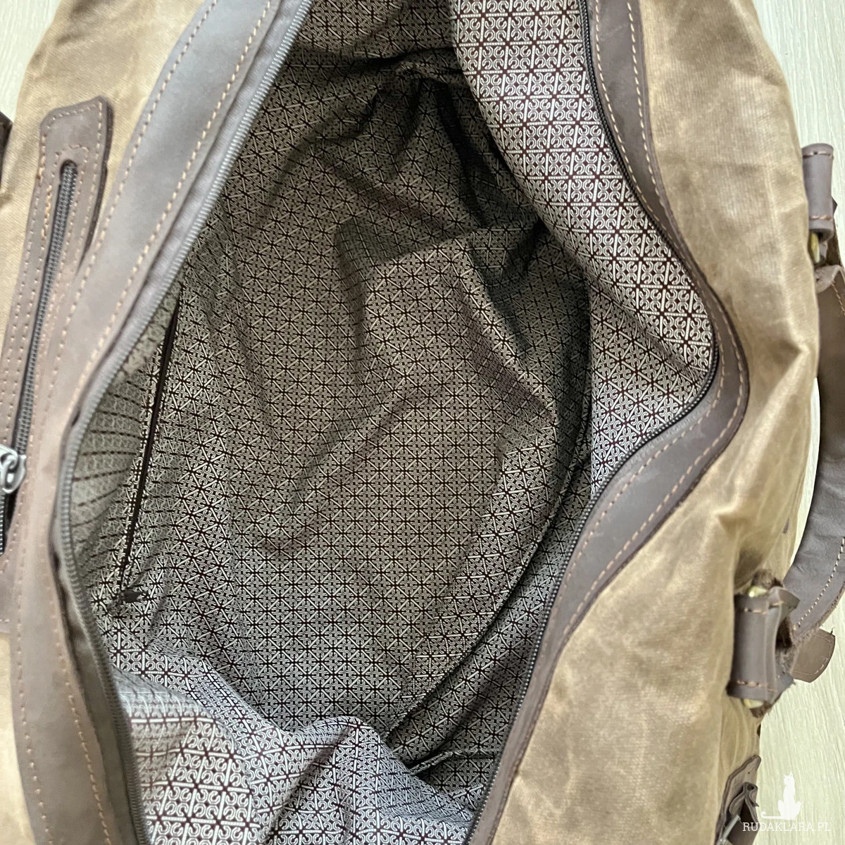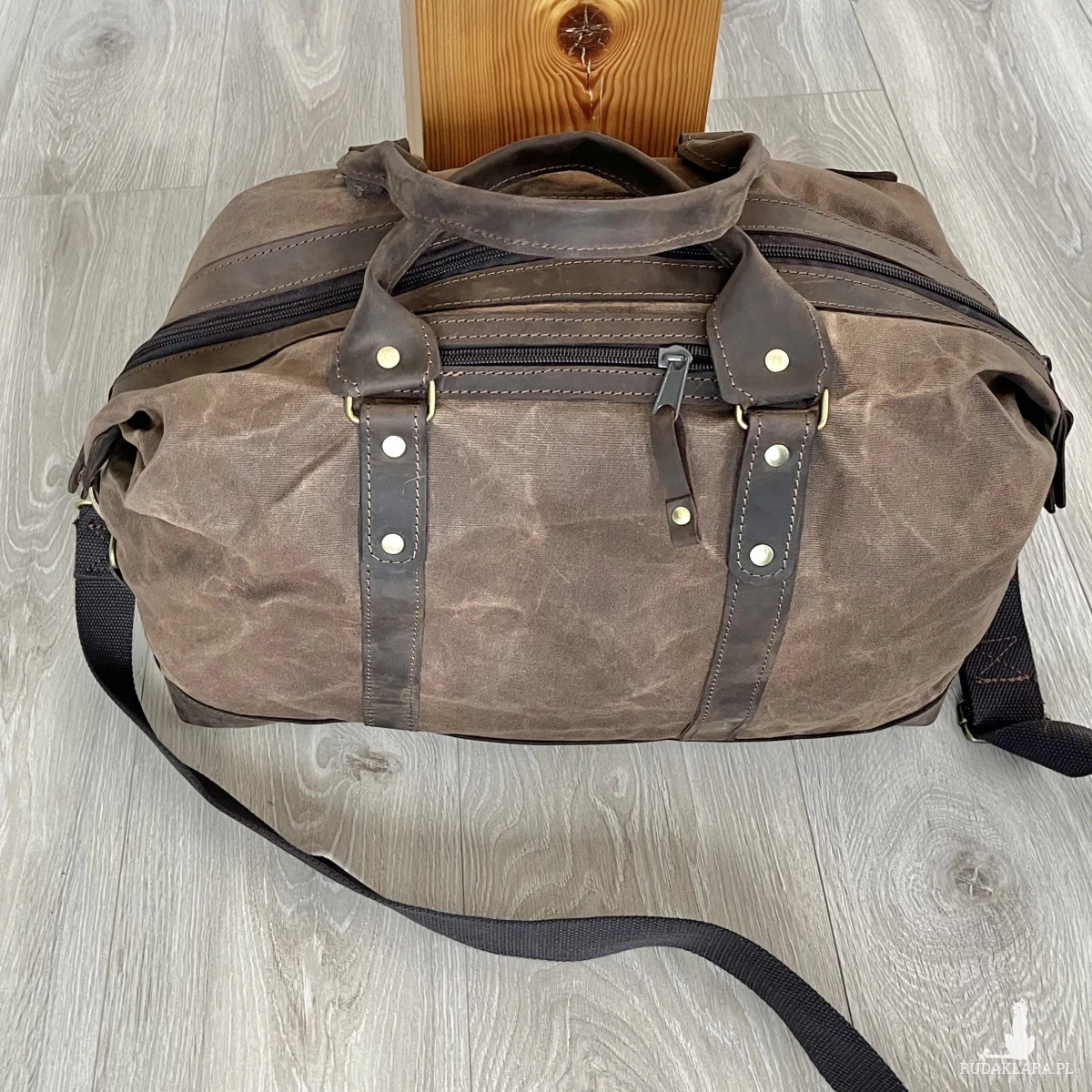Bawełniana torba unisex z brązowej skóry i ręcznie woskowanej brązowej grubej bawełny jest idealna ażeby zmieścić nasze bagaże.