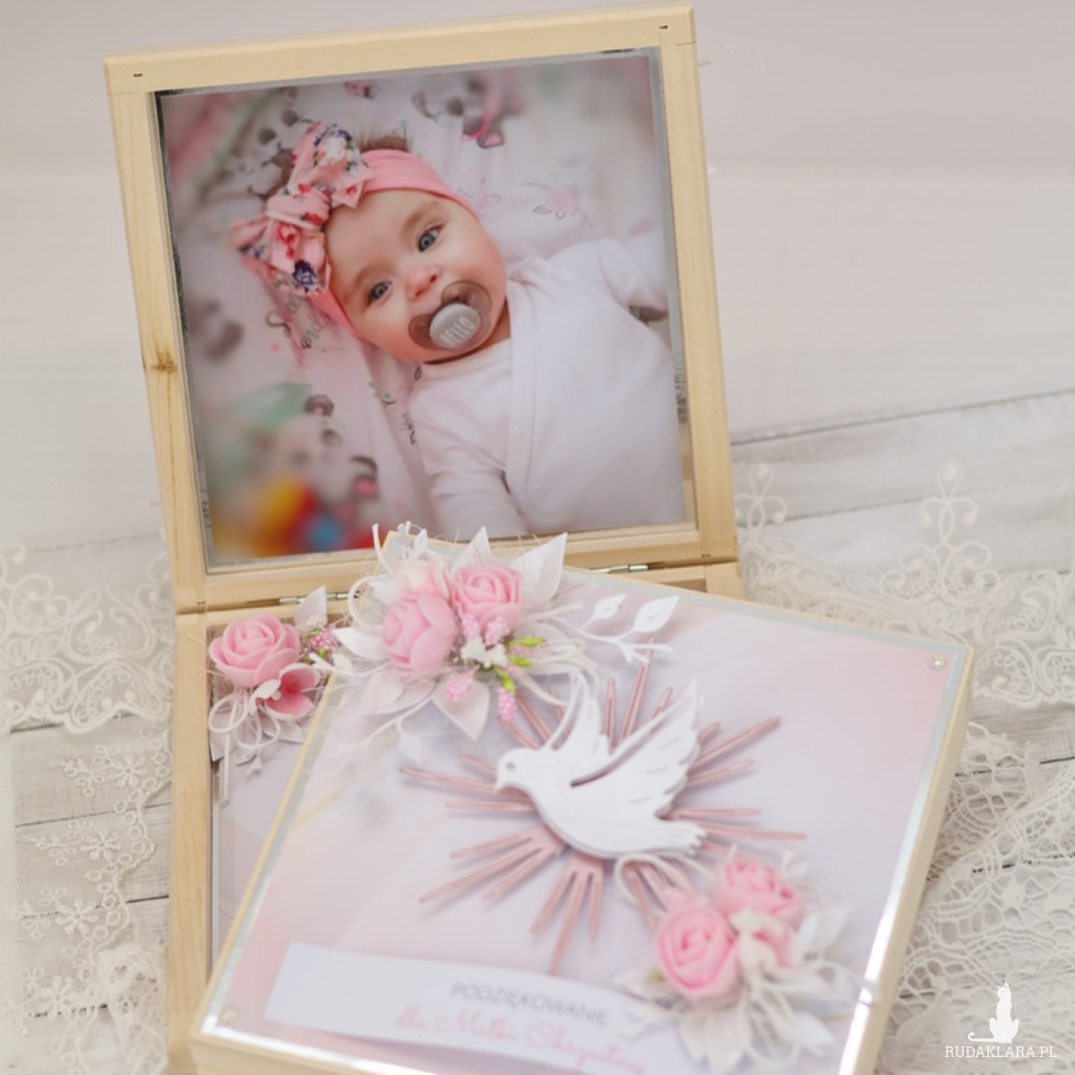 Drewniane pudełko idealnie sprawdzi się jako Podziękowanie dla Rodziców Chrzestnych z okazji sakramentu Chrztu Świętego dla dziewczynki lub jako pamiątka.