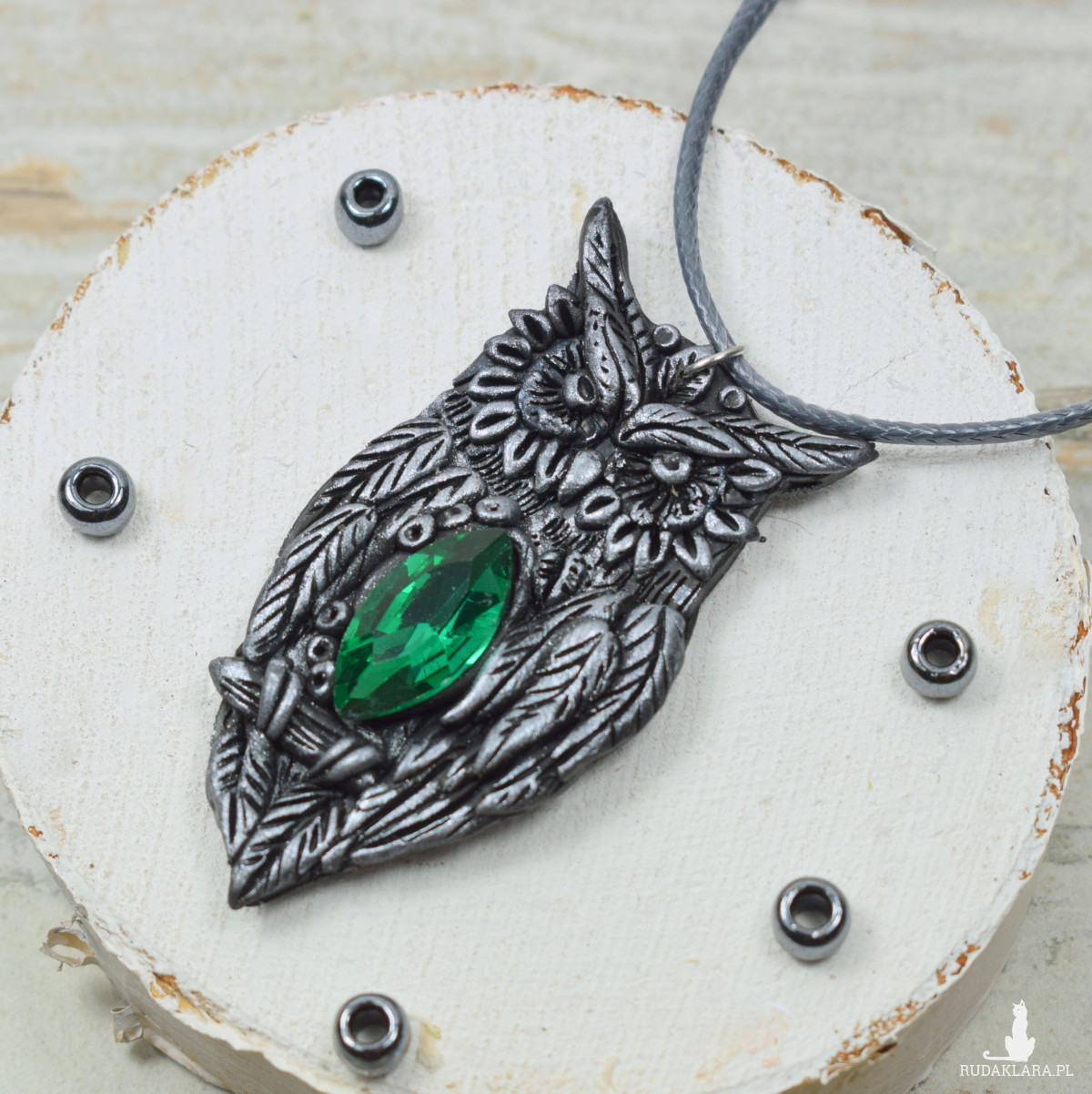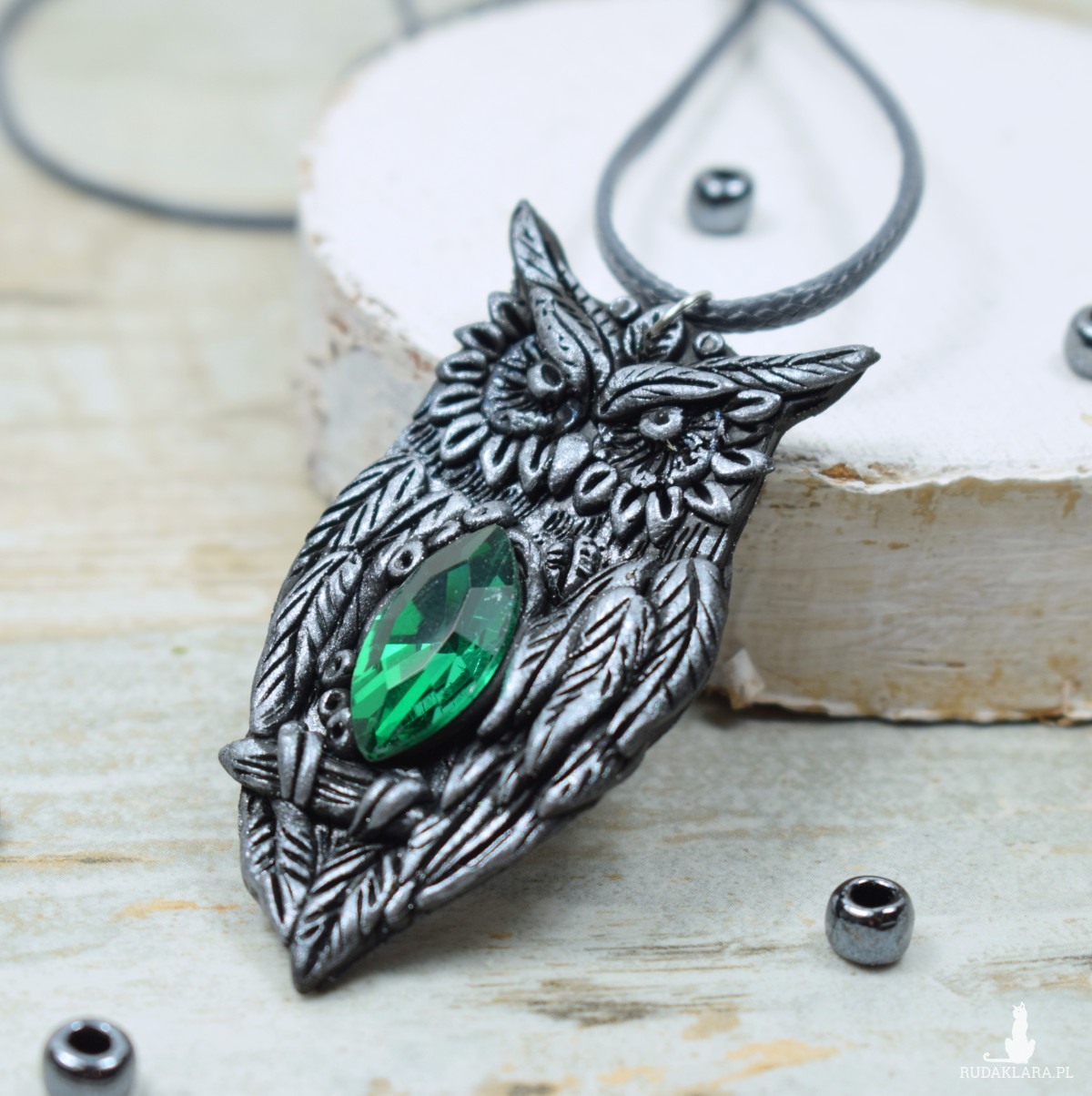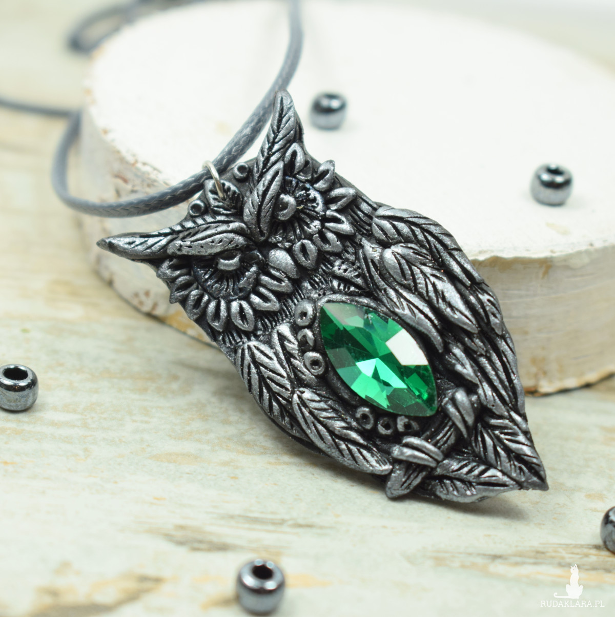 Duży, bardzo efektowny wisiorek sowa, z przepięknie mieniącym się kryształem w szmaragdowo-zielonym odcieniu.