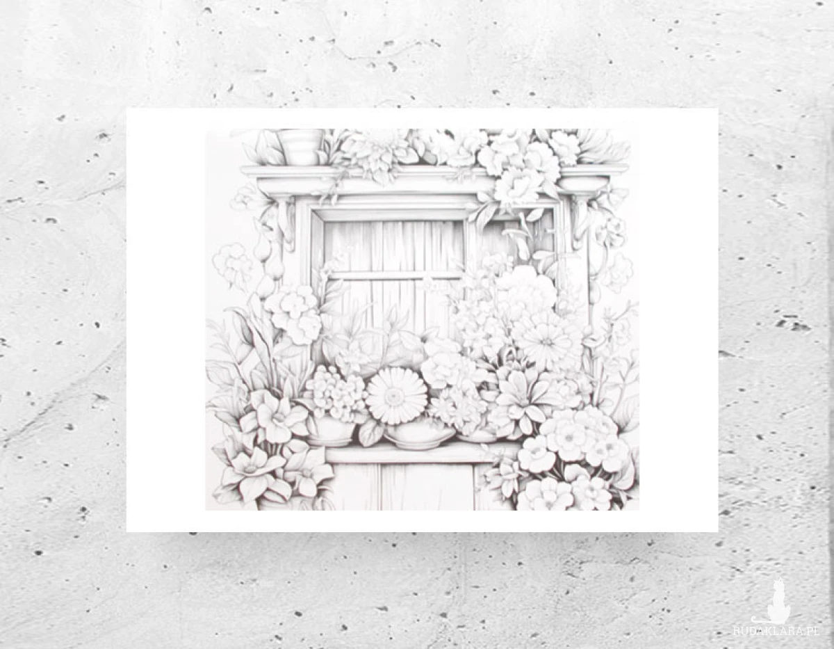 rustykalny plakat A4, czarno biały plakat 21x30, okna plakat, fajne plakaty do domu, kwiaty plakat, ogród plakat, plakat do przedpokoju, mały plakat do sypialni, biało szary plakat kwiatki
