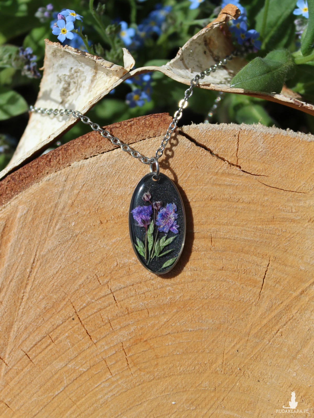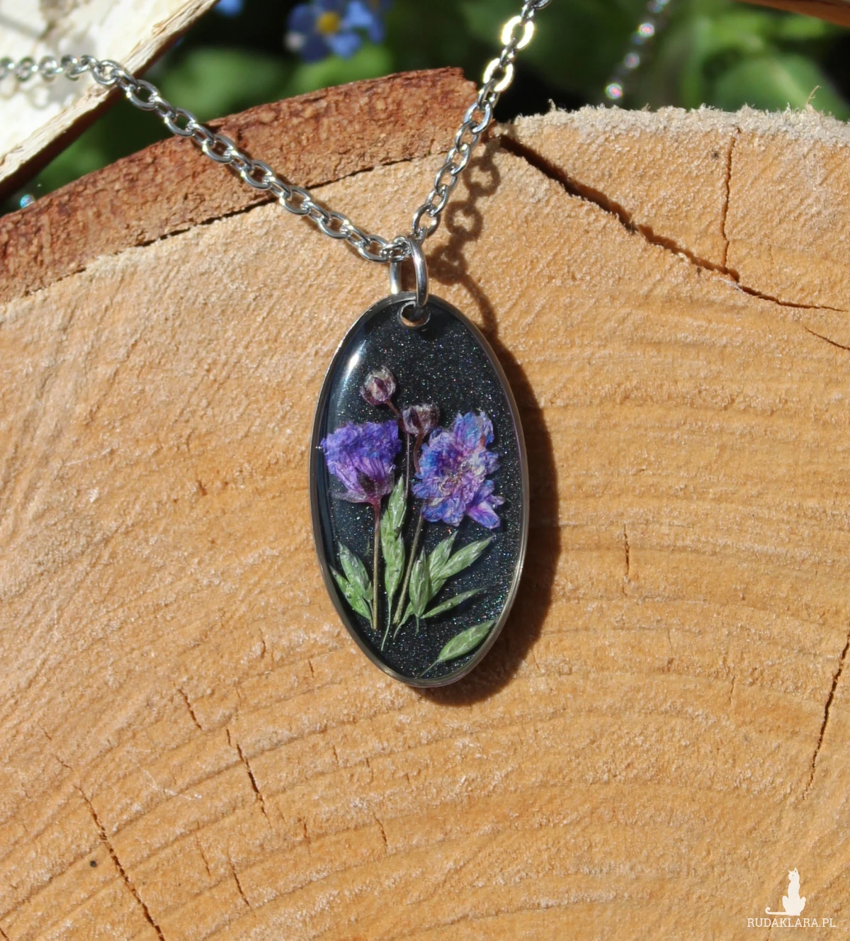 Oferuję Państwu unikalną biżuterię. Zawieszka jest wykonana z suszonych kwiatów i żywicy epoksydowej. Biżuteria jest wspaniałym i oryginalnym prezentem na lata.