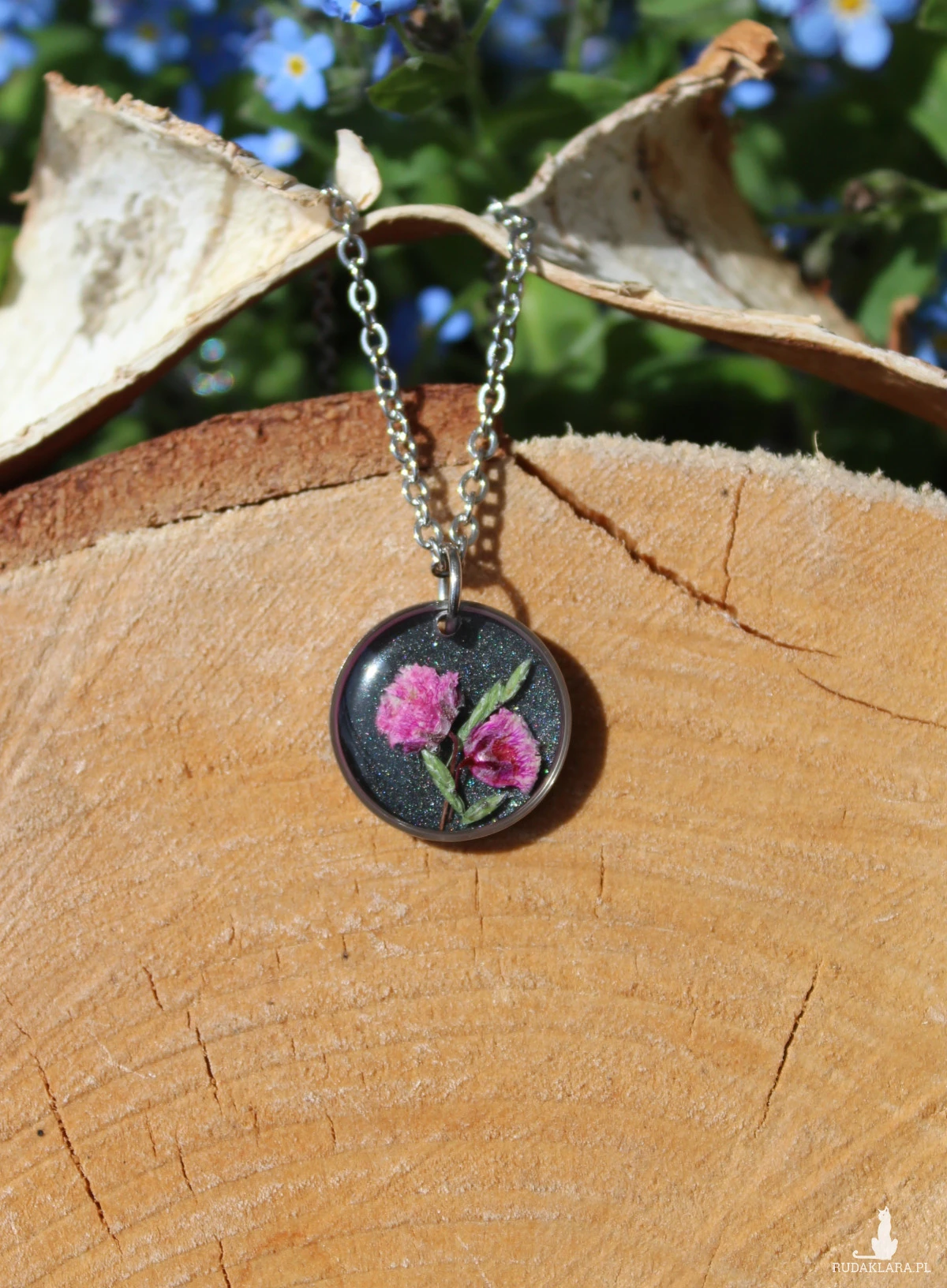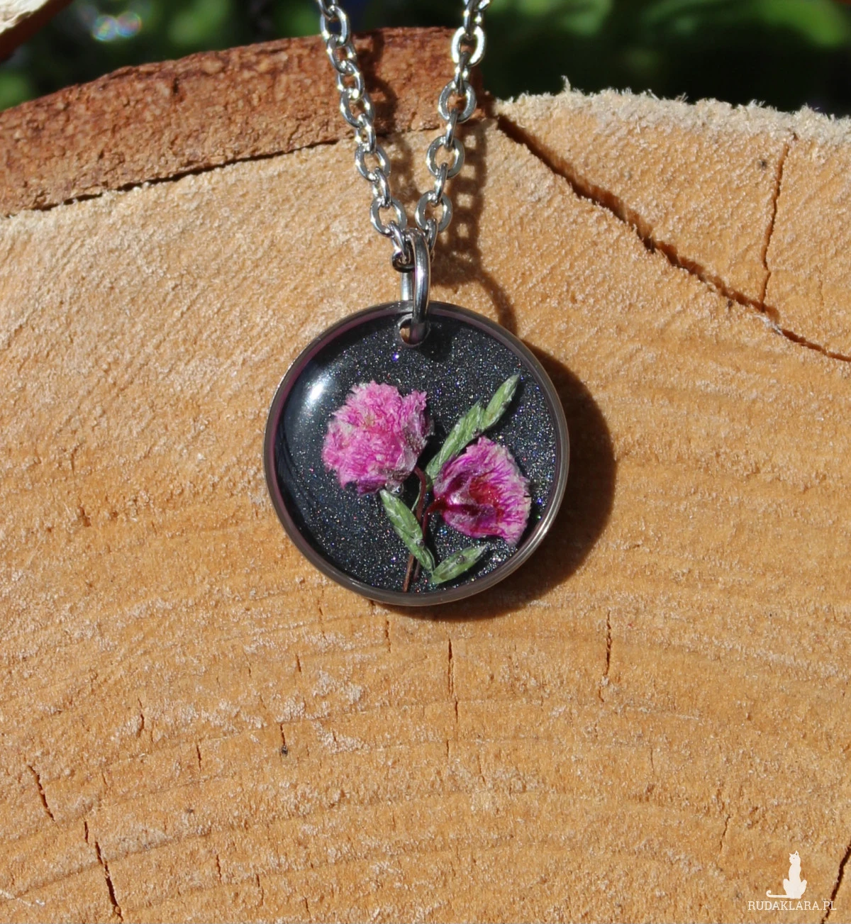 Oferuję Państwu unikalną biżuterię. Zawieszka jest wykonana z suszonych kwiatów i żywicy epoksydowej. Biżuteria jest wspaniałym i oryginalnym prezentem na lata.