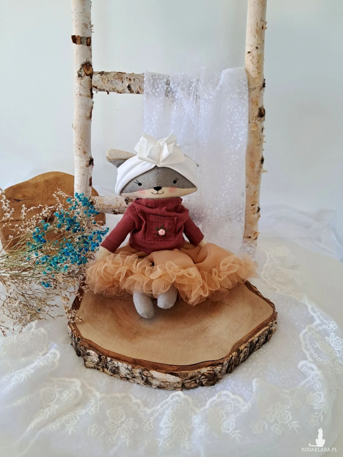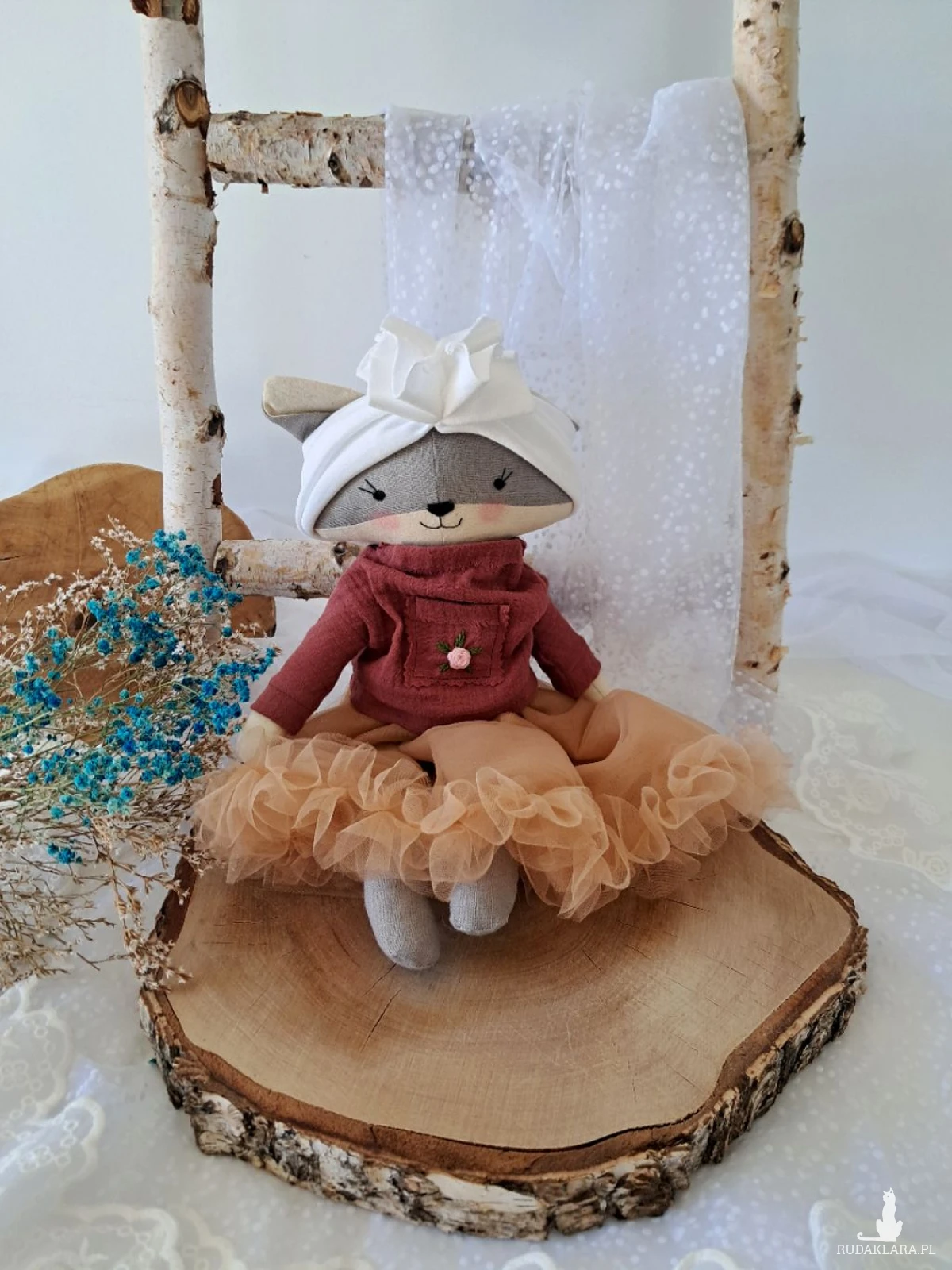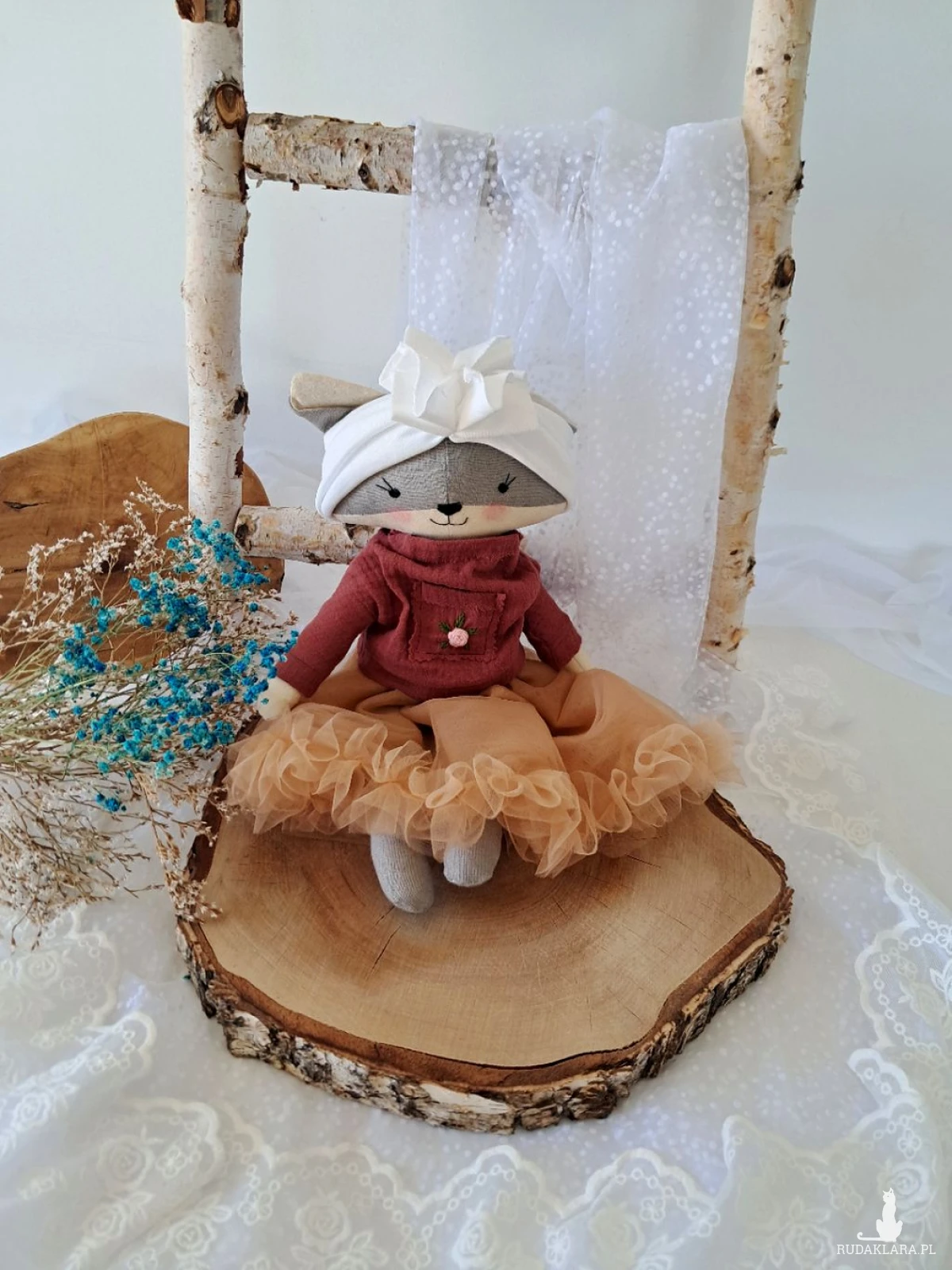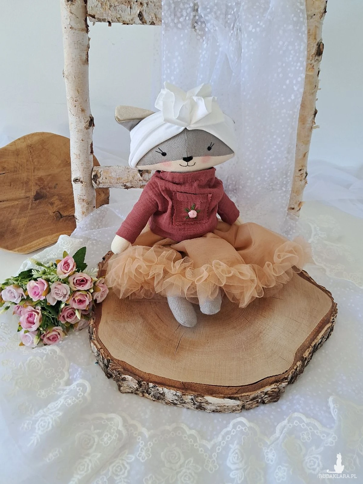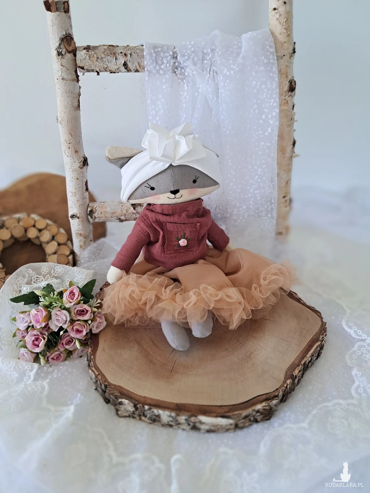 Dzień dobry:)Mam do sprzedaży własnoręcznie uszytą lnianą lisiczkę.Uszyta z wysokiej jakości lnu, bawełny,muślinu i tiulu. Maskotka wypełniona jest antyalergiczną kulką silikonową. Bluzka z muślinu koloru brudnego ciemniejszego różu z kieszonką ozdobioną własnoręcznie wyszytą muliną różyczką z listkami. Spódnica tiulowa na gumce,4-warstwowa z falbaną. Opaska uszyta z dresówki. Wszystko zdejmowane przez nóżki. Wysokość 40 cm bez uszu, z uszami 42 cm.