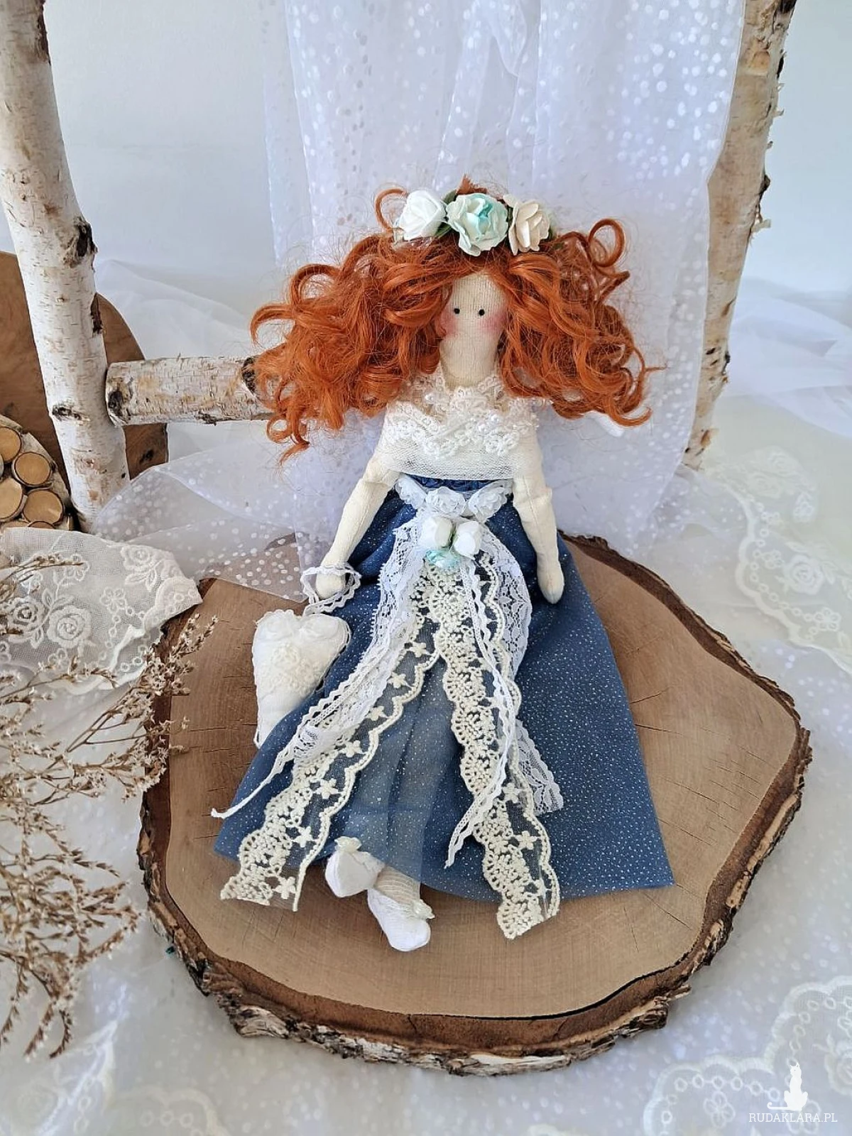 Witam serdecznie;) Mam do sprzedaży własnoręcznie stworzoną anielicę (nierozbieralną). Ciało wykonane z bawełny, wypełniony antyalergiczną kulką silikonową. Góra sukienki ozdobiona białą koronką,pozostały fragment niebieskim tiulem ze srebrnym brokatem. W pasie kwiatuszki i liczne wstążki. W ręku trzyma dekoracyjne serduszko,na stopach ma białe lniane buciki zakończone perełkowymi drobnymi różyczkami. Na rudych,kręconych włosach ma założony śliczny wianuszek. Anioł może stanowić prezent z różnych okazji urodzin, imienin, Komunii św., chrztu, Walentynek, świąt, ale bez względu na okazję może być wyrażeniem miłości lub wdzięczności:)