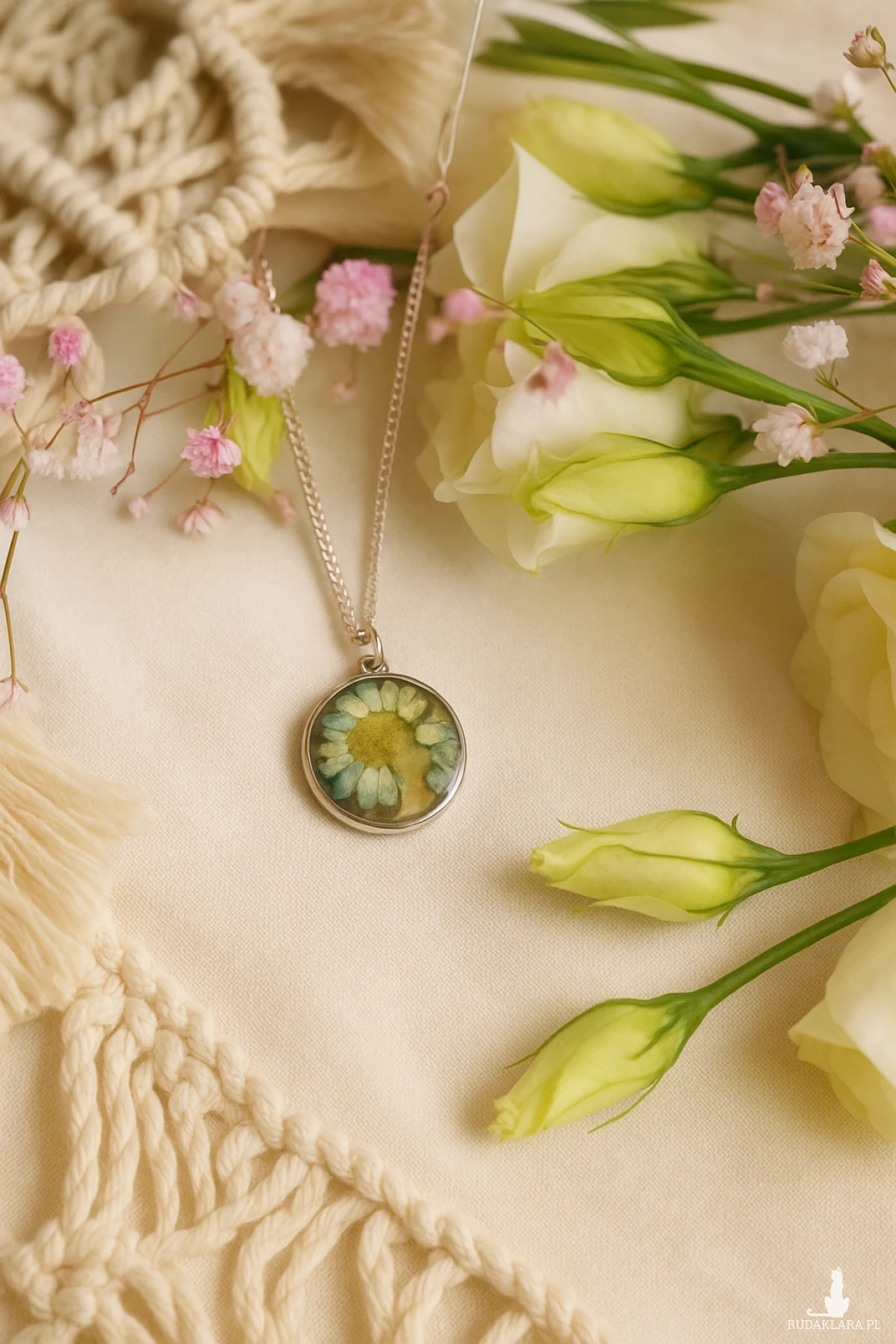 Szukasz delikatnej, ale wyjątkowej biżuterii, która przyciąga wzrok naturalnym pięknem? Przedstawiam ręcznie wykonany naszyjnik z zatopioną w żywicy suszoną gliksją, osadzoną na srebrnej bazie ze stali nierdzewnej. To idealny wybór dla kobiet, które cenią sobie lekkość, elegancję i kontakt z naturą.