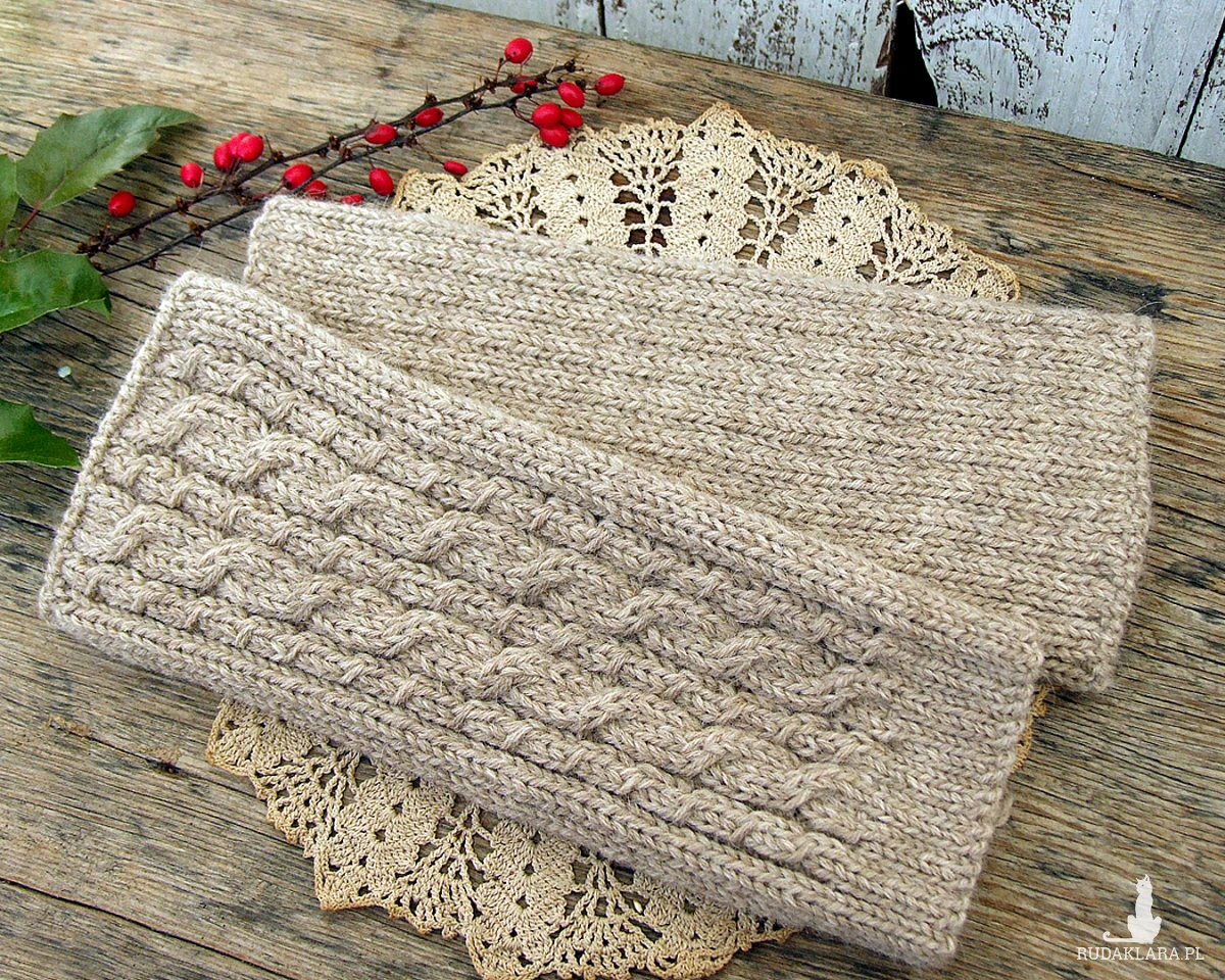 Beżowe, wełniane getry, ocieplacze - wykonane ręcznie na drutach wzorem ściągaczowym i w warkocze z jednej strony, bezszwowe,