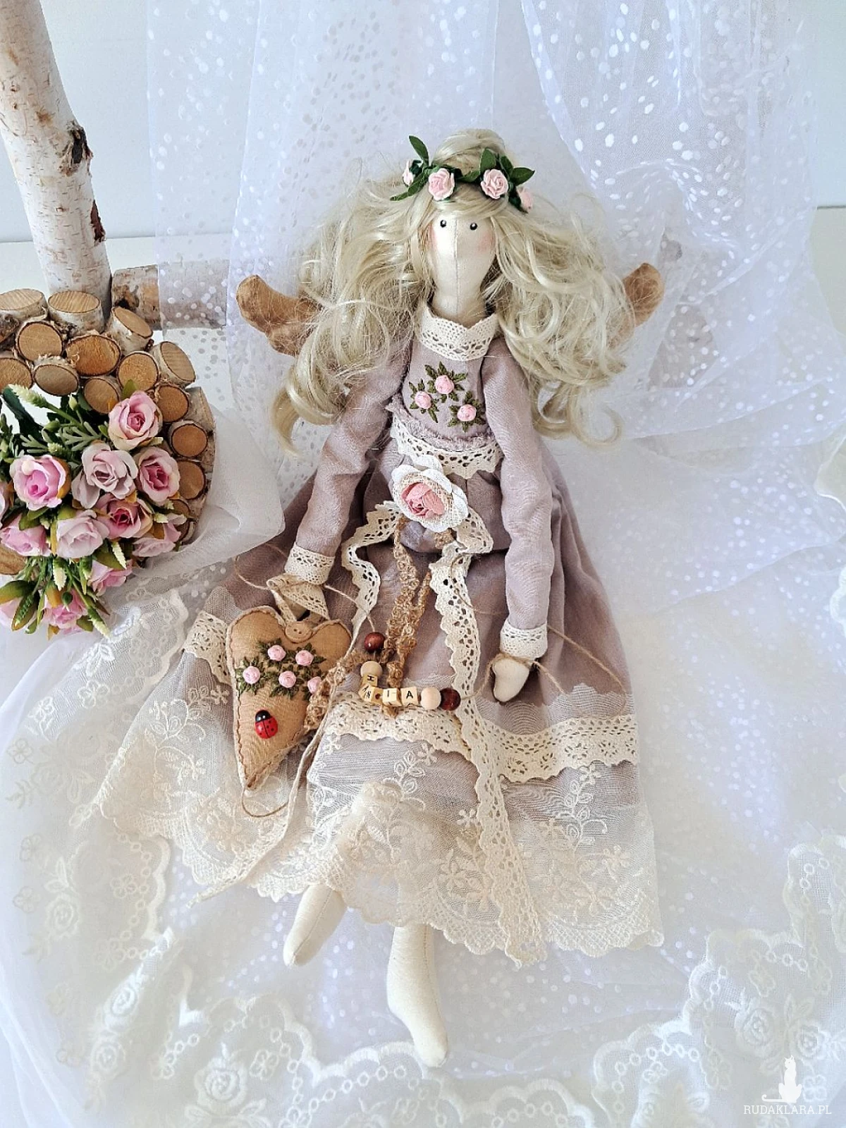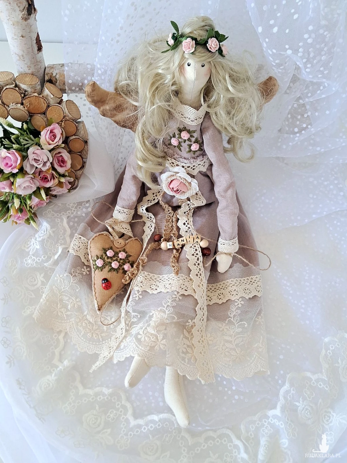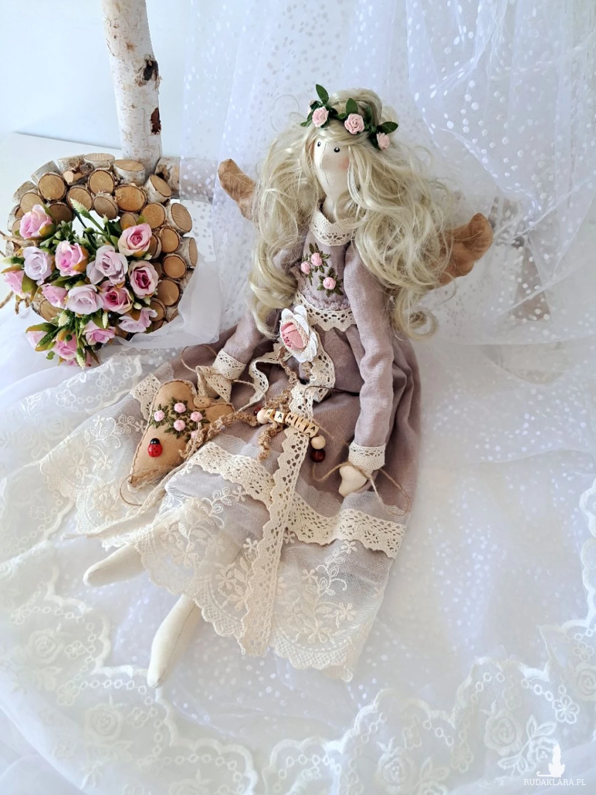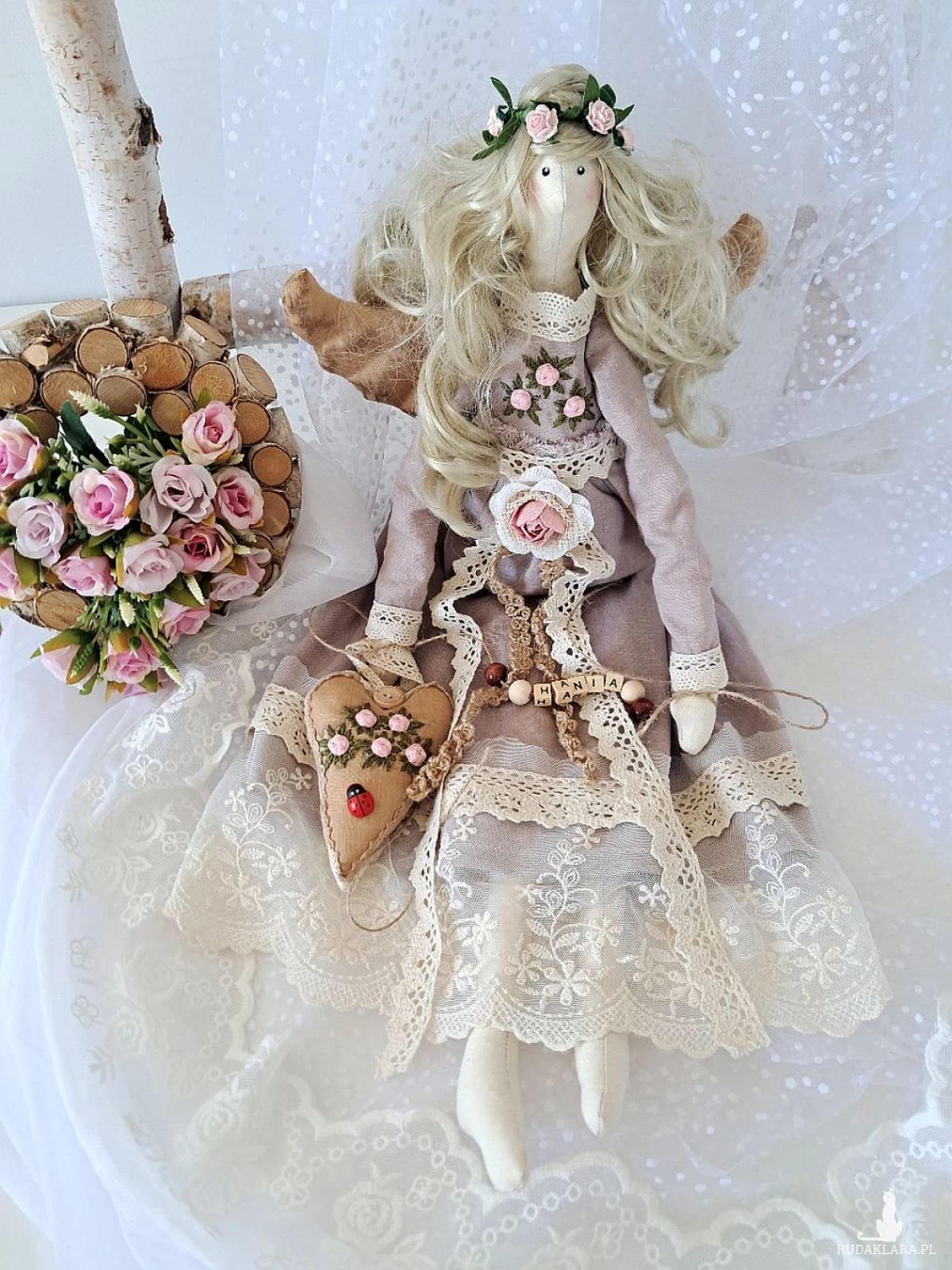 Mam do sprzedania własnoręcznie uszytą anielicę. Wysokość 53 cm. Ciałko uszyte z surówki bawełnianej, wypełnione silikonową antyalergiczną kulką silikonową. Sukienka uszyta z wysokogatunkowego, 100 procentowego lnu w kolorze antycznego różu - góra ozdobiona haftowanymi przeze mnie różyczkami w kolorze bladego różu oraz zielonymi listkami,dół w koronkach w kolorze ecru. Serduszko również udekorowane wyszywanymi różyczkami oraz drewnianymi guziczkiem barwione kawą. Imię z drewnianych korali mogę zmienić stosownie do potrzeb. Włosy w kolorze lodowatego blondu,kręcone.Polecam na unikatowy, piękny prezent z różnych okazji. Dodam tylko,że to nie jest zabawka a urocza dekoracja;)