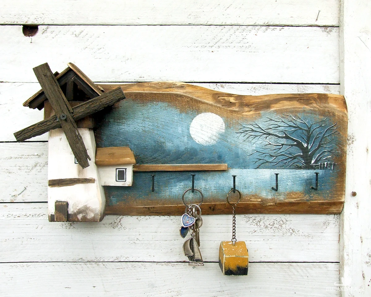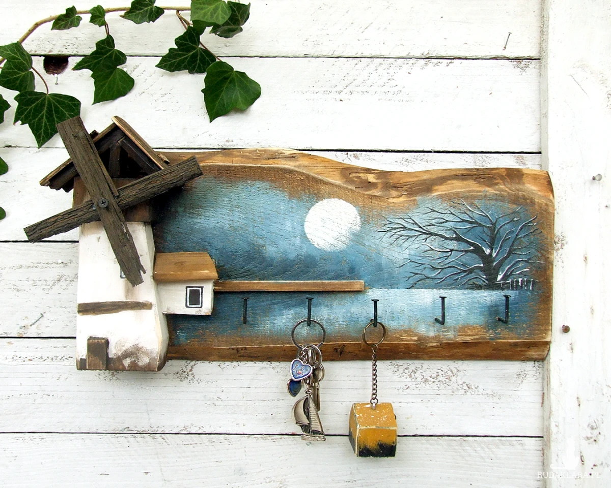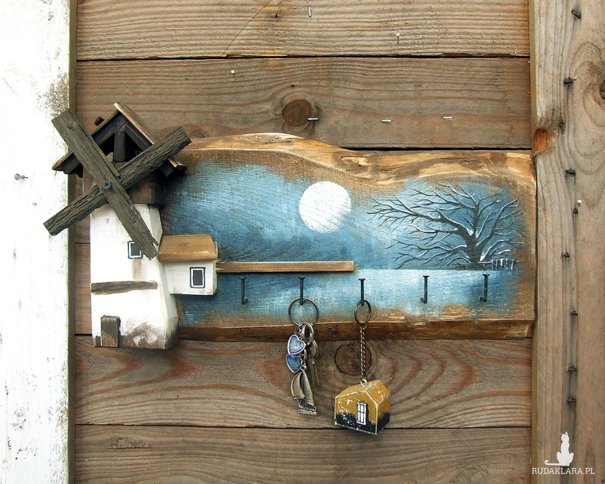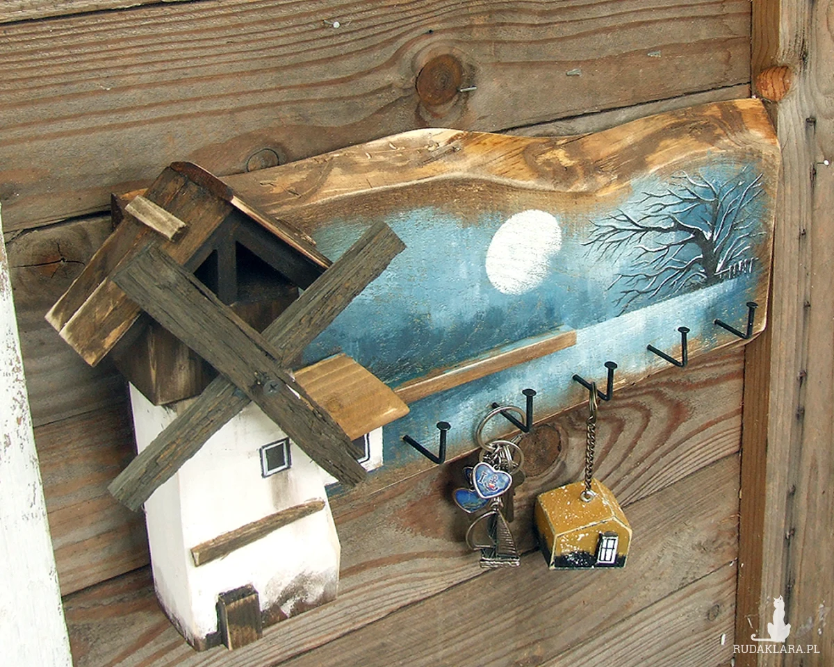 Podstawą wieszaka jest stara sosnowa deska, na której namalowany jest pejzaż. Pejzaż malowany bardzo delikatnie, oszczędnie - tak aby nie zasłonić drewna, jego faktury, sęków i śladów świadczących o tym, że deska jest stara i z odzysku. Wiatrak i domek docięte są z sosnowej belki. Całość malowana jest farbami akrylowymi i zabezpieczona akrylowym, matowym lakierem.
