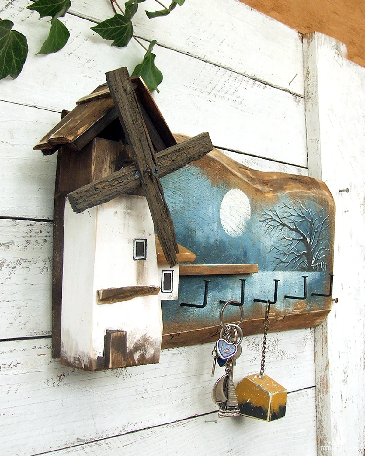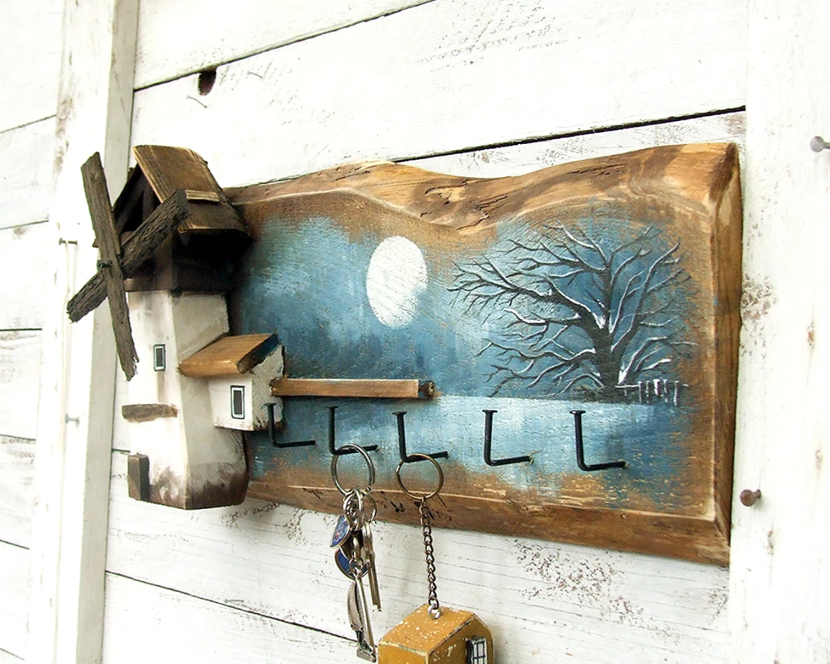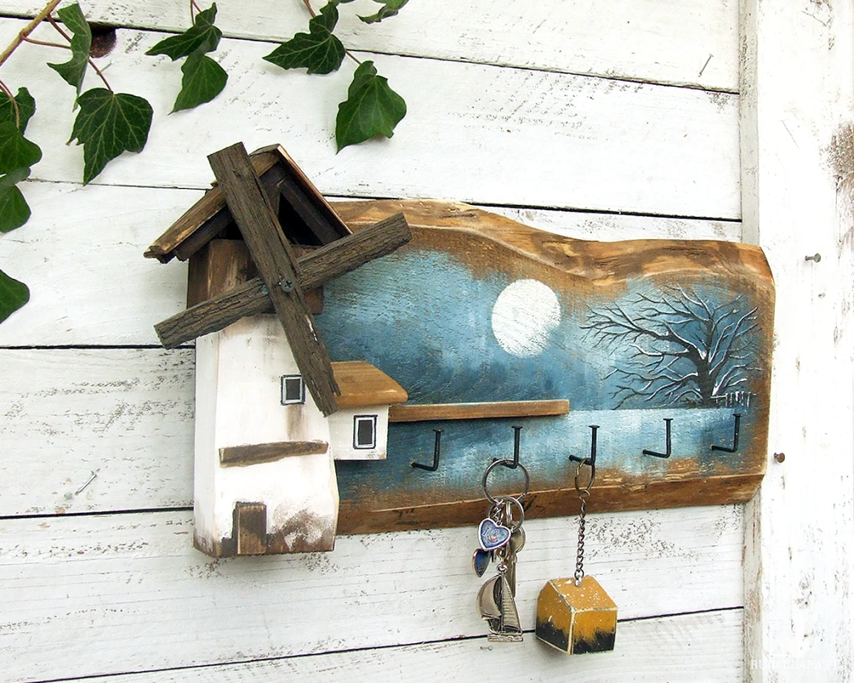 Podstawą wieszaka jest stara sosnowa deska, na której namalowany jest pejzaż. Pejzaż malowany bardzo delikatnie, oszczędnie - tak aby nie zasłonić drewna, jego faktury, sęków i śladów świadczących o tym, że deska jest stara i z odzysku. Wiatrak i domek docięte są z sosnowej belki. Całość malowana jest farbami akrylowymi i zabezpieczona akrylowym, matowym lakierem.