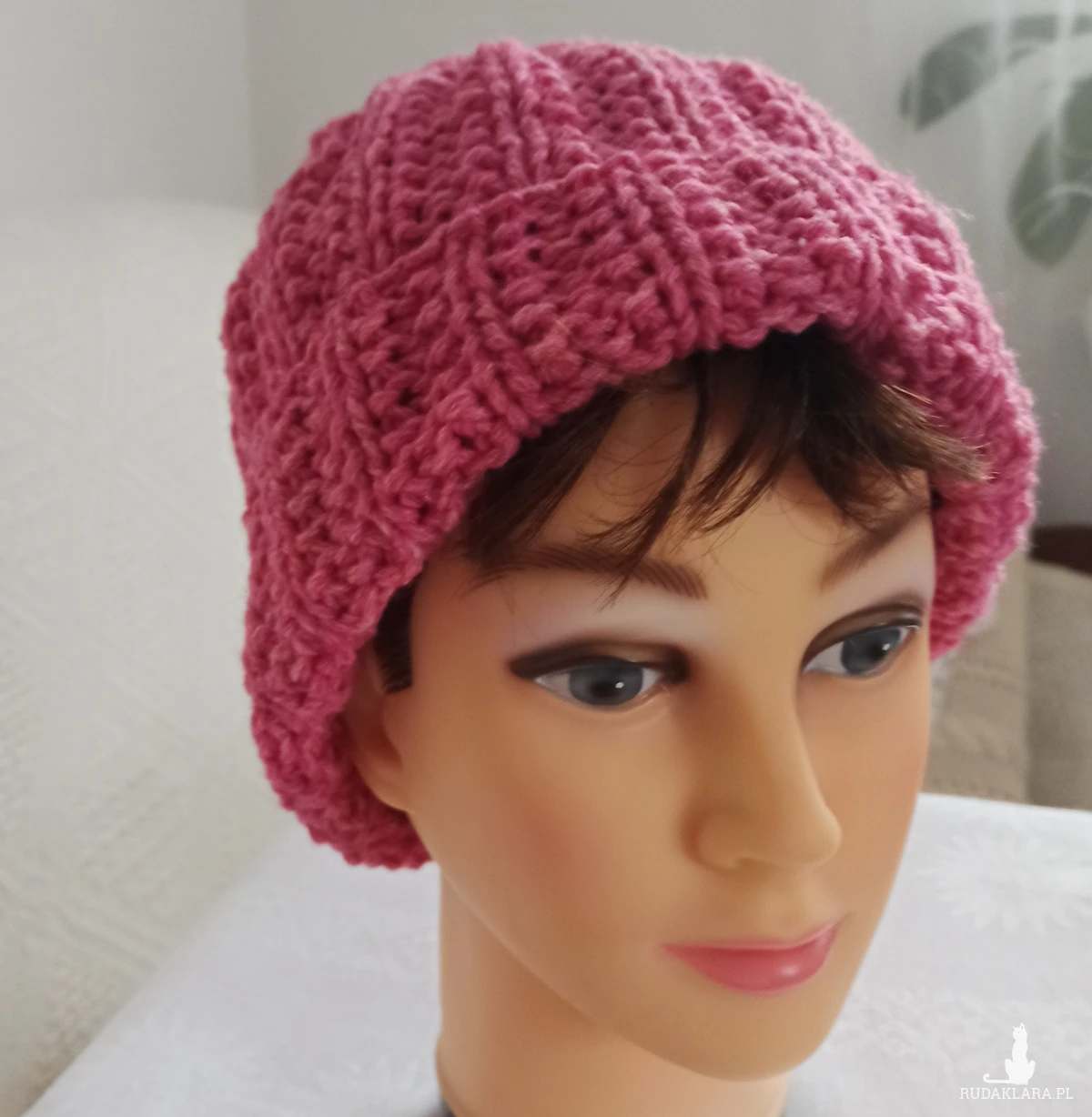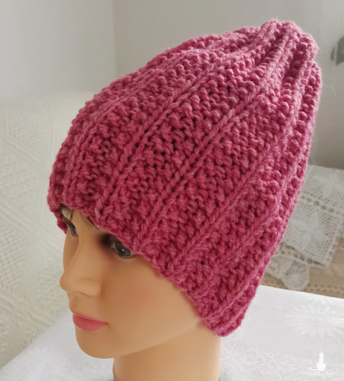 typu oversize wykonana z fuksjowej/różowej mieszanki wełny 65% z domieszką 35% akrylu. Wykonana dekoracyjnym wzorem, dosyć efektownym. Leciutka, przyjemna w dotyku, nie gryzie. Dobrze ogrzewa i