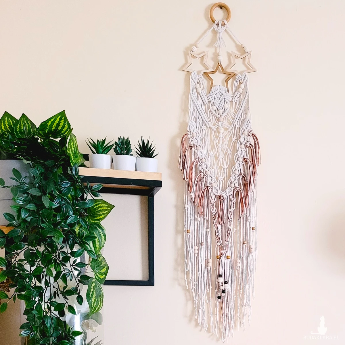 Wykonana na bazie z gwiazdek ze sklejki drewnianej, ze sznurka bawełnianego (1,5-2mm) w kolorze naturalnym, przełamana elementami ze sznurka ombre w odcieniach beżu i brązu. Dodatek drewnianych korali w różnych kolorach ożywia i dodaje lekkości.