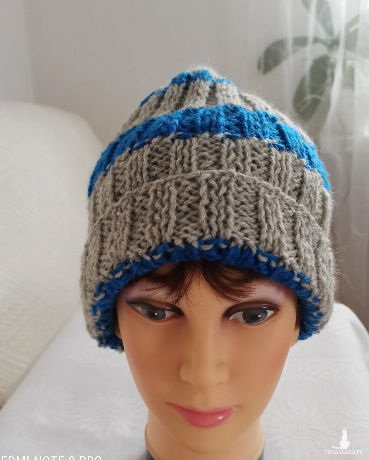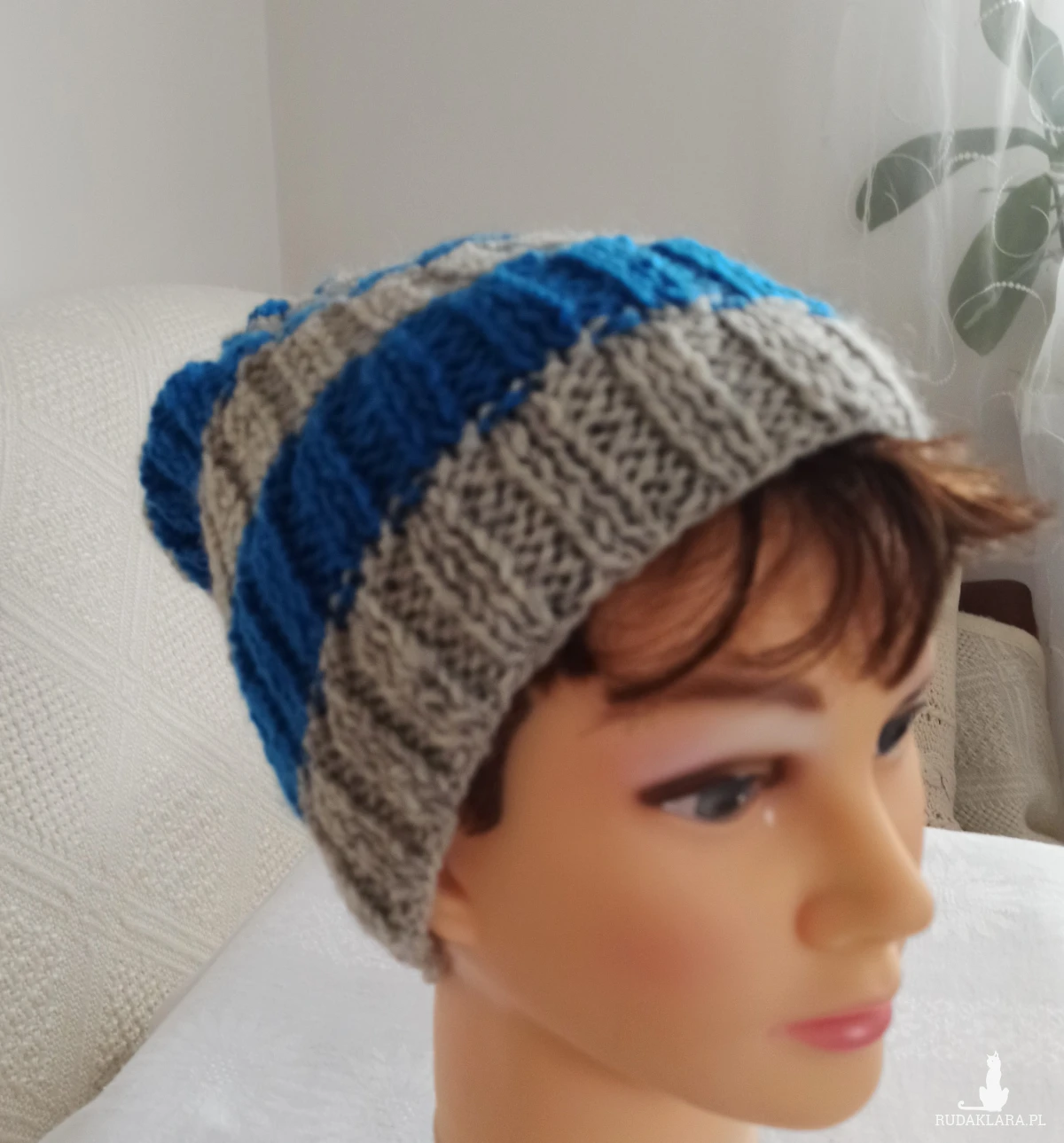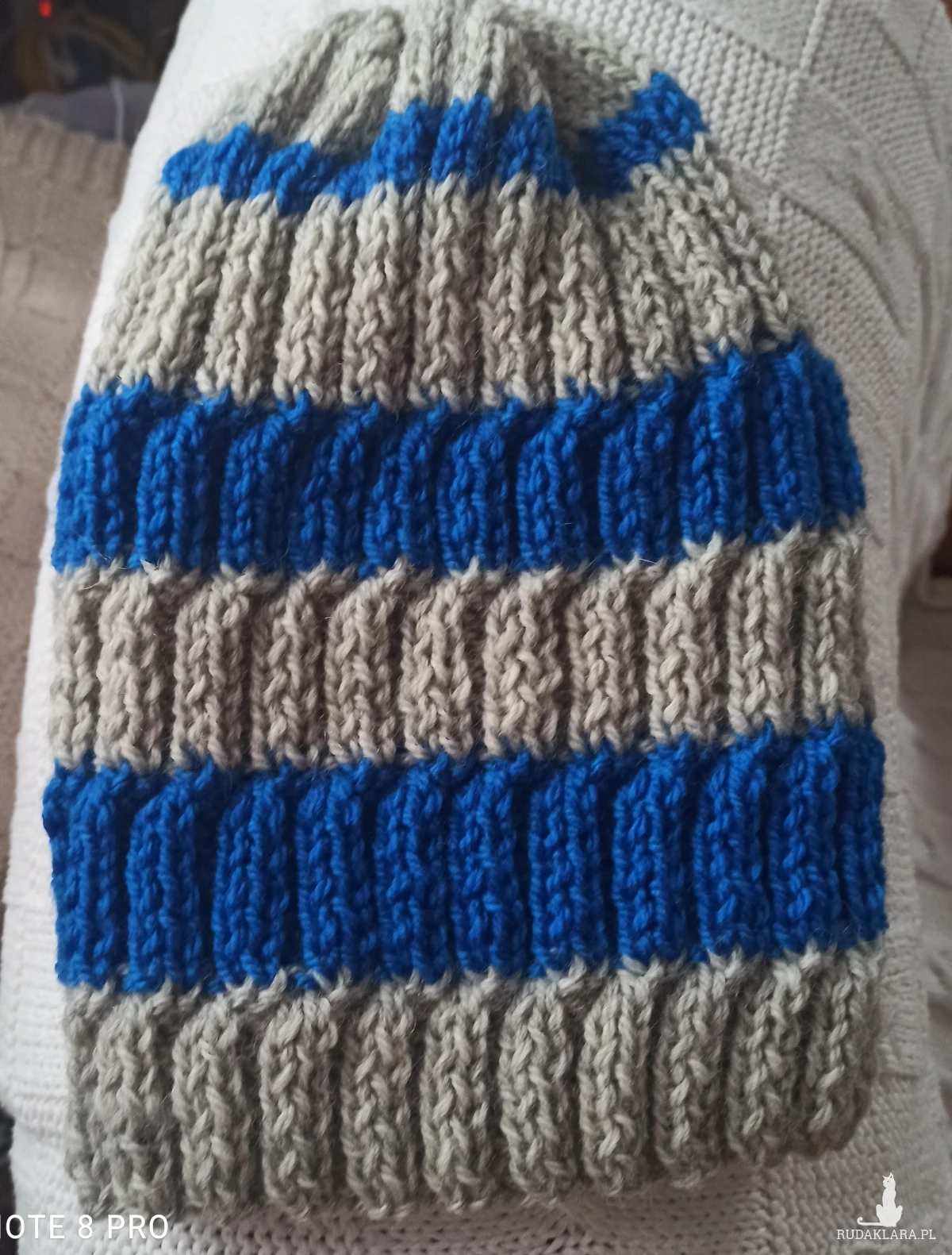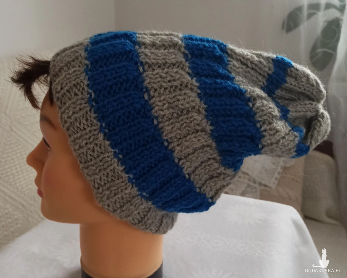 w paski szaro-atramentowe typu oversize wykonana z wełny 65% i z akrylu.Kolory modne w tym sezonie. Wykonana dekoracyjnym wzorem, dosyć efektownym. Leciutka, przyjemna w dotyku, nie gryzie. Dobrze ogrzewa i