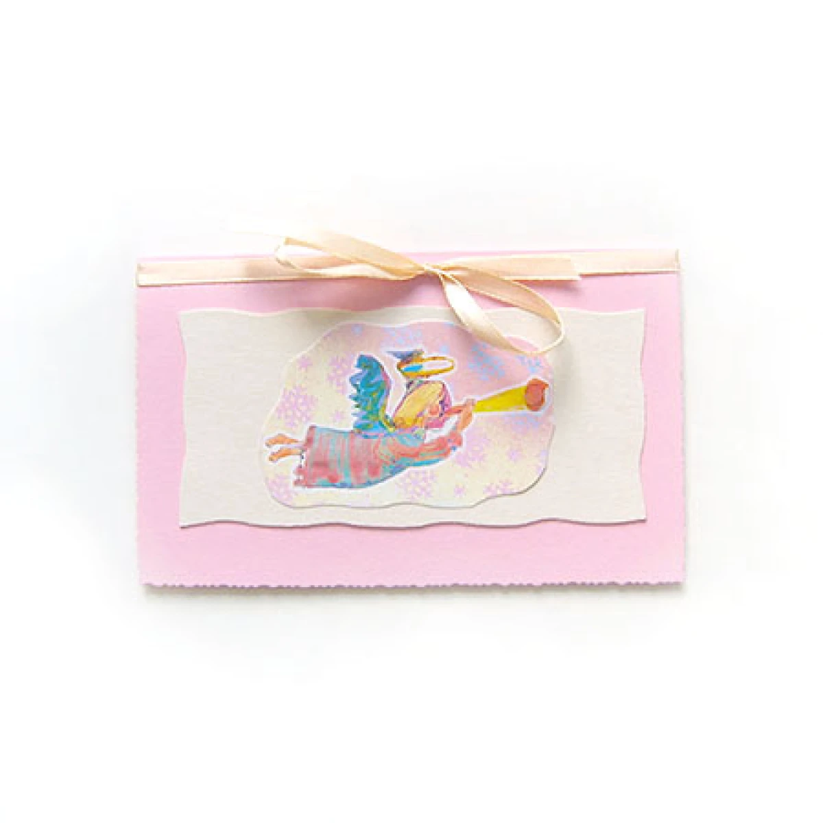 Pastelowy, otwierany karnet z aniołkiem, gruby kartonik. Kartka jest bez życzeń. Dołączona biała koperta.