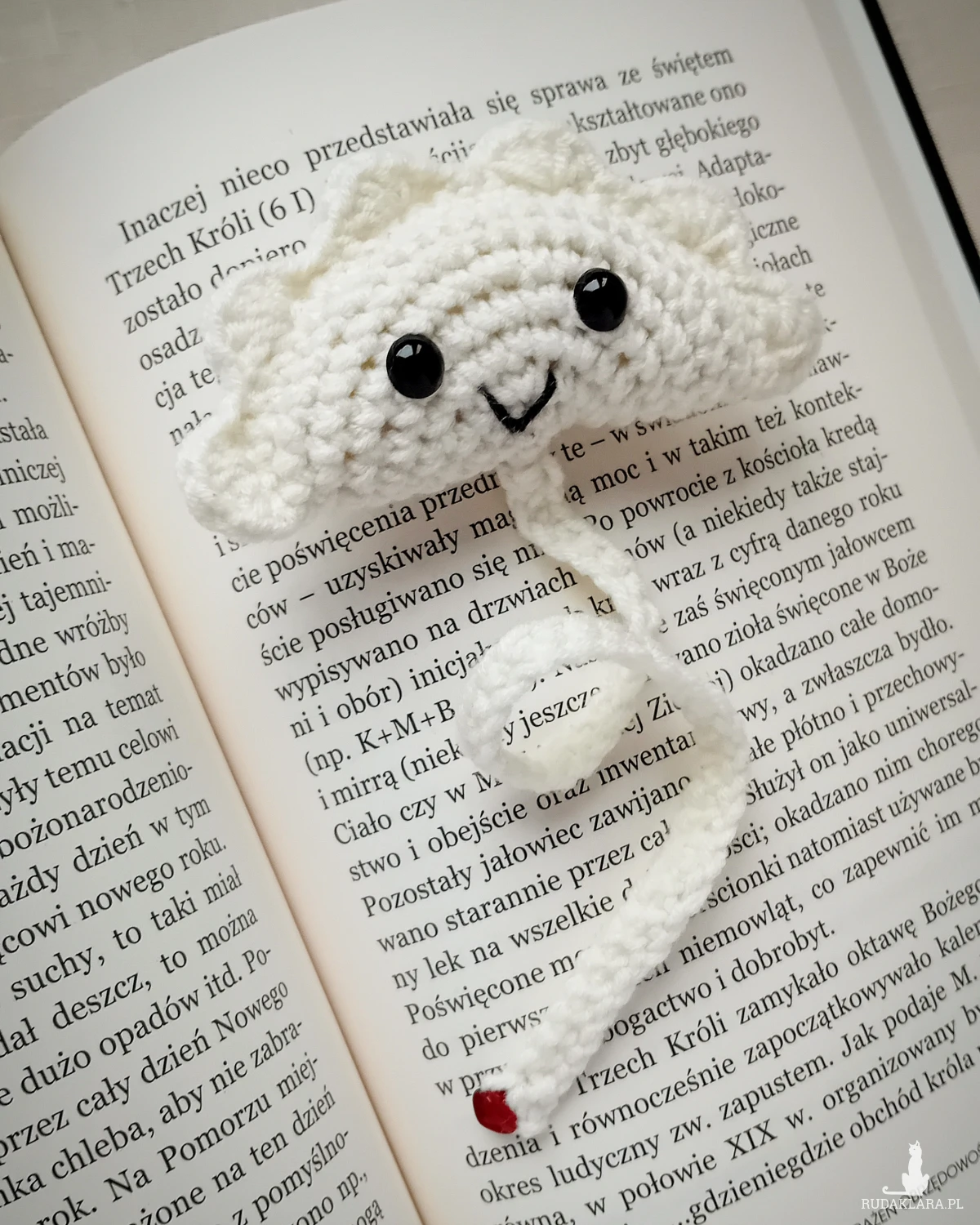 Pierożki wykonałam na szydełku, buźka jest przyszyta, a plastikowe oczka są zabezpieczone w środku przed wypadnięciem. Sznureczek przechodzący przez książkę jest dość elastyczny i rozciąga się od 22 do 28 cm, więc dopasuje się do różnych rozmiarów książek. Sznureczek jest zakończony kolorowym koralikiem.