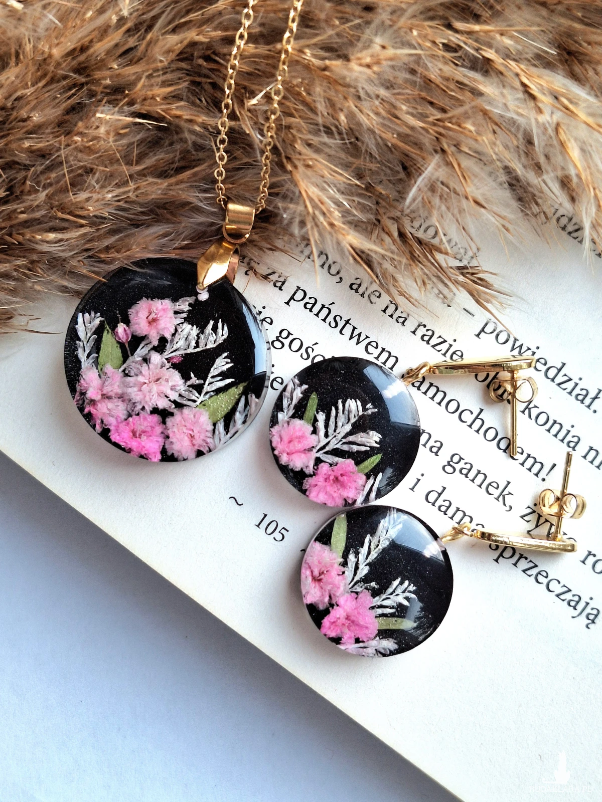 Uroczy wisiorek z zatopionymi kwiatami gipsówki na czarnym brokatowym tle. Wykonany z wysokiej klasy żywicy, która nie zmienia koloru pod wpływem promieniowania uv oraz wysokiej jakości stali chirurgicznej.