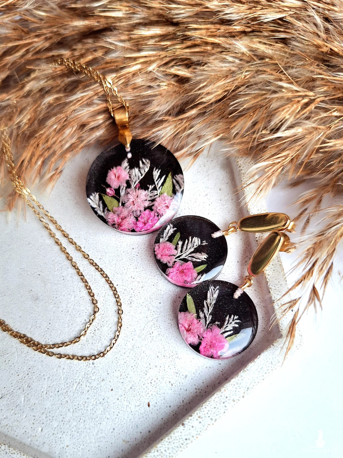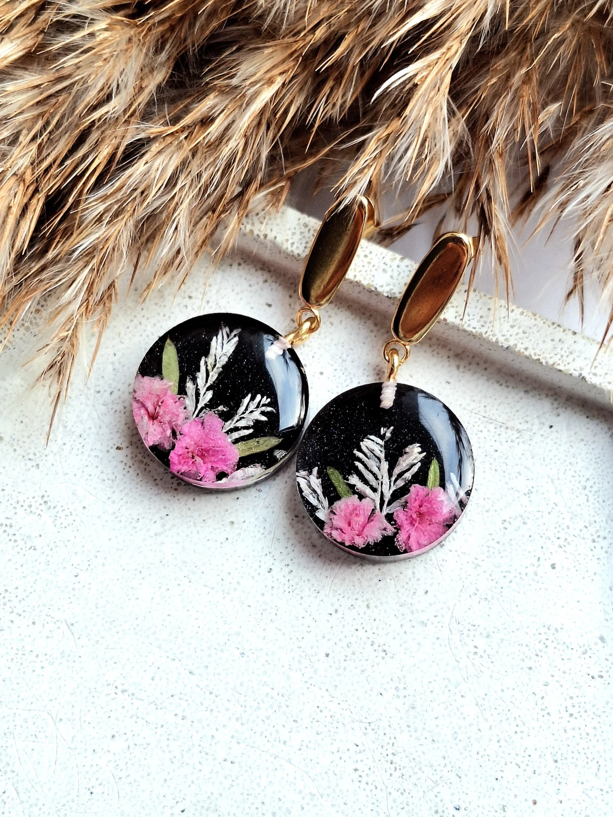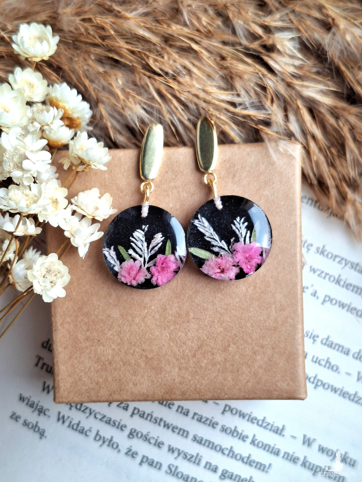 Urocze kolczyki z zatopionymi kwiatami rożowej gipsówki na czarnym brokatowym tle. Wykonane z wysokiej klasy żywicy, która nie zmienia koloru pod wpływem promieniowania UV oraz wysokiej jakości stali chirurgicznej.