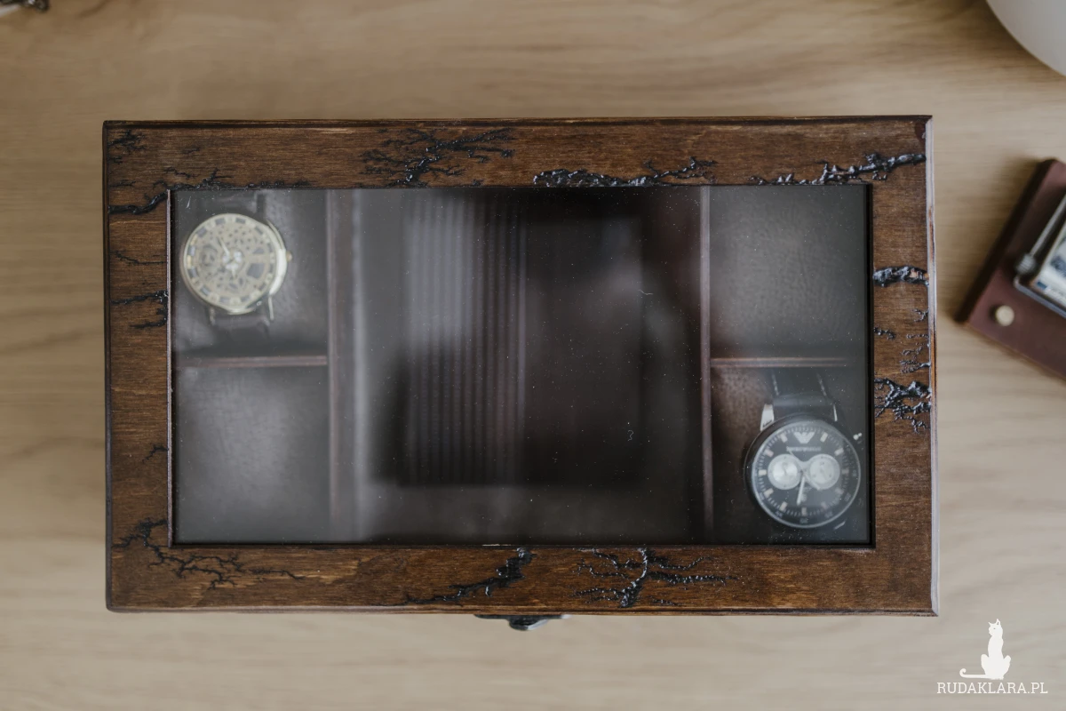 Każde pudełko  jest zaprojektowane i wykonane specjalną techniką LICHTENBERG, oraz  tak, aby pasowało do dużych i małych zegarków,bransoletek  i nie tylko. Poduszki w zestawie są czarne, Takie jak na zdjęciu można kupić na moim sklepie.