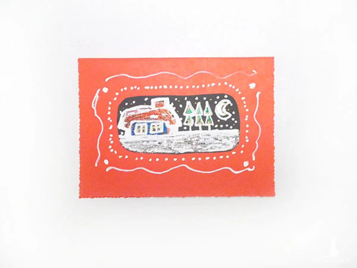 Otwierana, oryginalna kartka z okazji świąt Bożego Narodzenia i Nowego Roku, ręcznie rysowana, zdobiona brokatem. Karnet jest bez życzeń. Dołączona biała koperta.