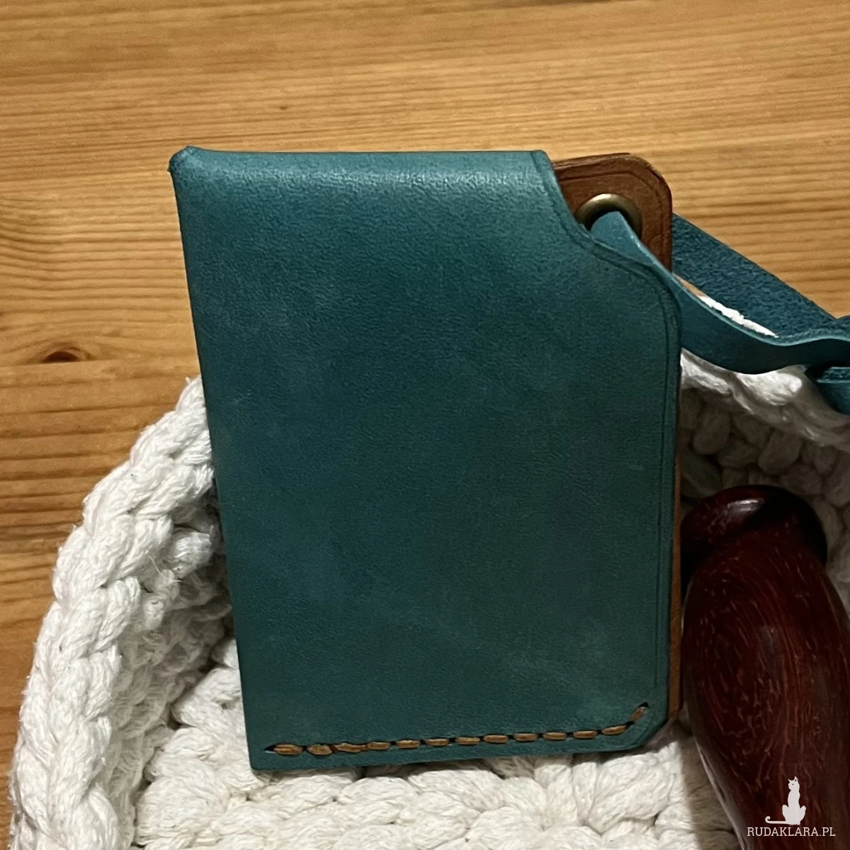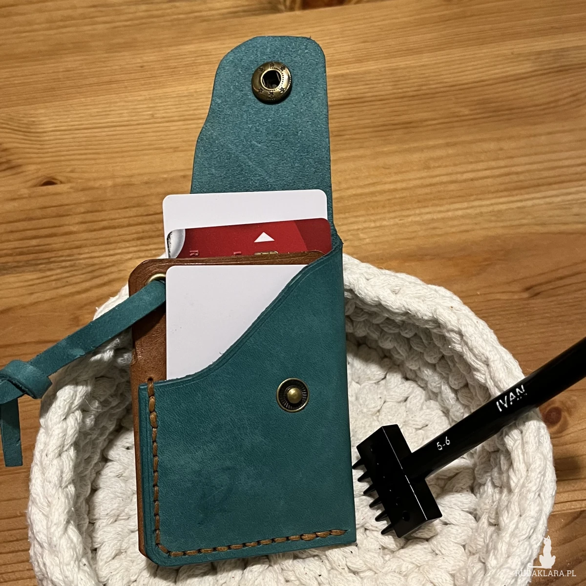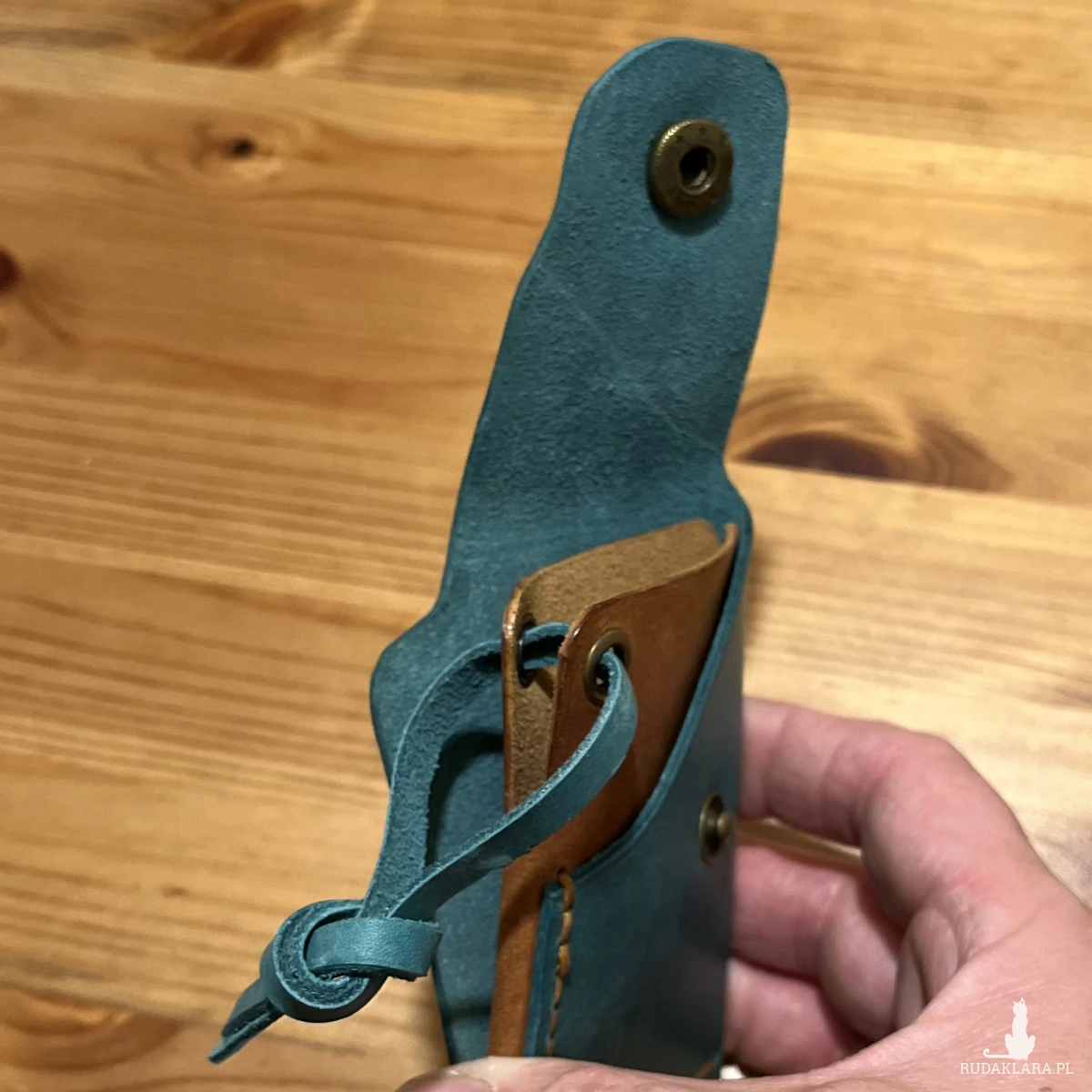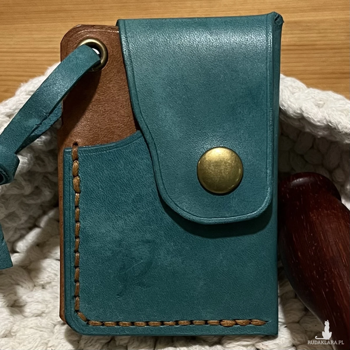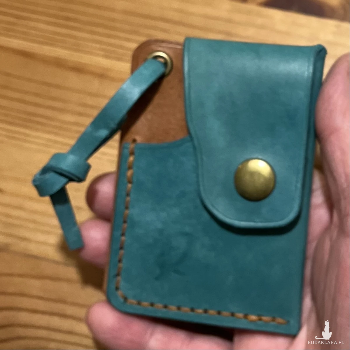 Minimalistyczny portfel skórzany ręcznie uszyty w kolorze turkusowo brązowym na karty.