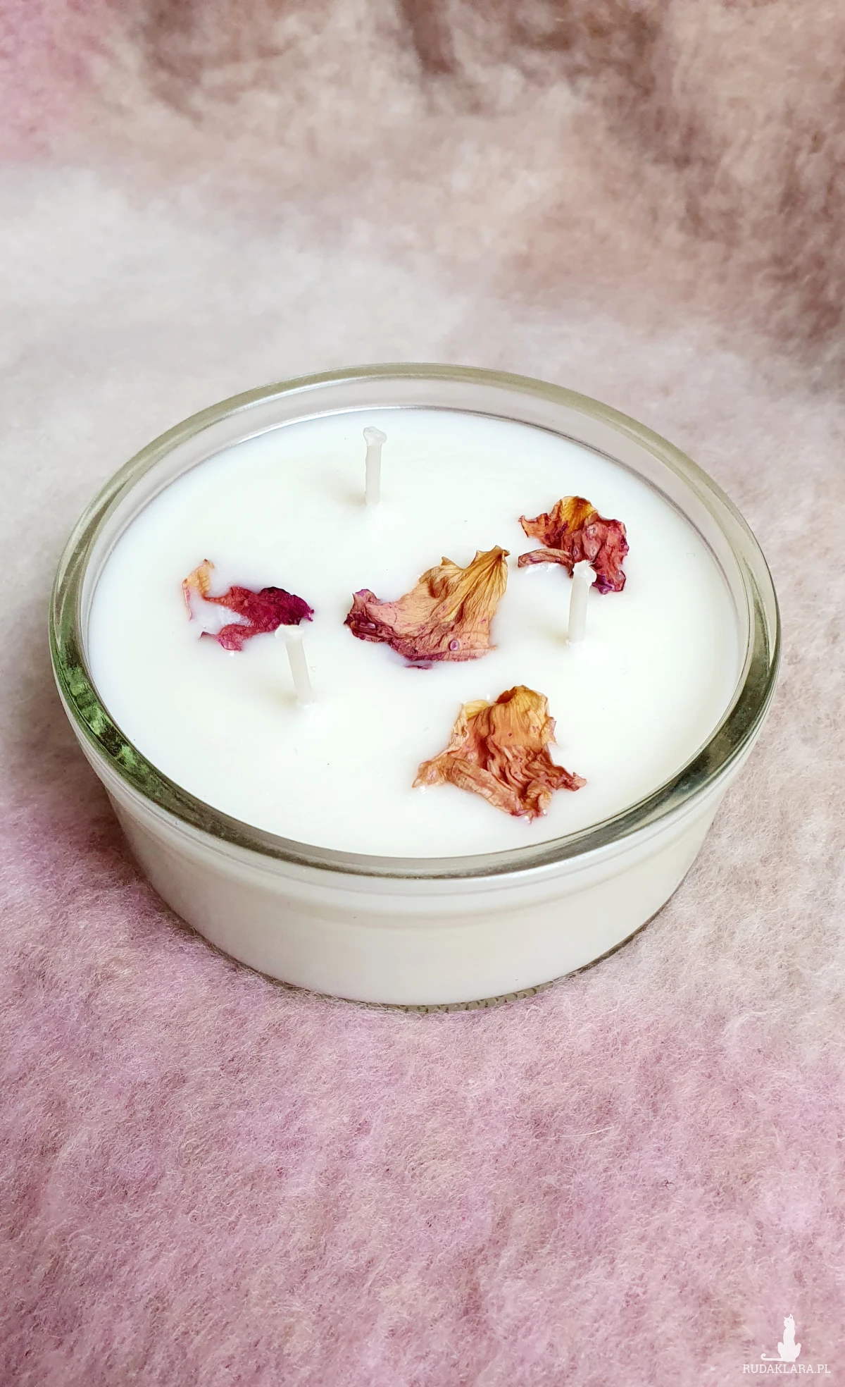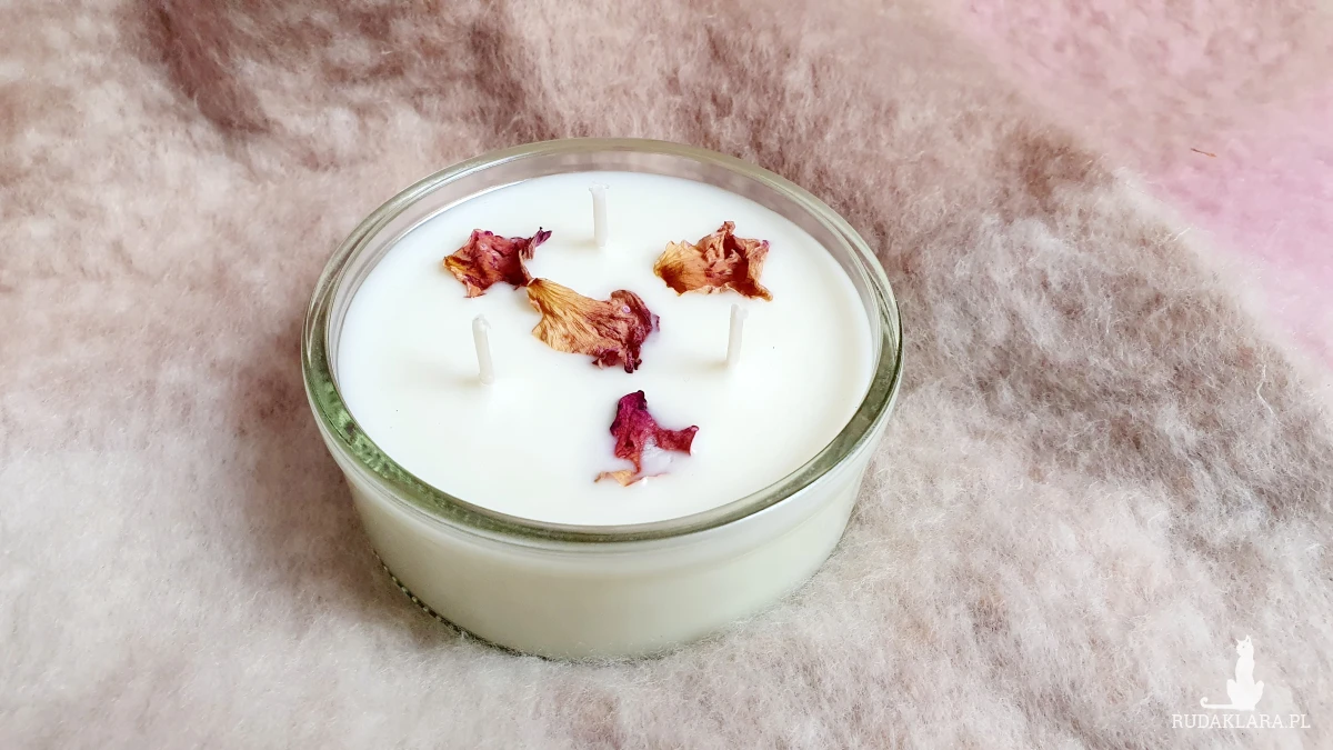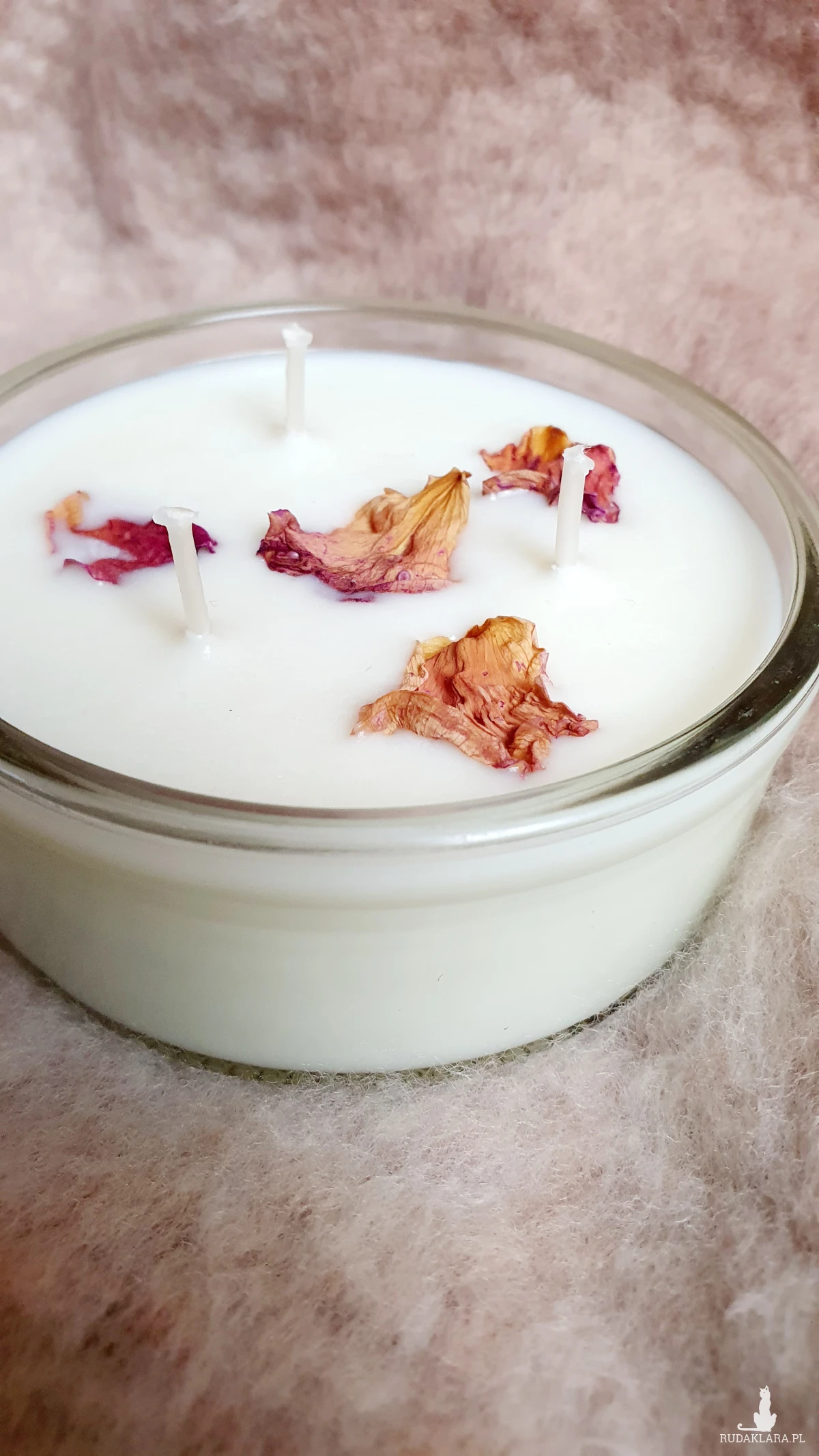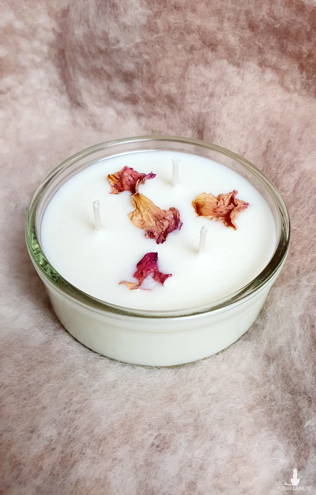 Świeca sojowa wykonana ze 100% wosku sojowego z dodatkiem naturalnego olejku o zapachu goździków z pomarańczą, udekorowana suszonymi płatkami róży. Lekkie nierówności na wierzchu świecy świadczą o własnoręcznym jej wykonaniu.