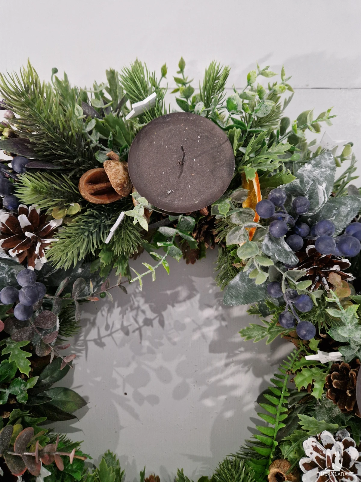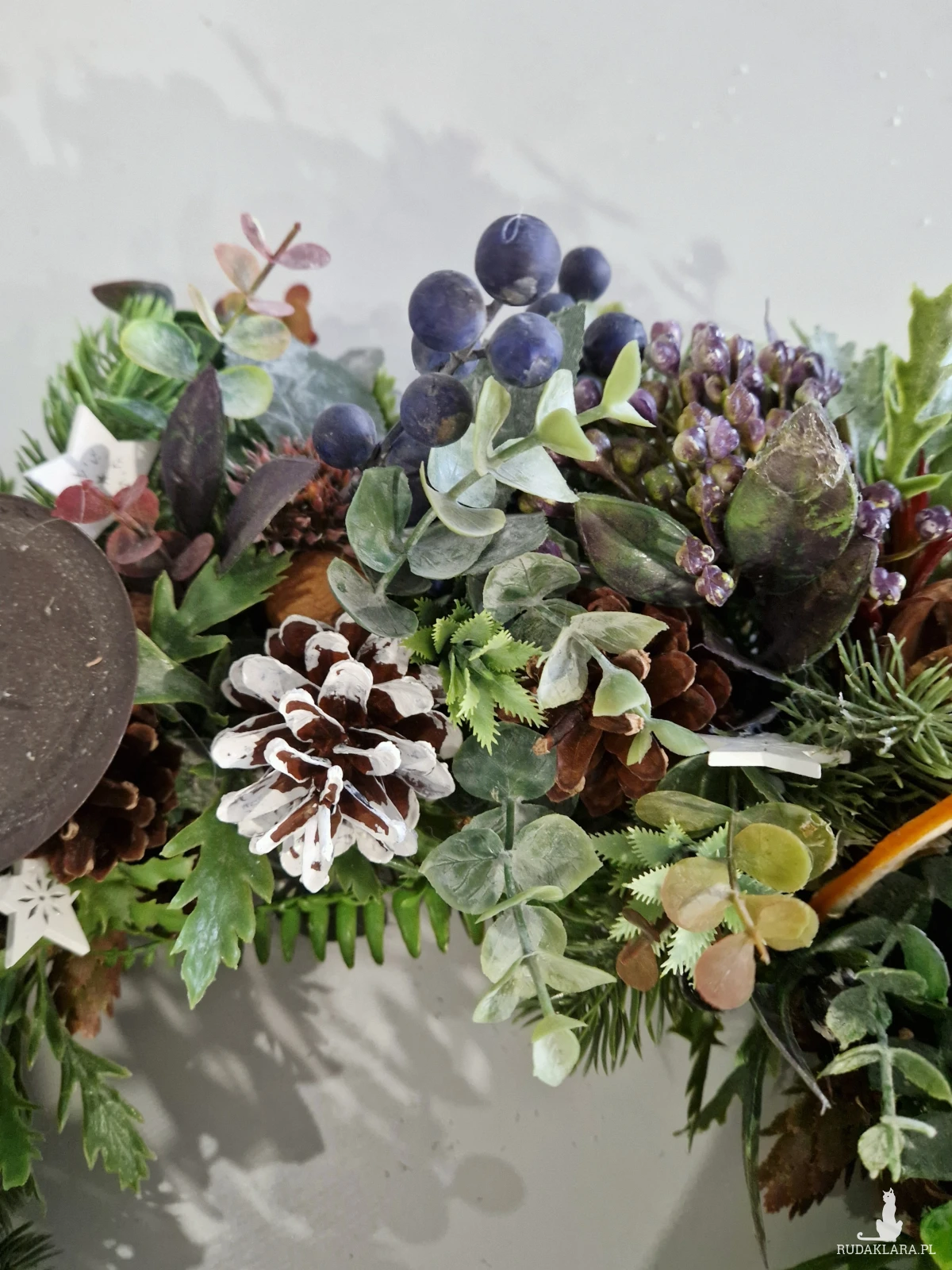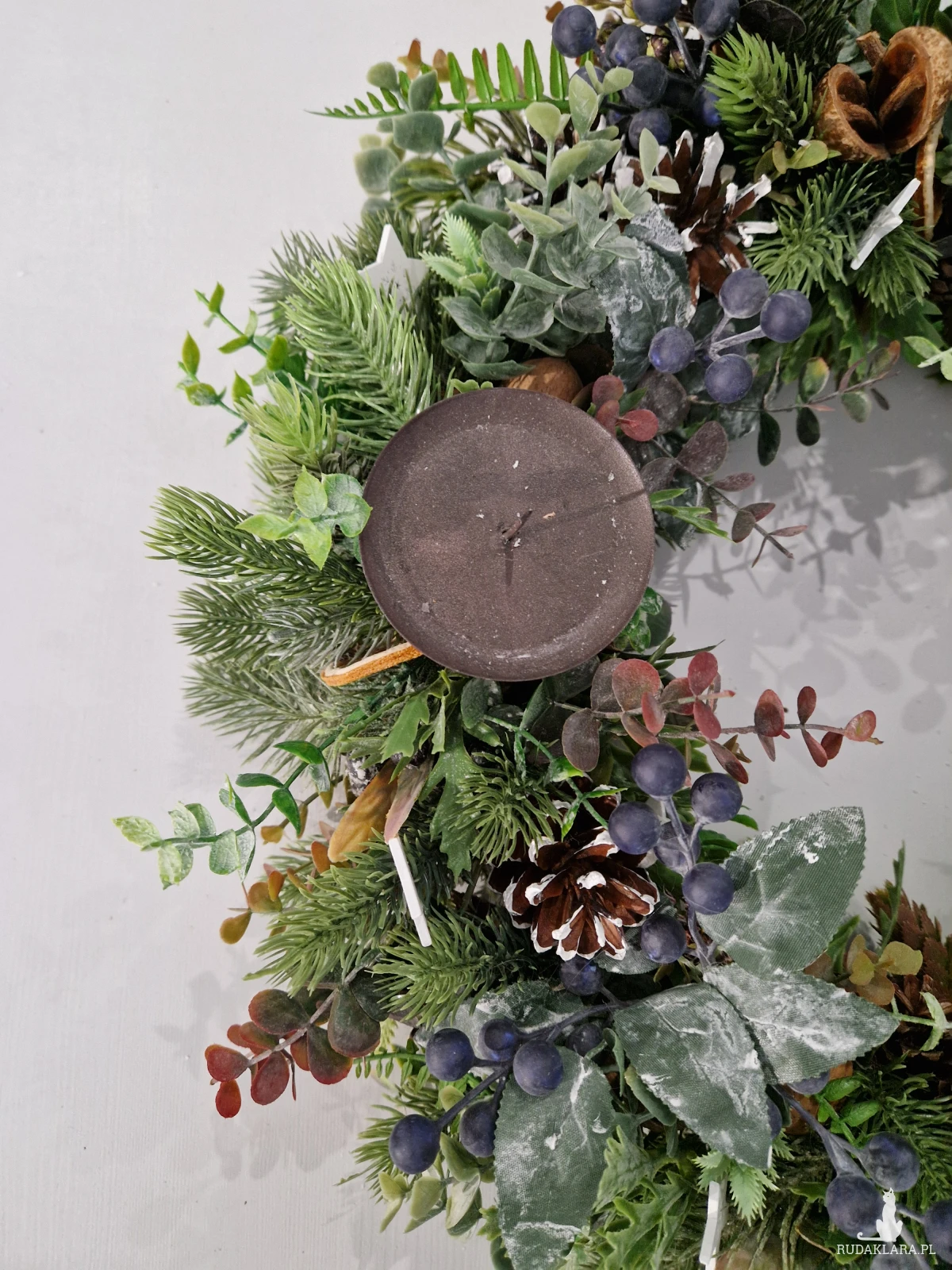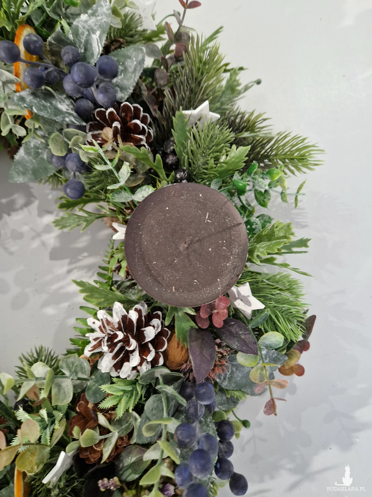 Duży, gęsty, gruby dekoracyjny wieniec na stół o średnicy ok.50 cm. Umocowano w nim 4 metalowe podkładki do świec ze szpikulcem, na który nadziewa się świece. Dzięki temu zabiegowi świeca nie spadnie na stół. Silikonowe różne gałązki, niektóre jakby oszronione, posypane puchem śnieżny, naturalne pobielone szyszki, egzotyczny susz i białe drewniane gwiazdki. Ciekawa, unikatowa, spokojna lecz elegancka kompozycja zimowo-świąteczna.