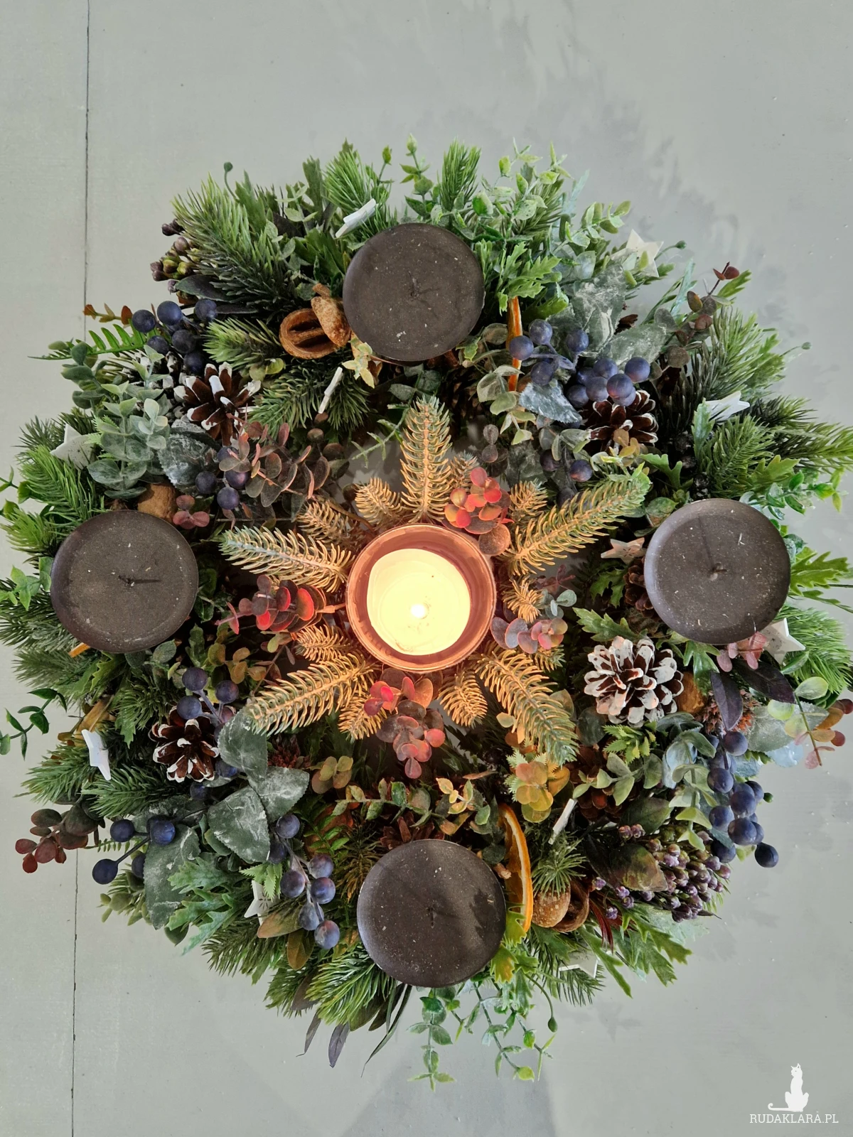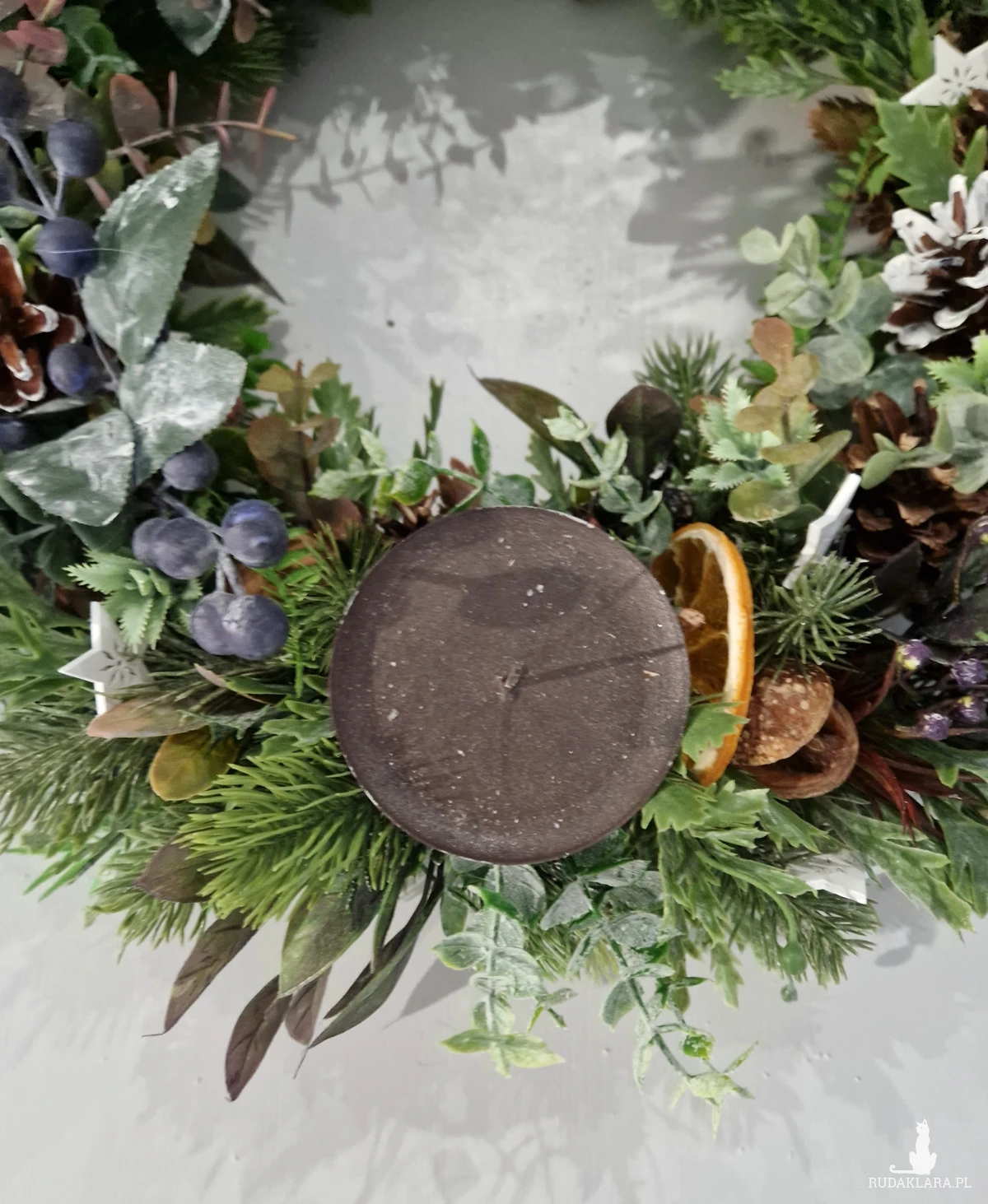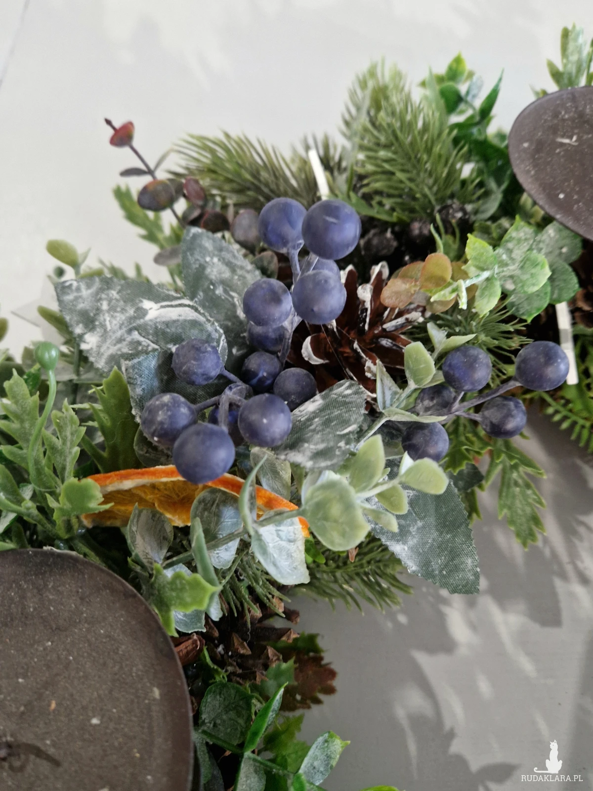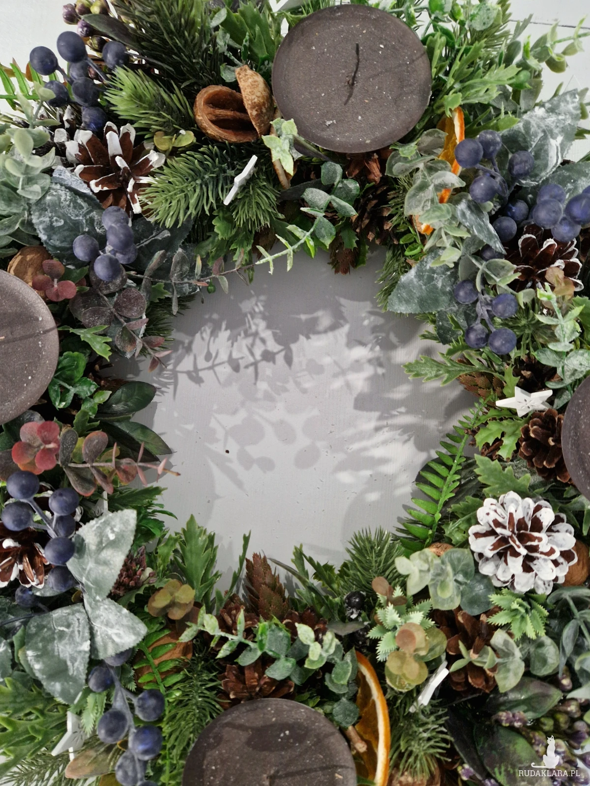 Duży, gęsty, gruby dekoracyjny wieniec na stół o średnicy ok.50 cm. Umocowano w nim 4 metalowe podkładki do świec ze szpikulcem, na który nadziewa się świece. Dzięki temu zabiegowi świeca nie spadnie na stół. Silikonowe różne gałązki, niektóre jakby oszronione, posypane puchem śnieżny, naturalne pobielone szyszki, egzotyczny susz i białe drewniane gwiazdki. Ciekawa, unikatowa, spokojna lecz elegancka kompozycja zimowo-świąteczna.