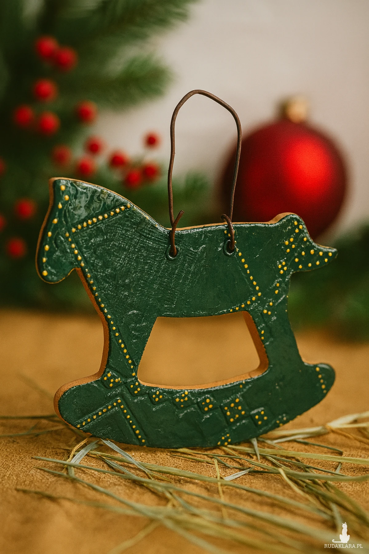 Zawieszka w kształcie konika na biegunach została ulepiona z gliny samoutwardzalnej. Pomalowana farbami do ceramiki, postarzana, zabezpieczona lakierem z połyskiem. Doskonała ozdoba domu w stylu vintage, rustykalnym.