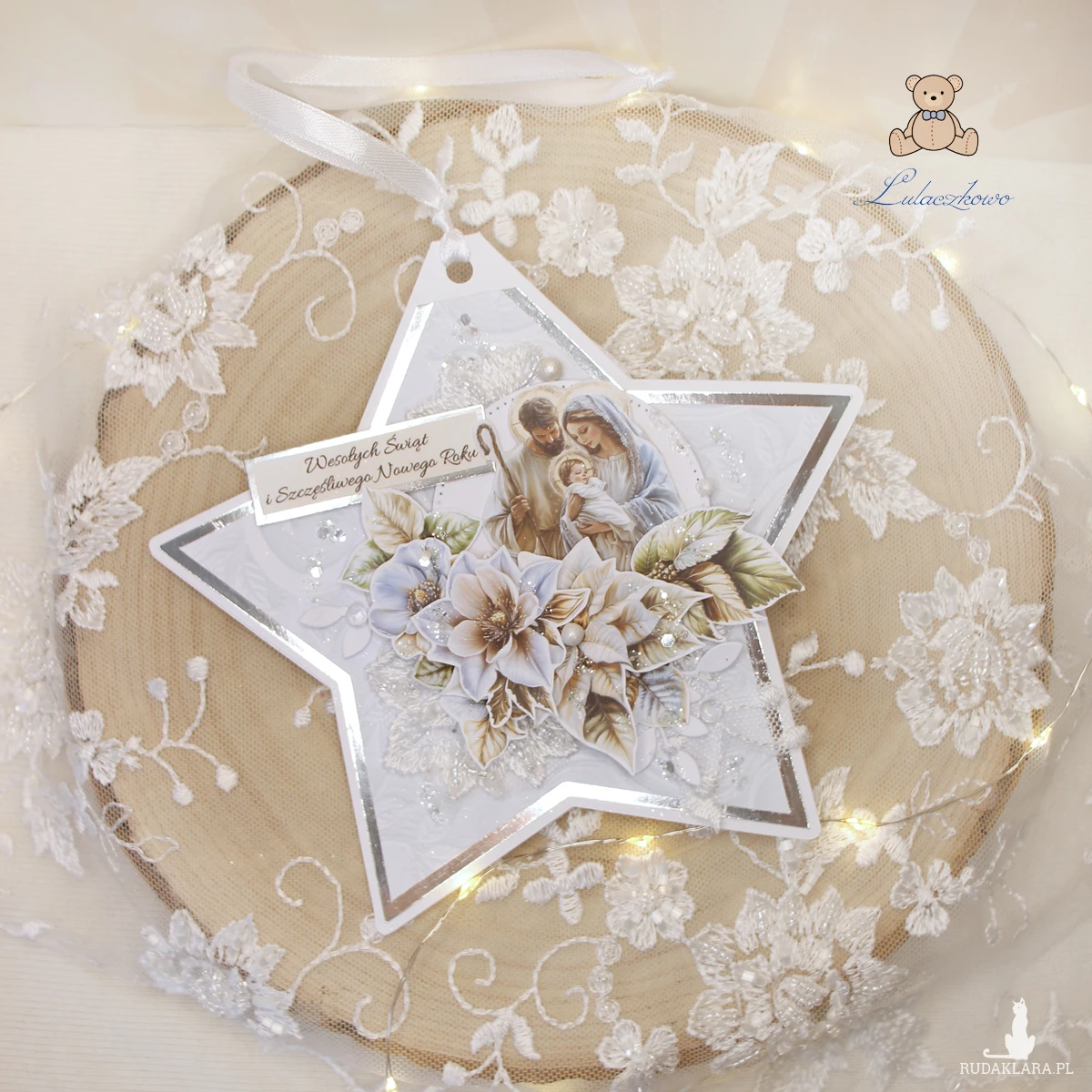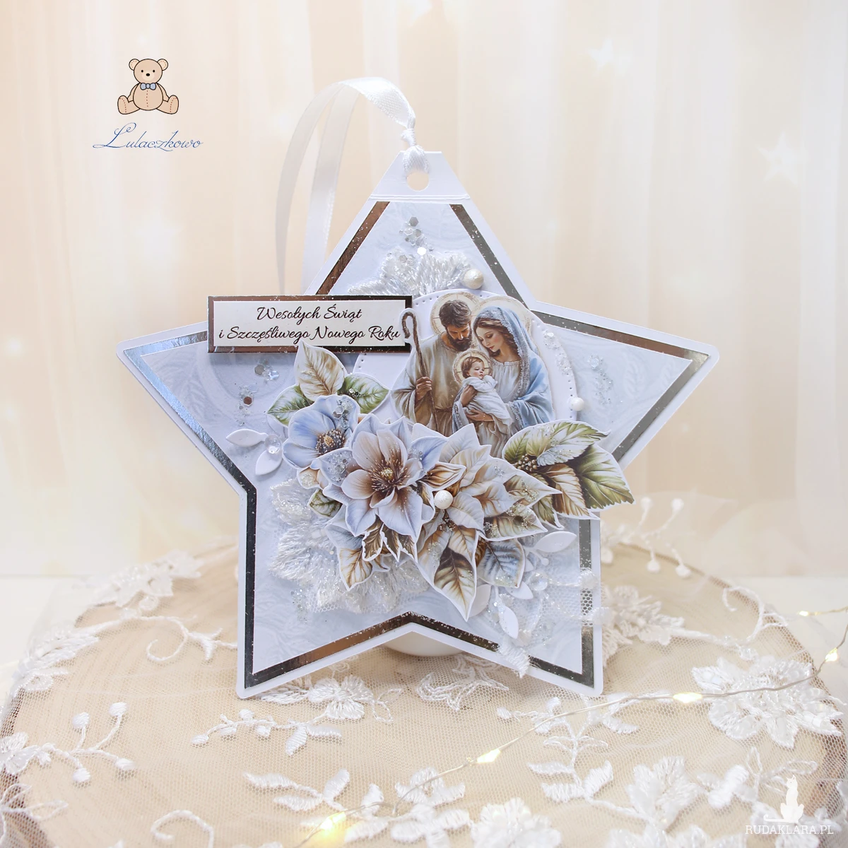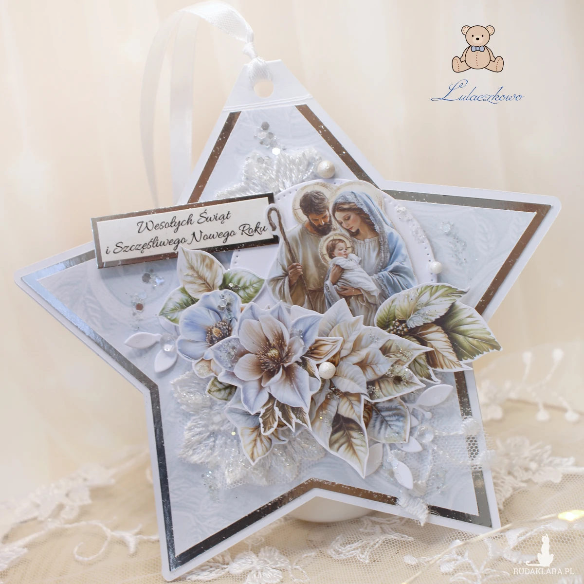 Przepiękna kartka na Boże Narodzenie w kształcie gwiazdki i w formie zawieszki/bombki na choinkę, wykonana ręcznie, techniką scrapbookingu, z dbałością o każdy szczegół. Gwiazdka z motywem religijnym, świętą rodziną, delikatnie ozdobiona połyskującymi kryształkami, grafikami kwiatowymi, błyszczącym papierem lustrzanym oraz napisem "Wesołych Świąt i Szczęśliwego Nowego Roku". Elementy są klejone warstwowo, dzięki czemu kartka daje lekki efekt 3D,