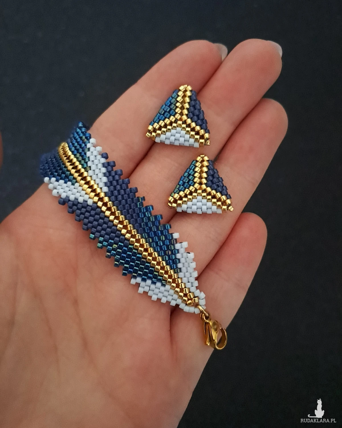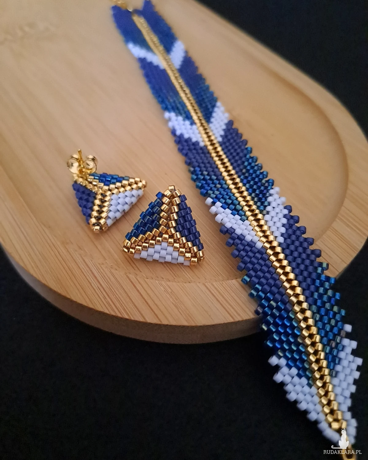Bransoletka z tego zestawu to prawdziwe dzieło sztuki. Jej szerokość 1,8 cm i klasyczny, geometryczny wzór, w którym przeplatają się trzy odcienie niebieskiego ze złotymi akcentami, nadają jej luksusowego charakteru. Starannie wykonana, pasuje zarówno do wieczorowych sukni, jak i do eleganckich stylizacji biurowych. To biżuteria, która dodaje szyku i wyróżnia się na tle innych dodatków, przyciągając spojrzenia swoją wyjątkową harmonią i blaskiem.