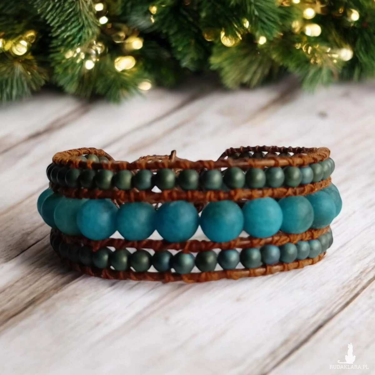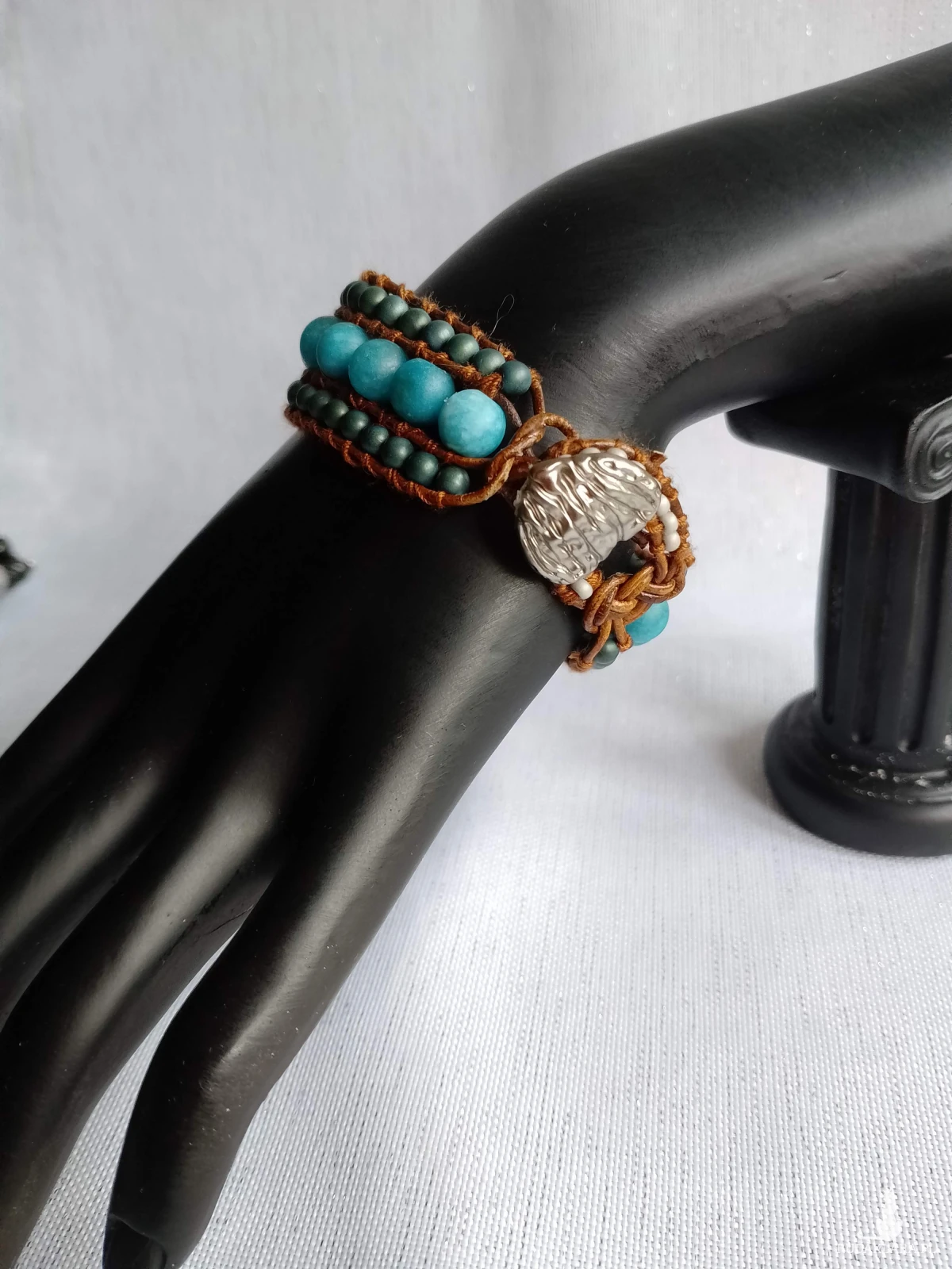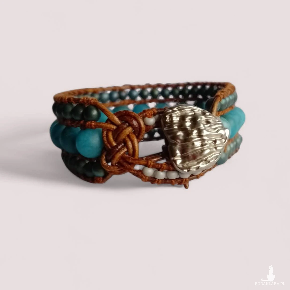 Bransoletka w stylu boho wykonana z 8 mm kulek jadeitowych i 4 mm kulek hematytu naszytych na rzemyk ze naturalnej skóry, zapinana na ozdobny guzik w kolorze srebrnym. Długość 20 cm, szerokość 2 cm.