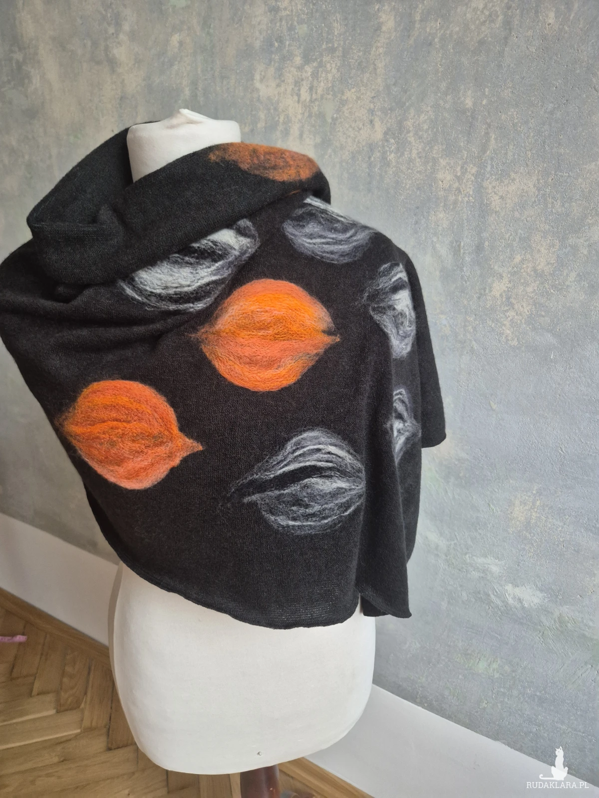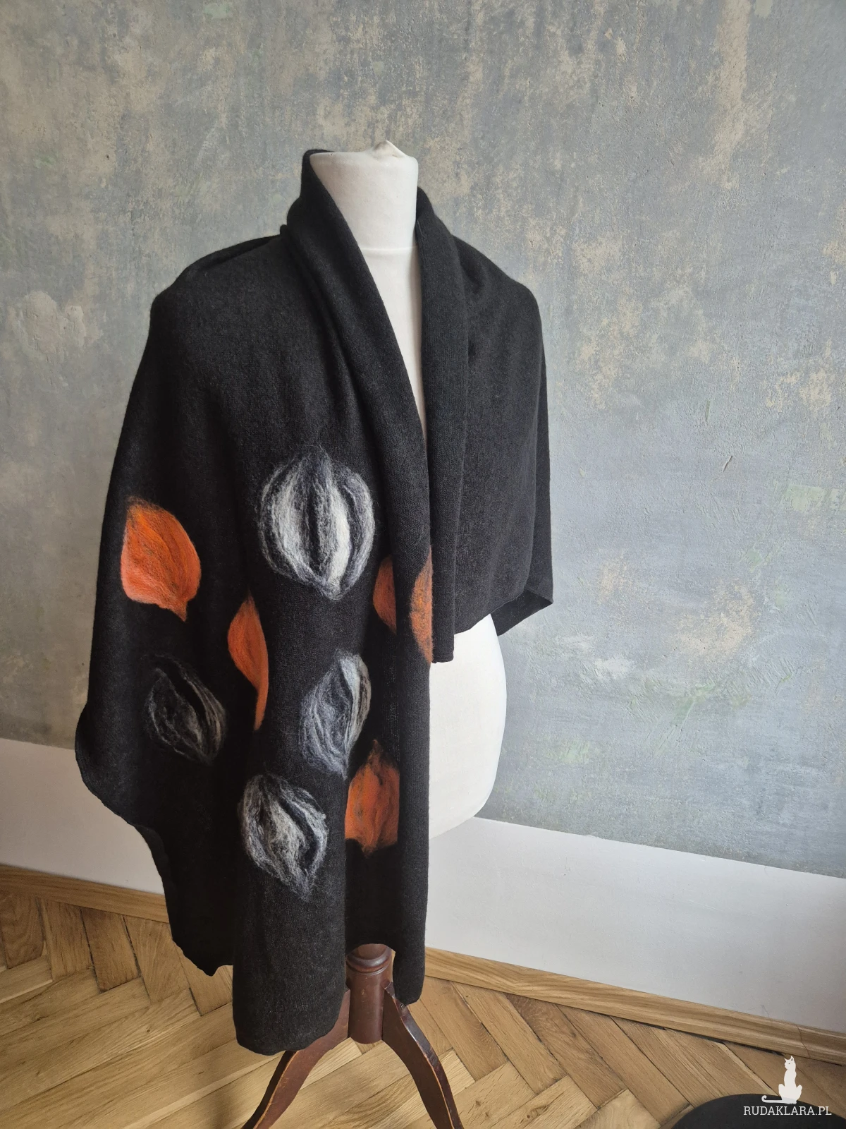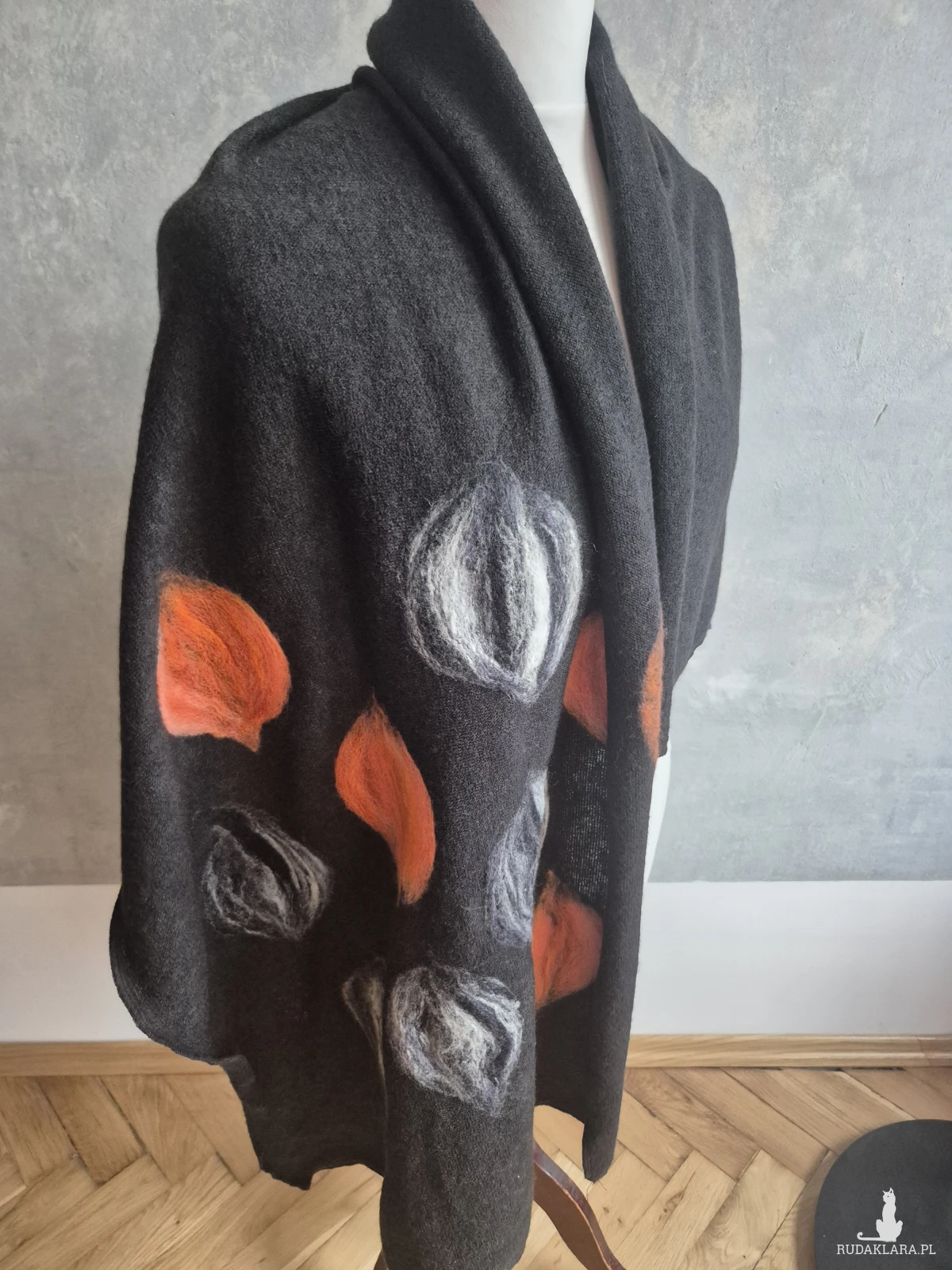 Czarny szal damski zimowy z wełną merynosów handmade- komin ciepły długi szyty z dzianiny swetrowej, filcowany wełną merynosów, doskonały na codzienne noszenia jak i na prezent, robi wrażenie, szerokość 67cm, długość 159 cm, możliwość zamówienia aplikacji w innym kolorze, polecam czas oczekiwania 1,5 tyg ,jestem producentem tegonproduktu,jest on w pelni bezpieczny,box a1