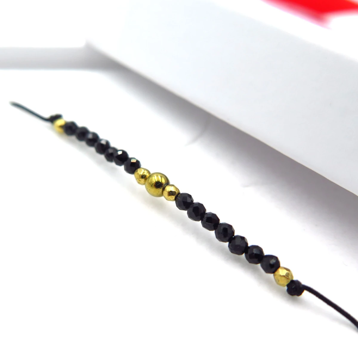 BLACK TURMALINE SHIELD to minimalistyczna bransoletka z czarnym turmalinem, zapewniającym ochronę energetyczną i wewnętrzną harmonię. Centralna złota kulka hematytu dodaje elegancji i wzmacnia poczucie równowagi. Regulowany sznurek sprawia, że jest idealnym prezentem dla każdego – od dziecka po dorosłego.